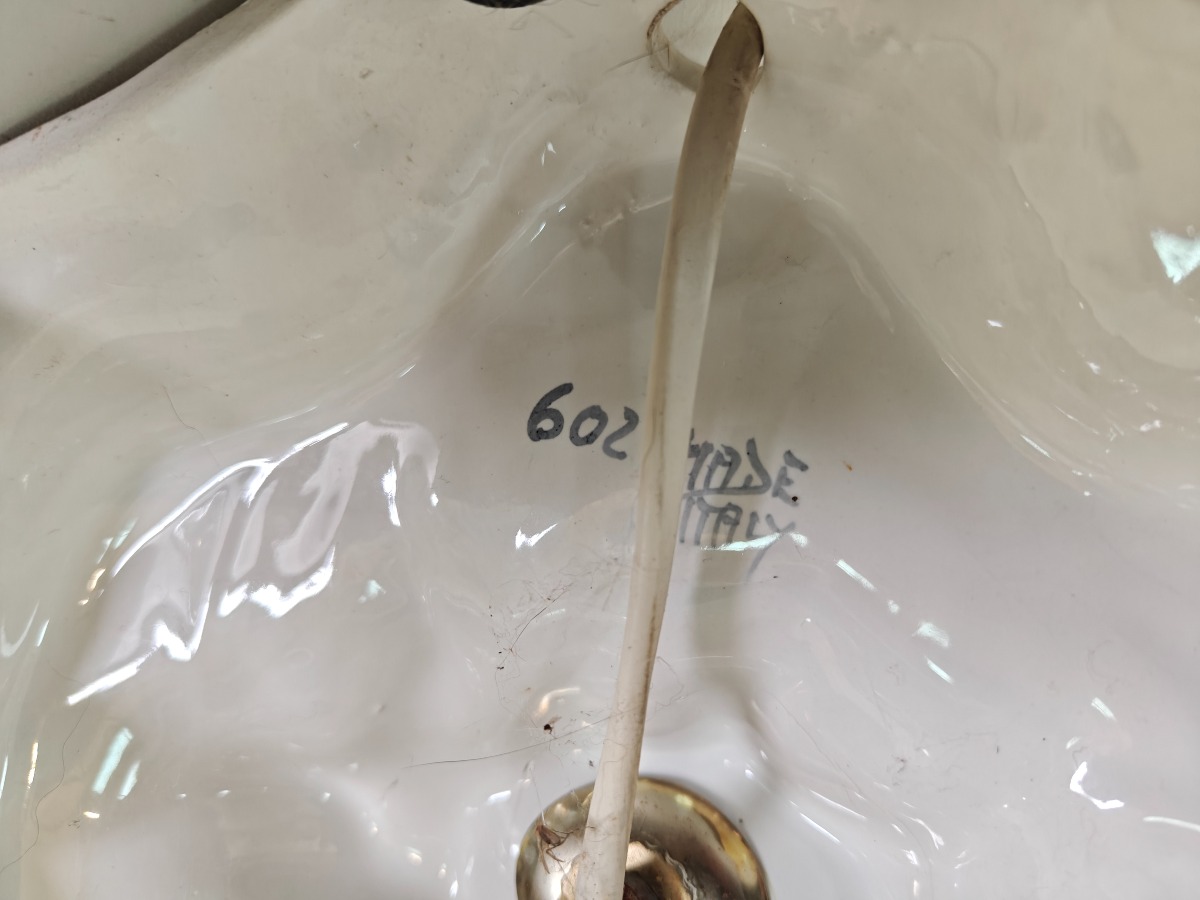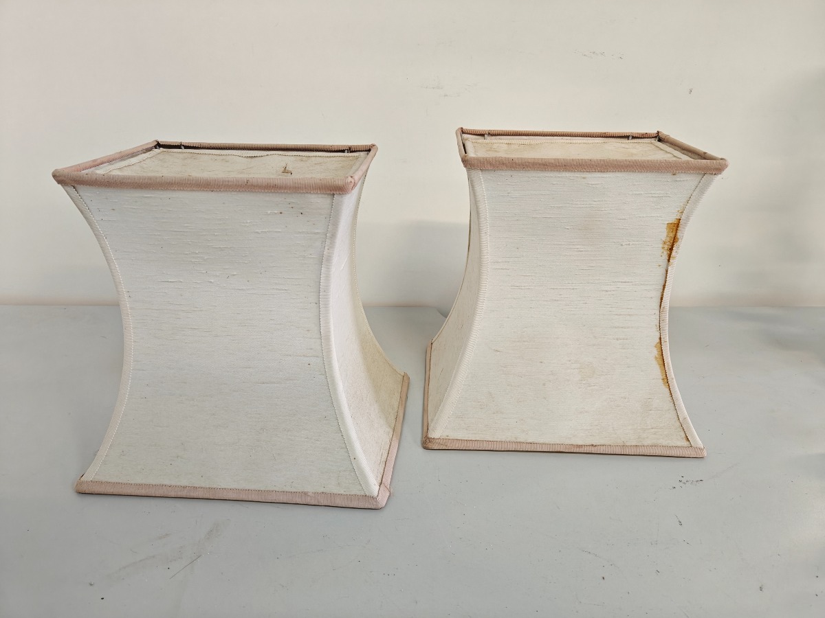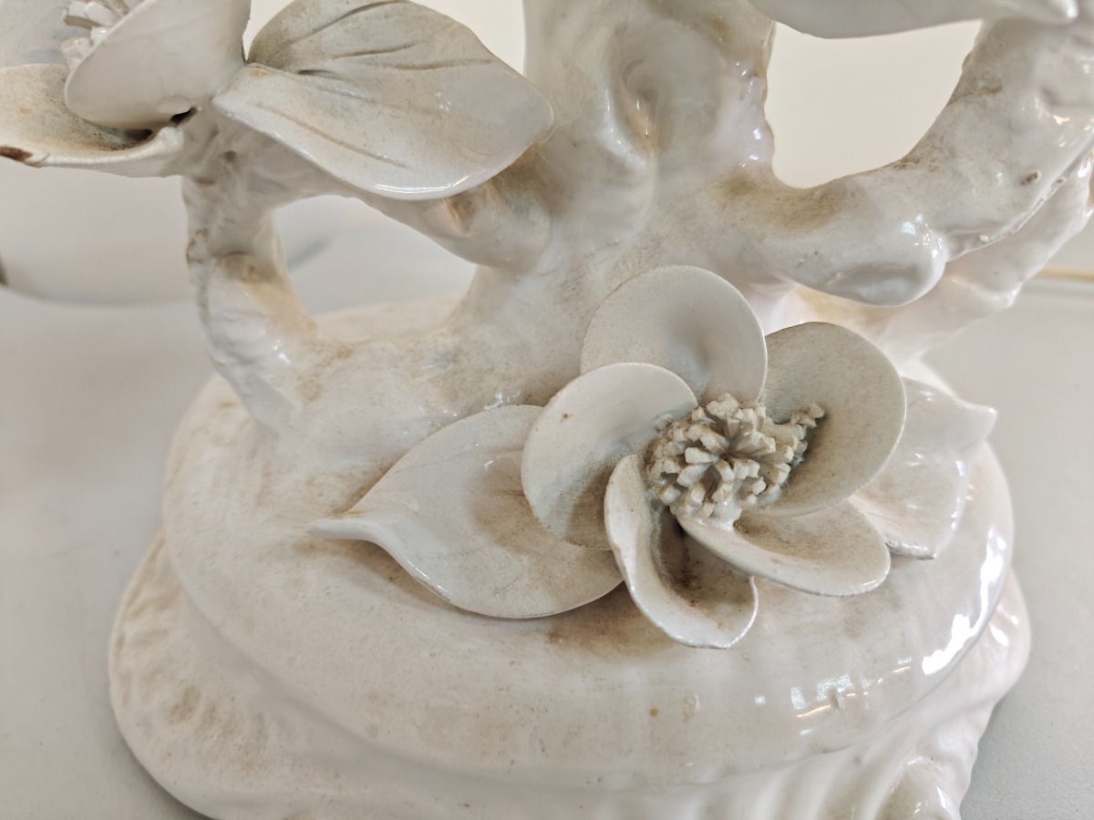 2 bordlamper i form af gren med fugle og blomster. Sandsynligvis fra Erama, Italien. Mindre afslag forekommer. Ledninger bør efterses da der er spor efter gnavere. H. 40 cm. 2 pagodeformede skærme medfølger. Disse også med smuds.