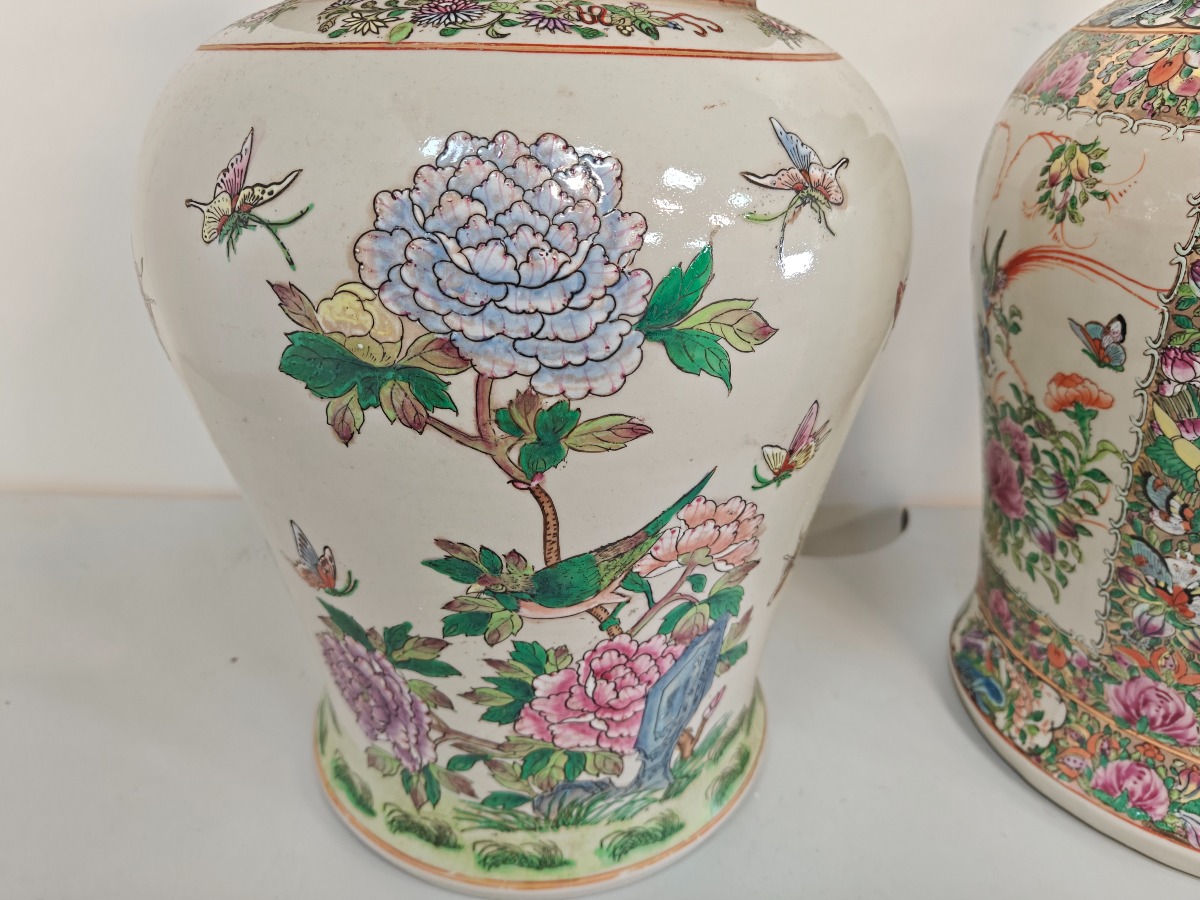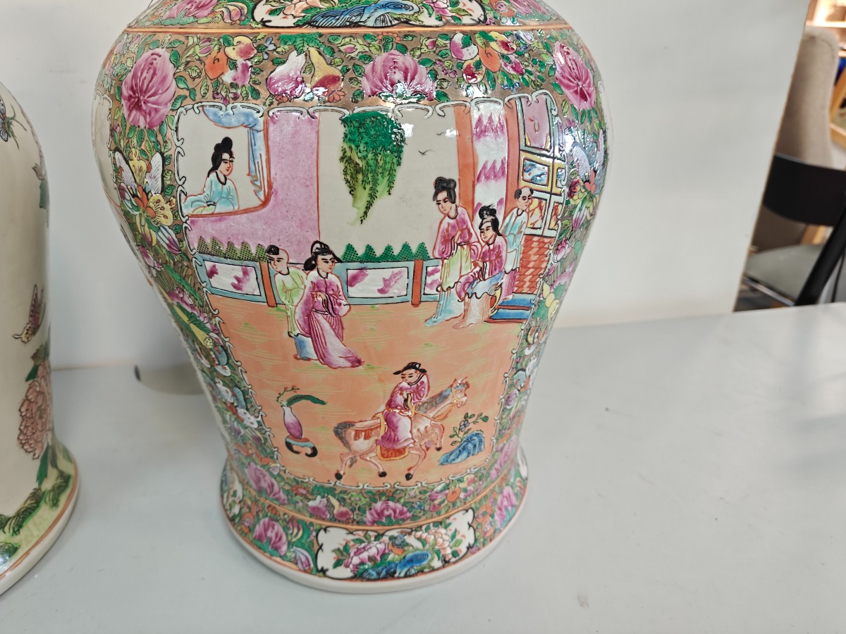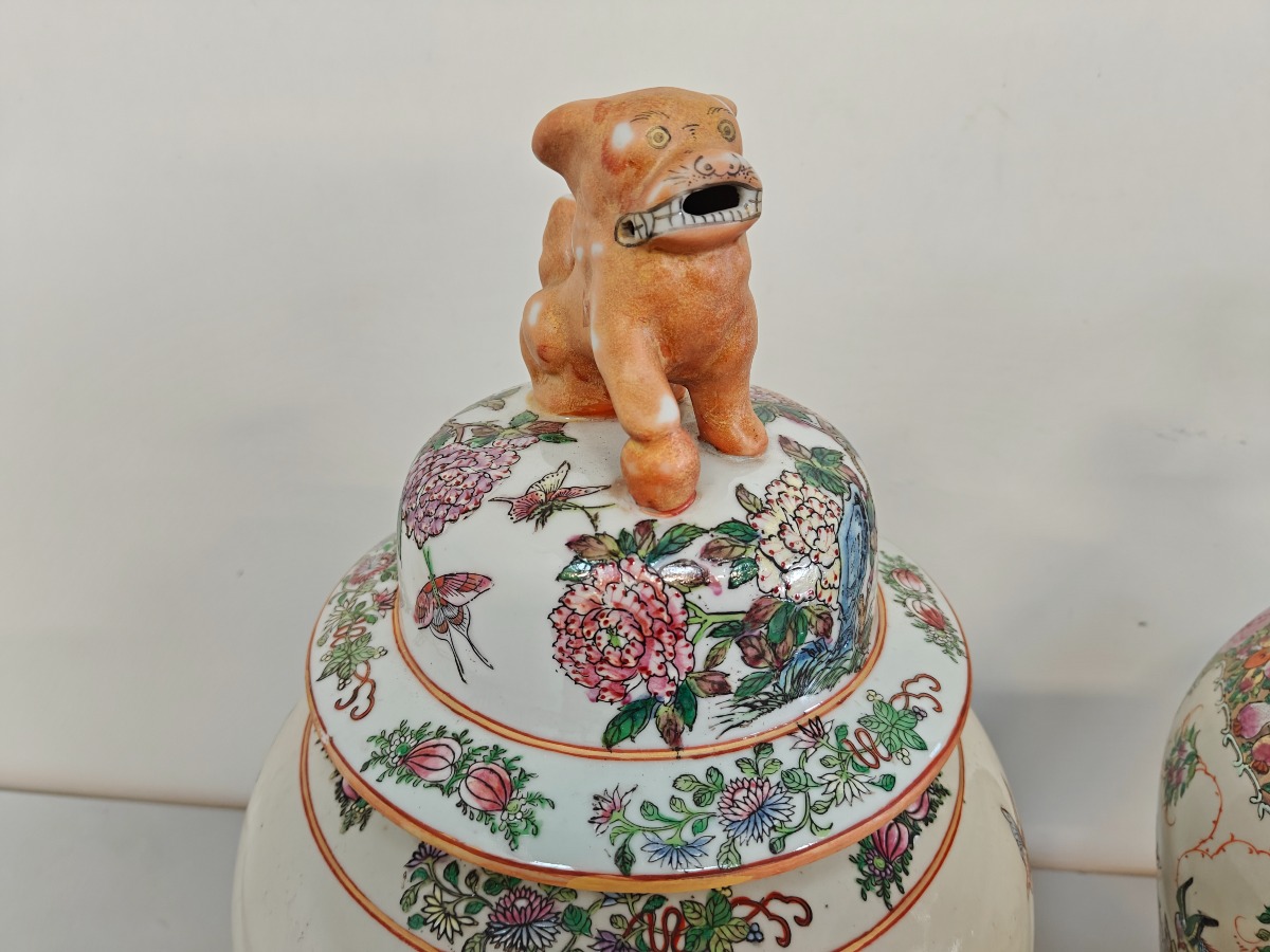2 store lågkrukker med kinesiske motiver. Begge med hanløve på låg.