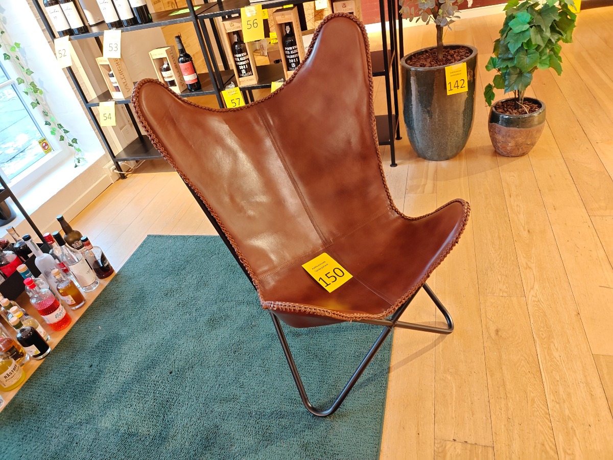 Butterfly-stol på mørklakeret stålstel. Sæde af cognacfarvet kernelæder.