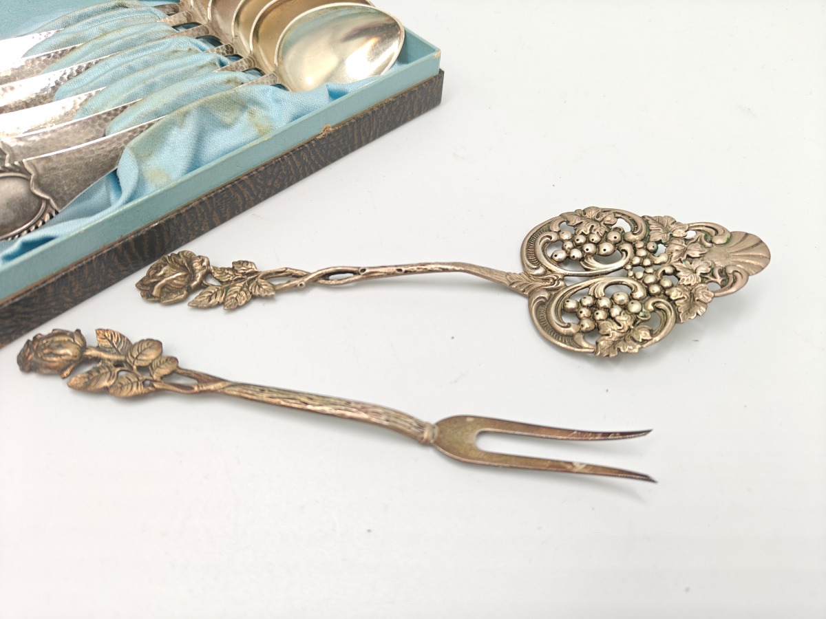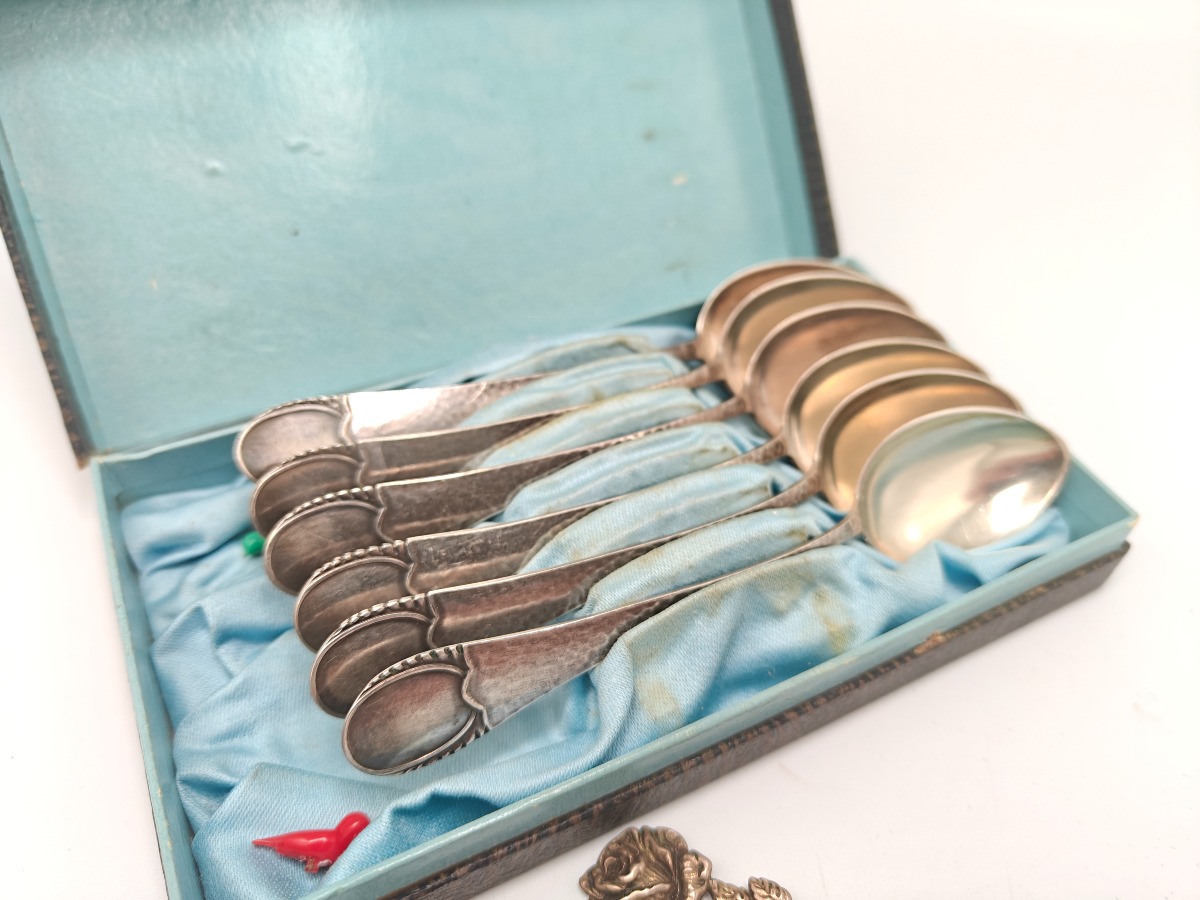 Æske med 6 skeer af sølv samt 2 andre ta'ting