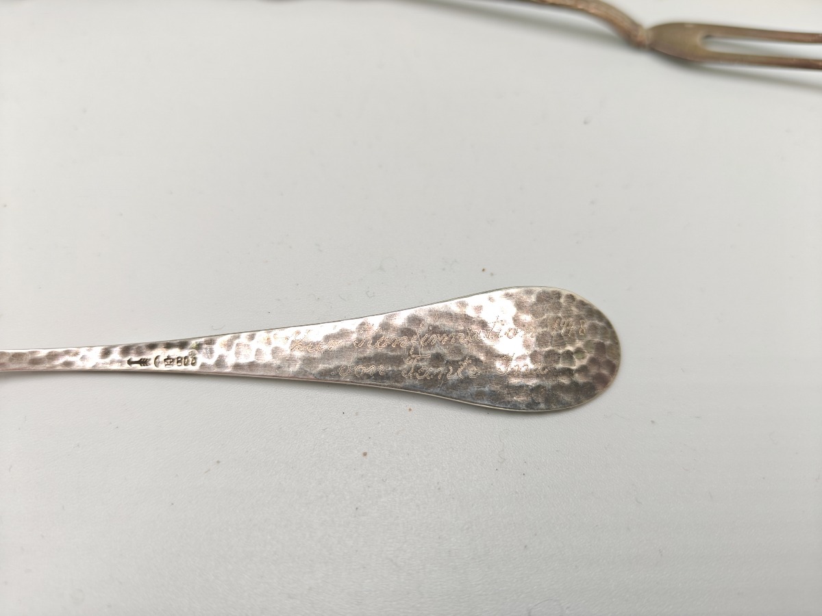 Æske med 6 skeer af sølv. Lødighed 800. Vægt 92 g. Indskription bagpå " Zur Konfirmation 1948 vom Tante Ina" Indskriptionen er ikke specielt tydelig. samt 2 andre ta'ting af sølv, lødighed 835. Vægt 34 g.