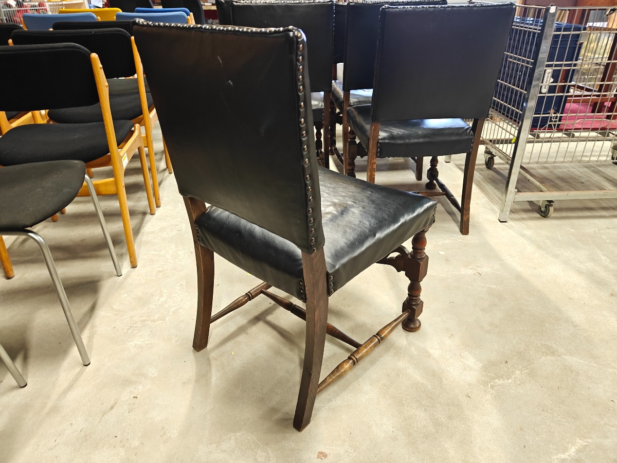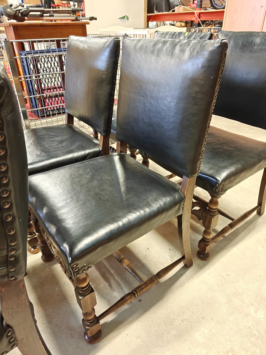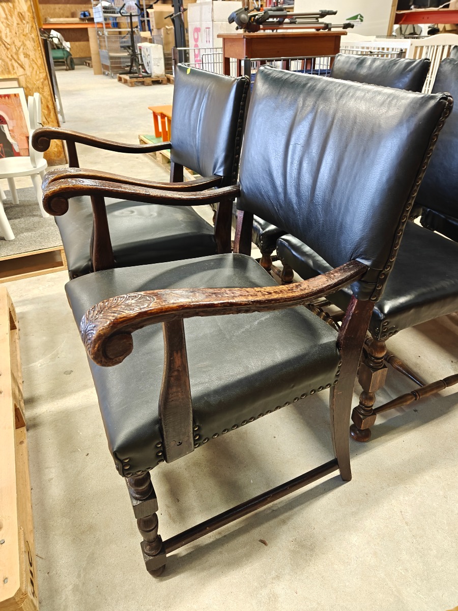 Barokform stolesæt af mørklakeret bøg. Sættet består af 2 armstole og 4 almindelioge stole. Sæde og ryg monteret med sort sømbeslået læder.