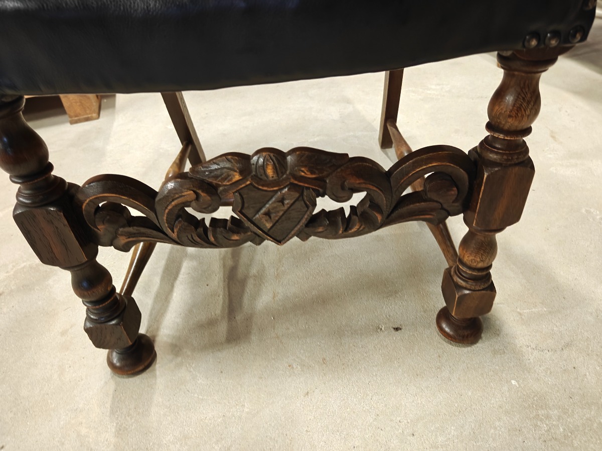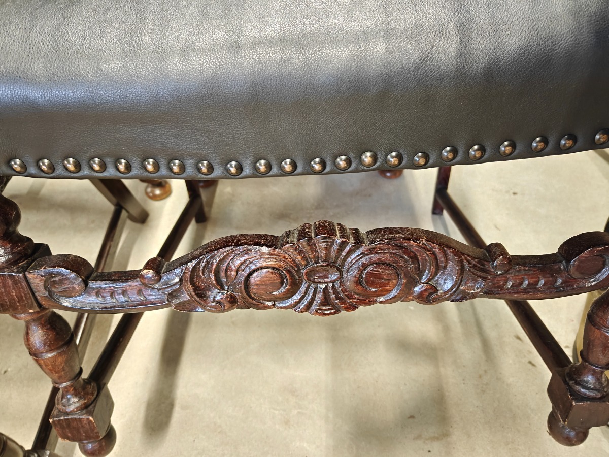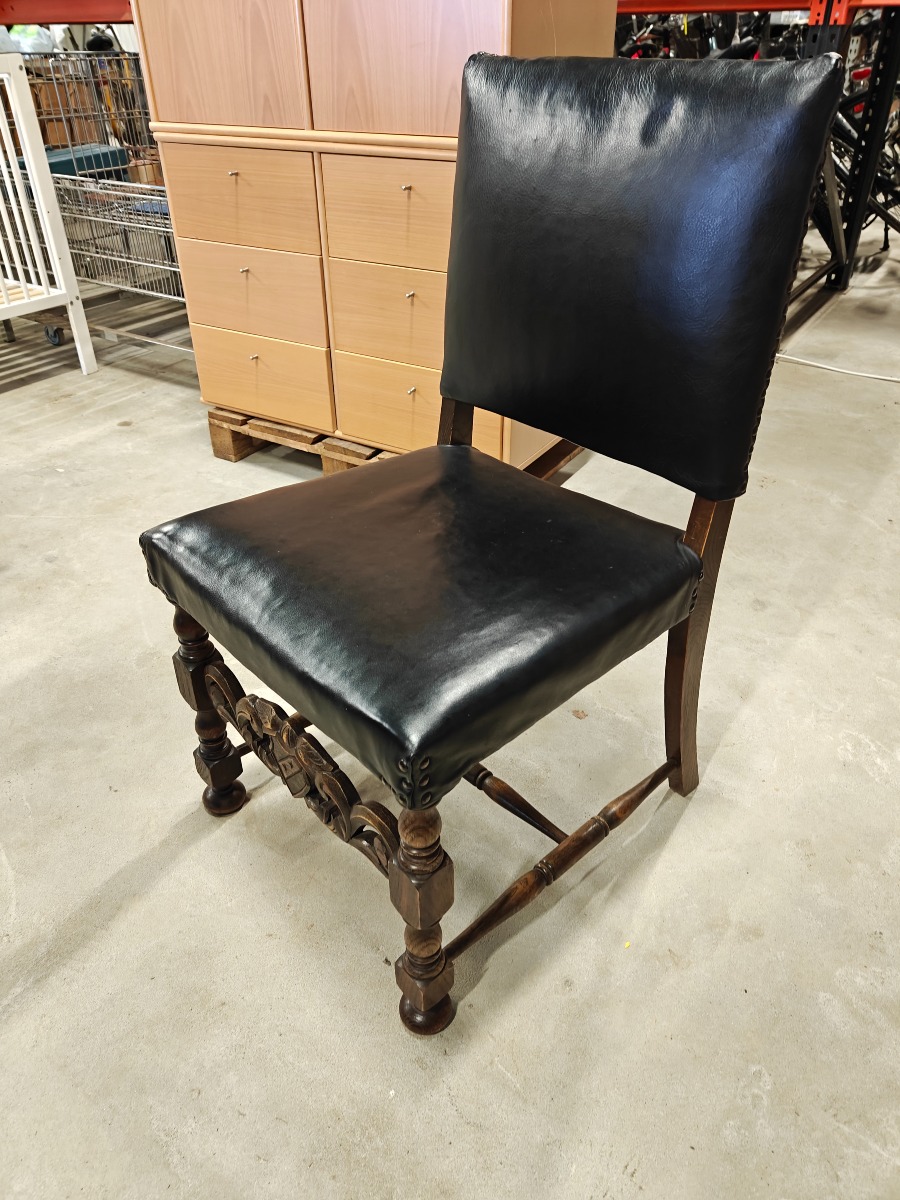 Barokform stolesæt af mørklakeret bøg. Sættet består af 2 armstole og 4 almindelioge stole. Sæde og ryg monteret med sort sømbeslået læder.