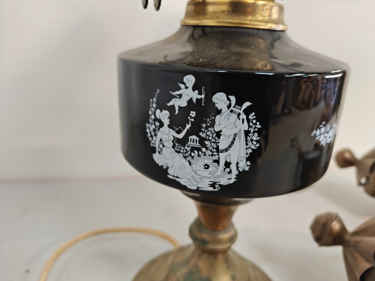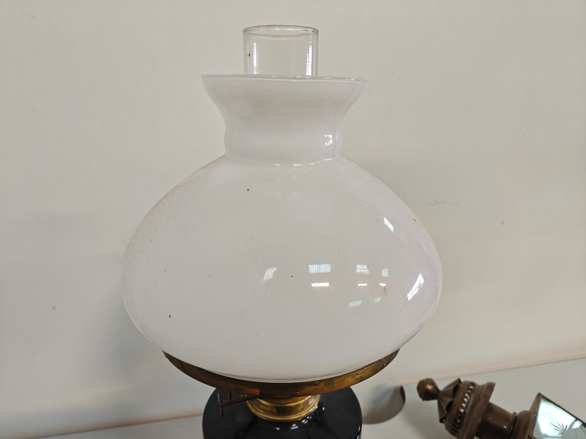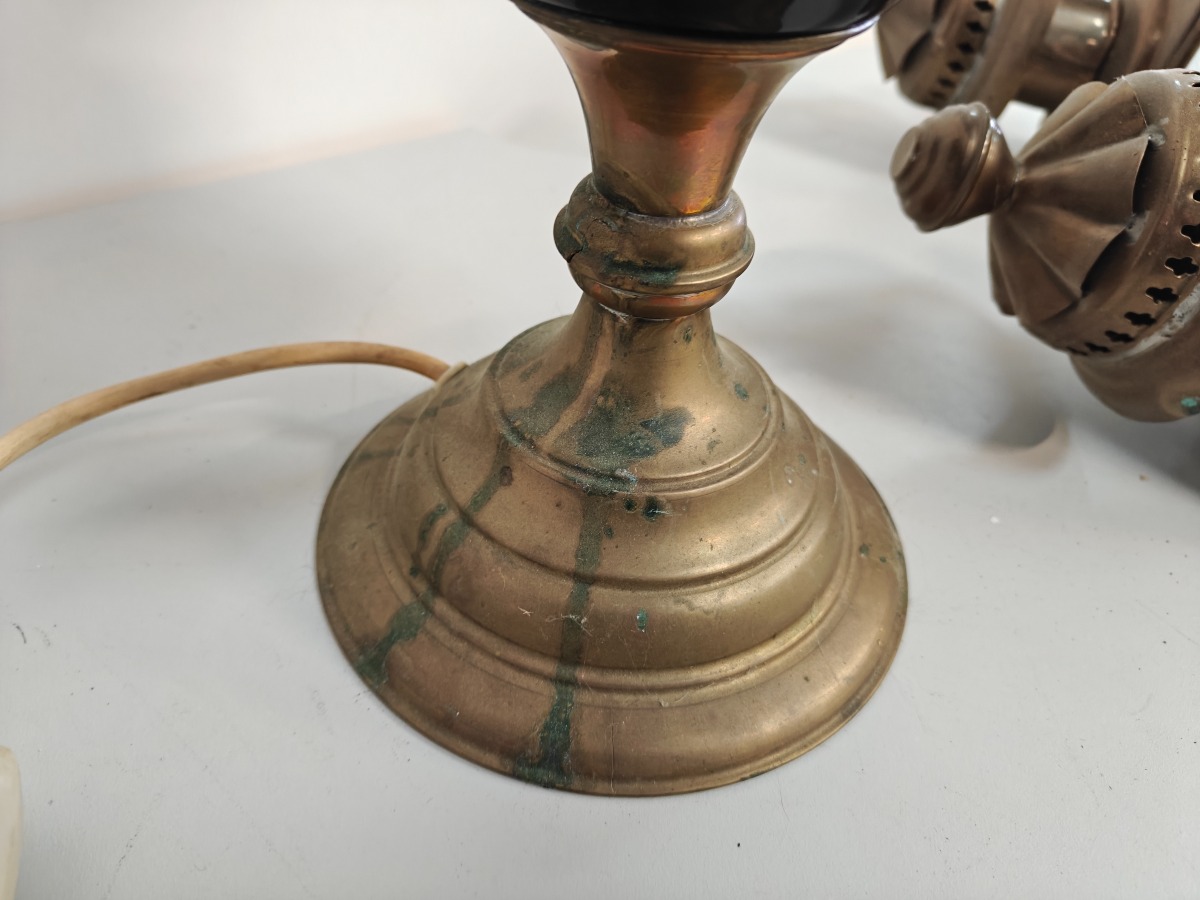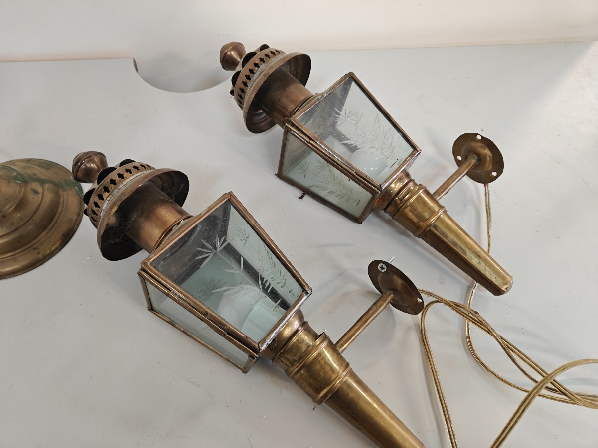 Bordlampe og 2 vognlygter. Bordlampe, petroleumslampe ombygget til el. Vognlygter ligeledes.