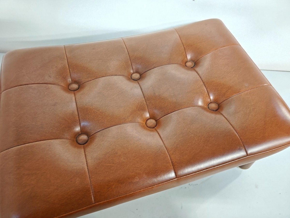 Lav fodskammel på bejdsede ben af bøg. Monteret med knapstukken kunstlæder. 48 x 32 cm. H. 18 cm.