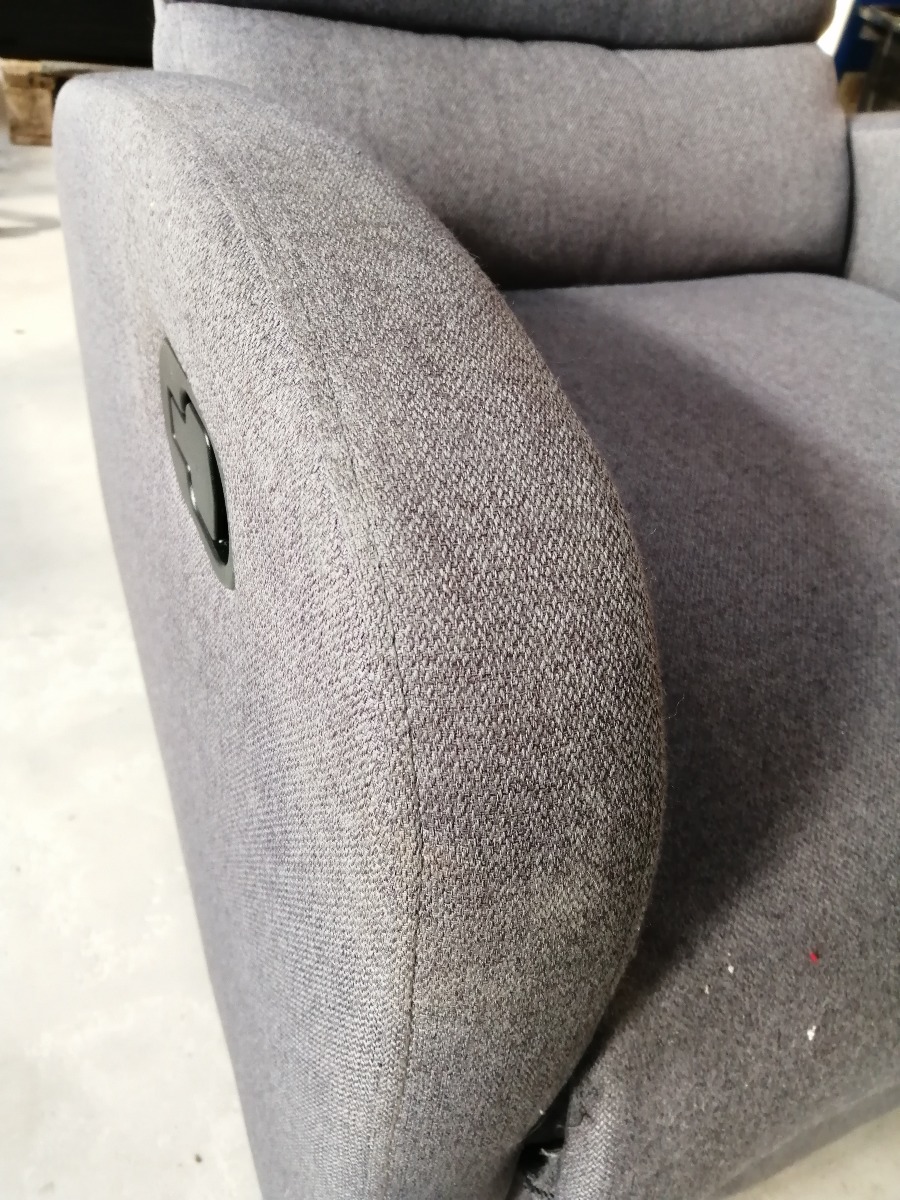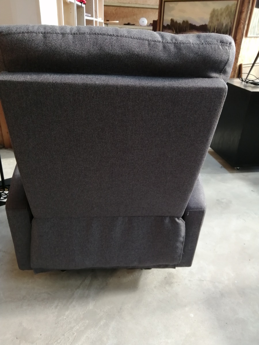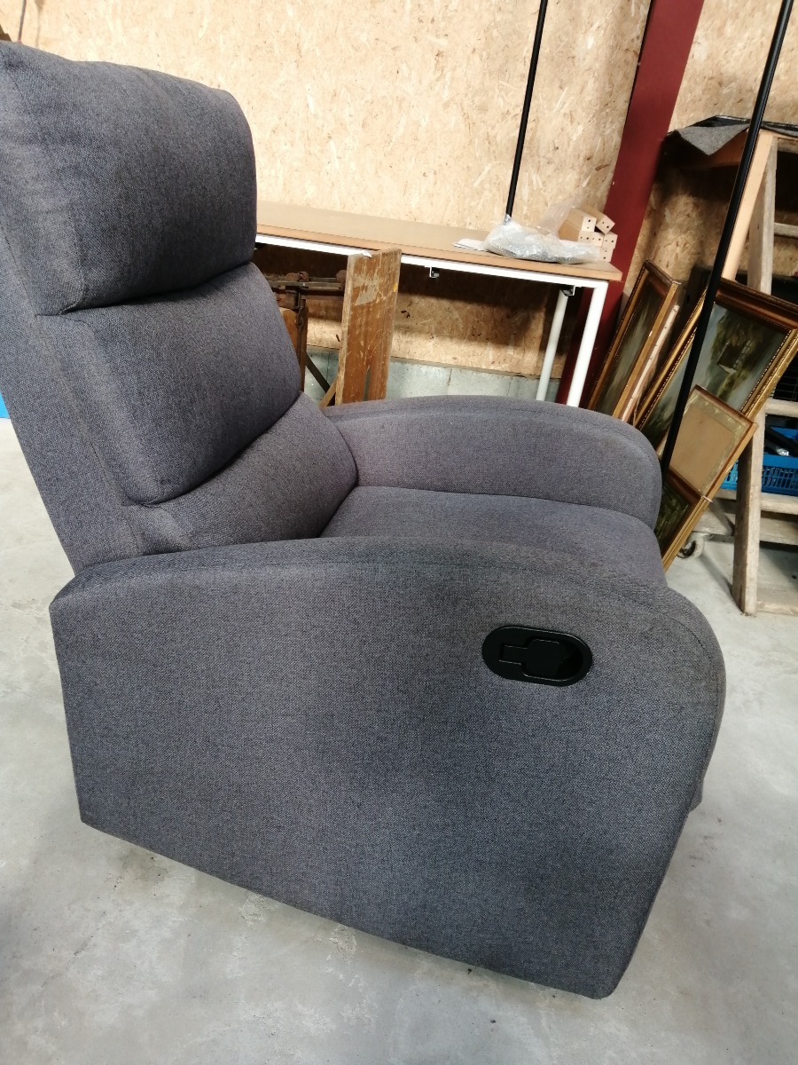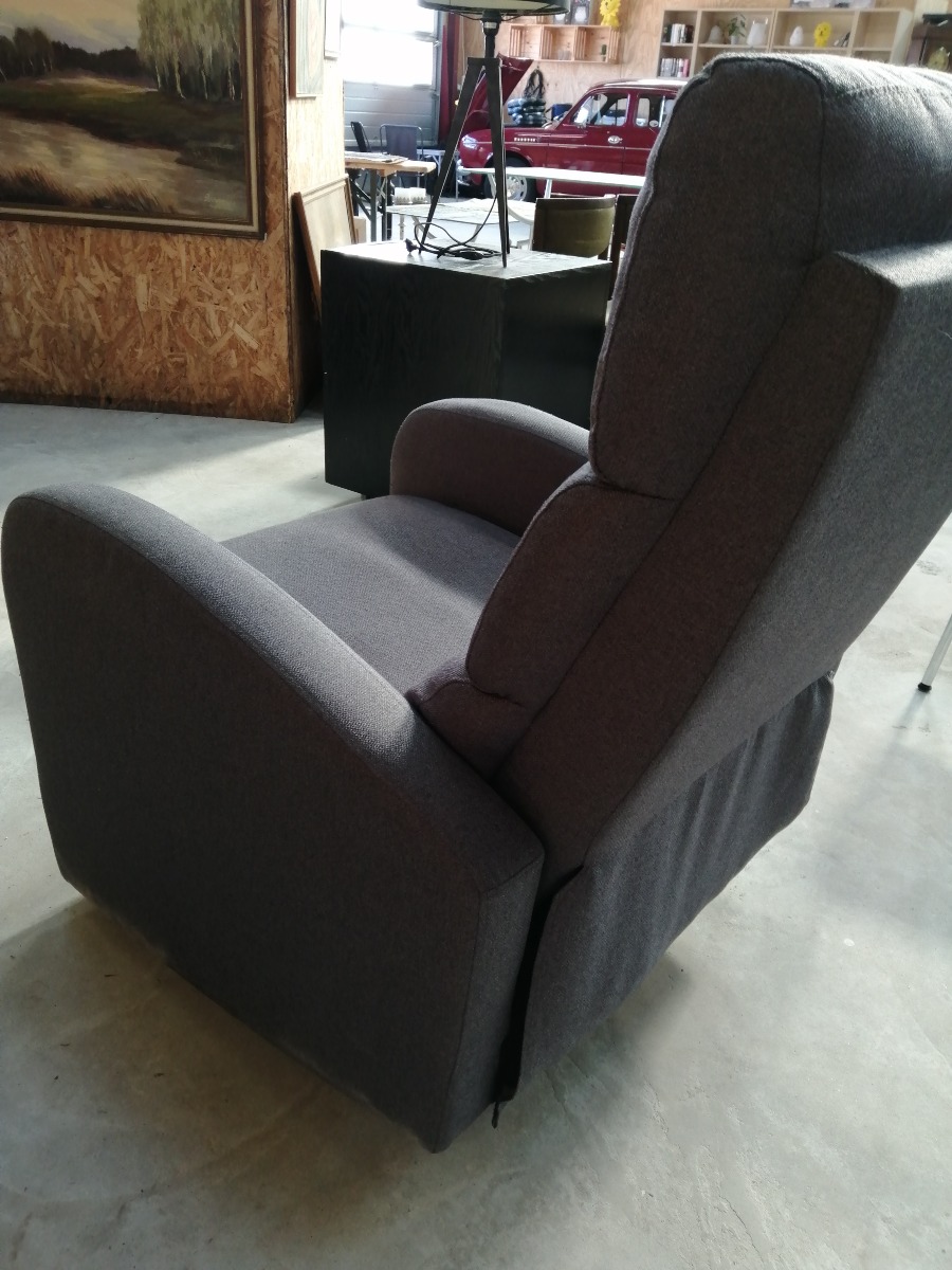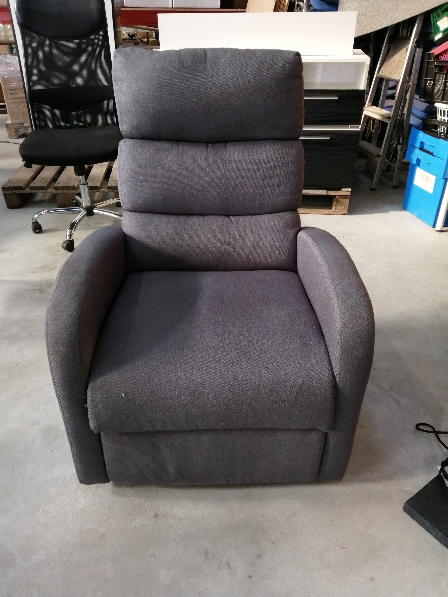Grå lænestol, foden kan vippes op. En smule slid / trænger til rengøring med armlæn. Brugt.