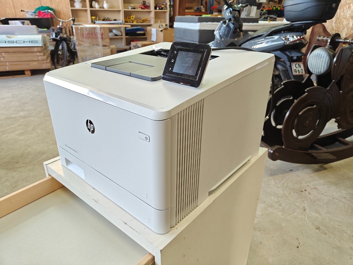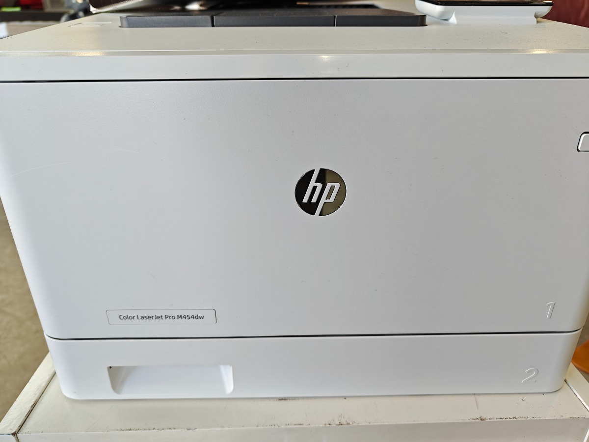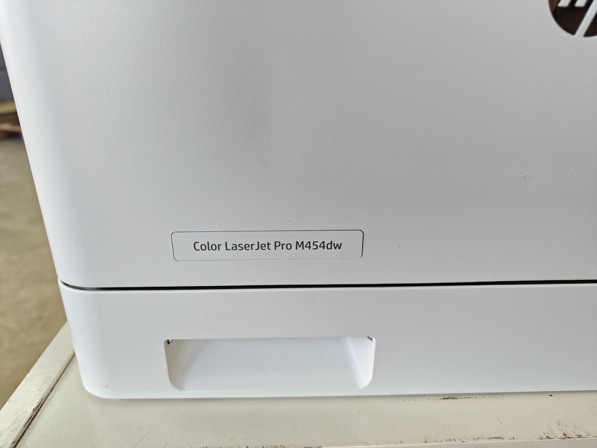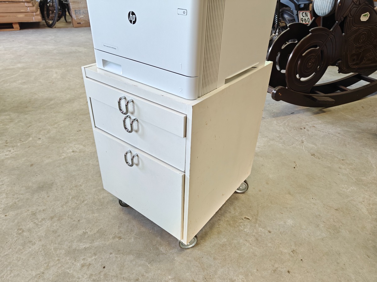 HP Color LaserJet Pro M454dw samt nye farvepatroner i rød, gul og blå. Hertil hvidt skuffemøbel i hvid laminat.