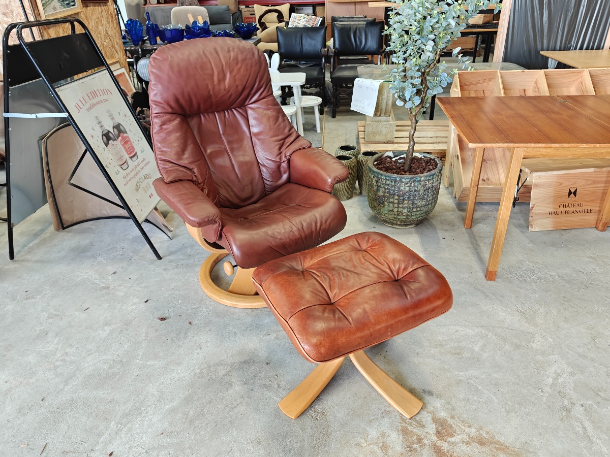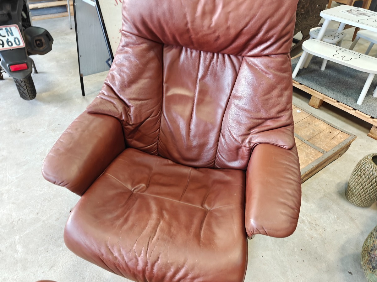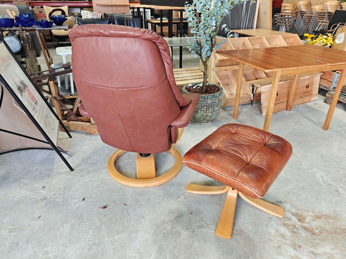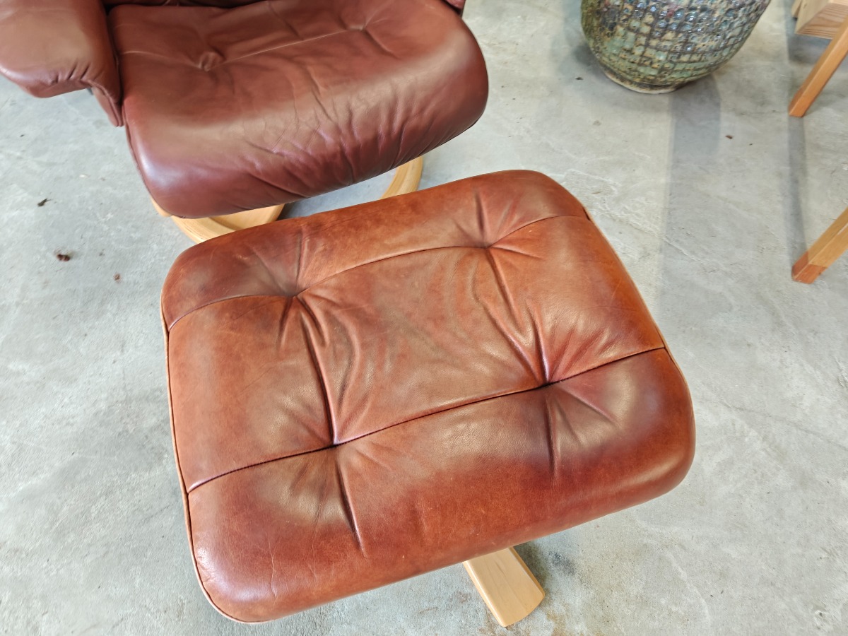 Hvilestol med skammel Brun læder på bøgestel. Mindrre brugsspor