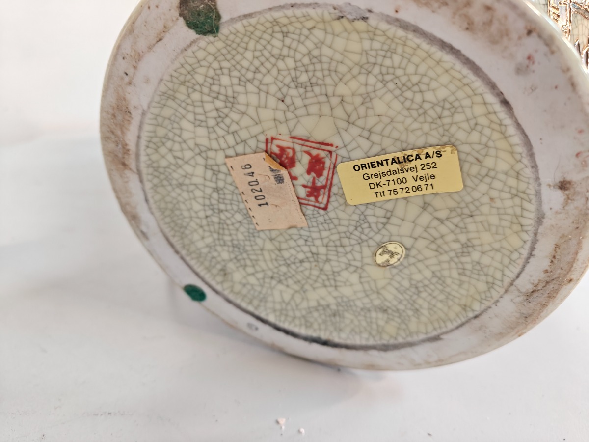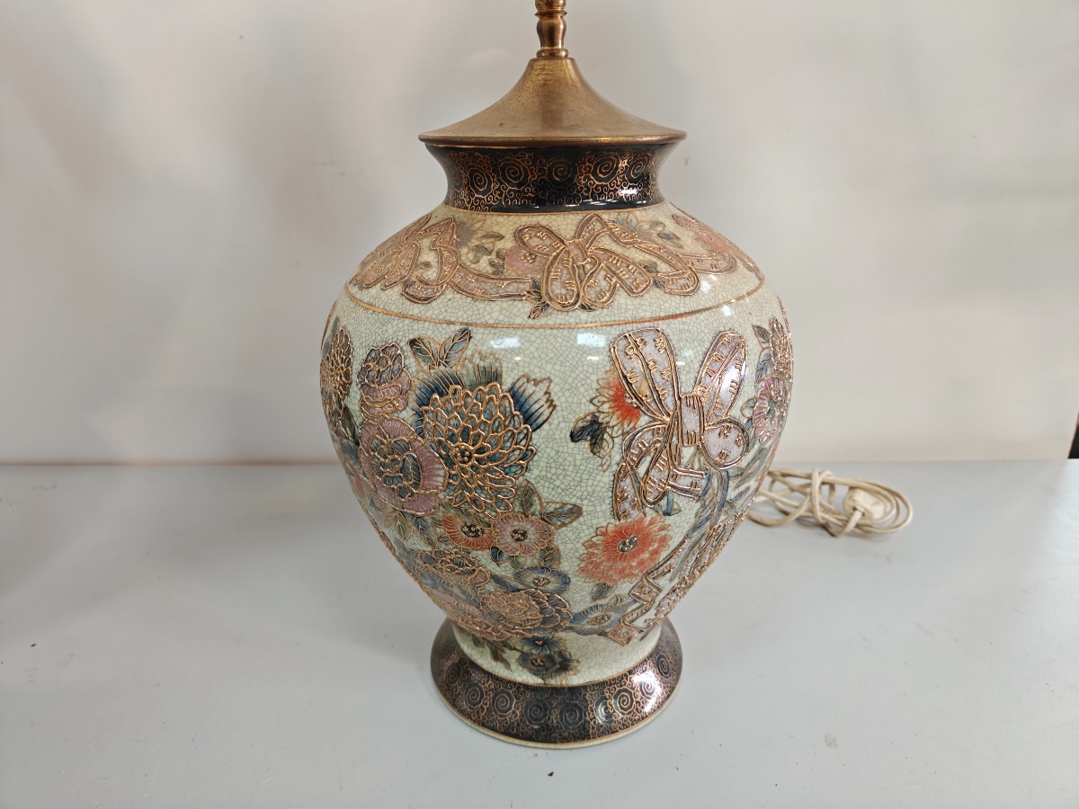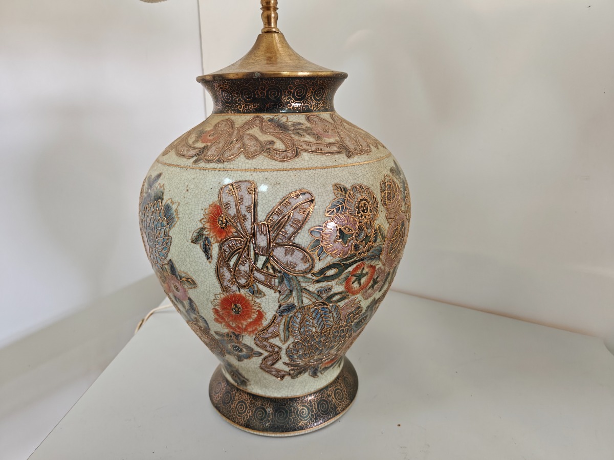Par kinesiske bordlamper Satsuma. Rigt dekoreret med florale motiver. H. med skærme: 73, Ø. 45 cm.