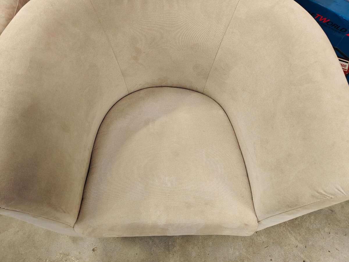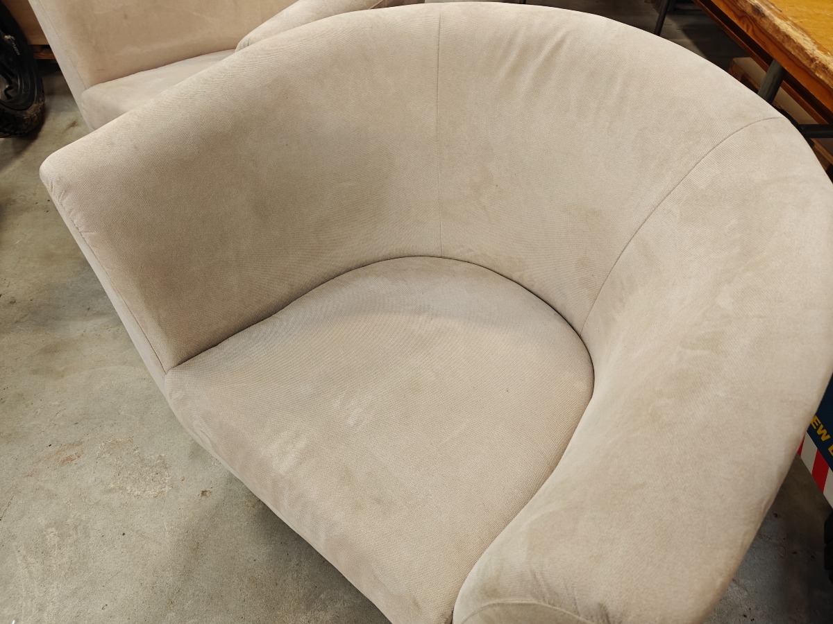 Par lænestole monteret med lyst stof. Fremstår velholdte.