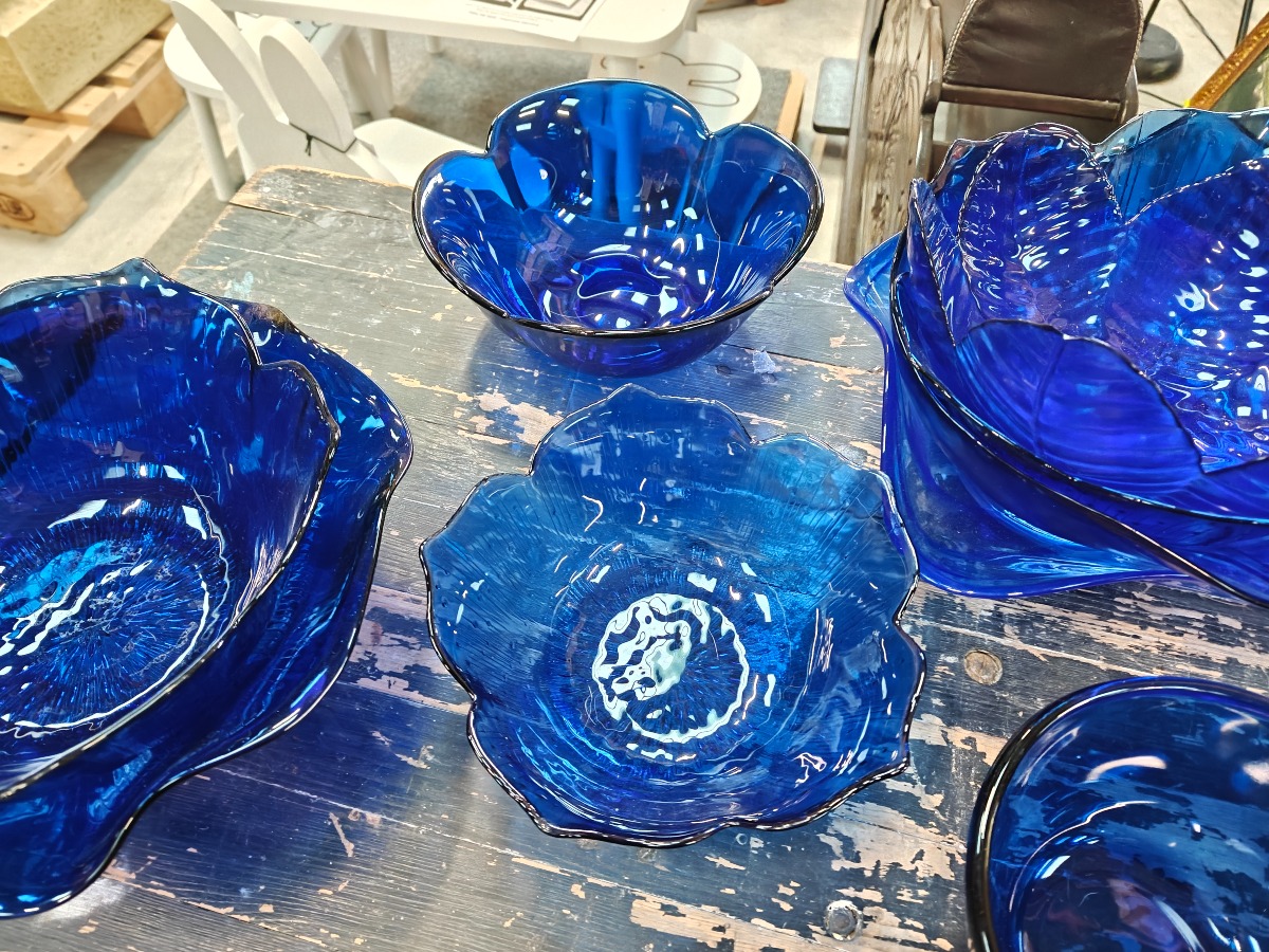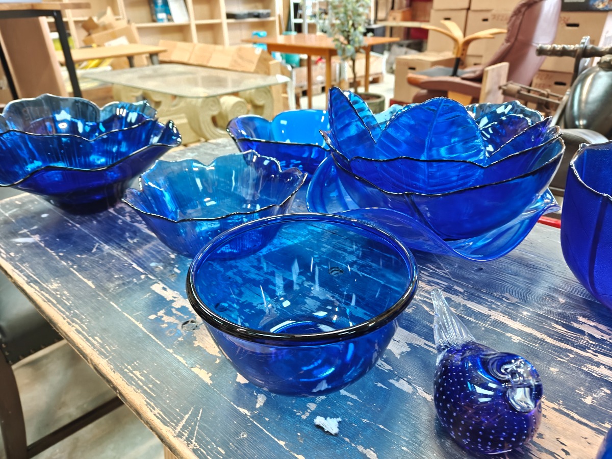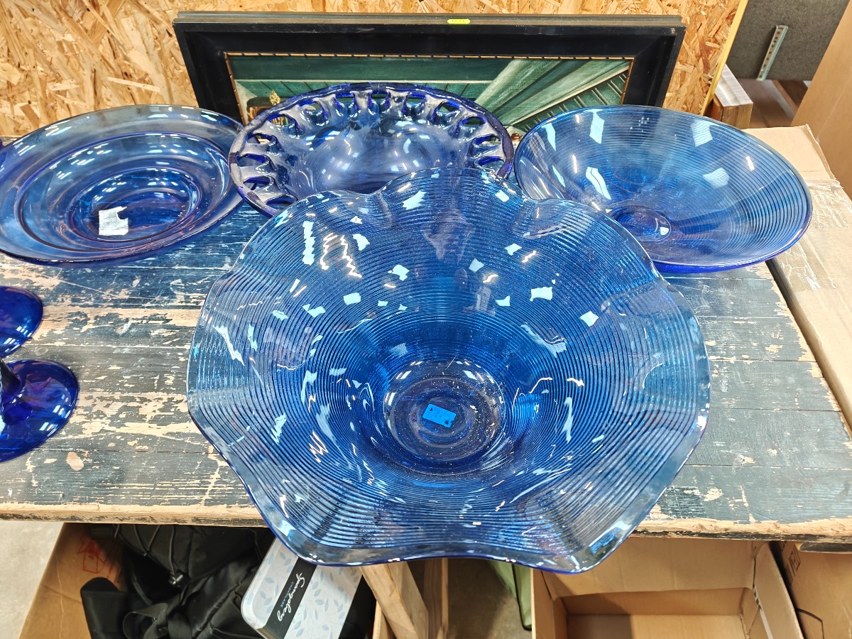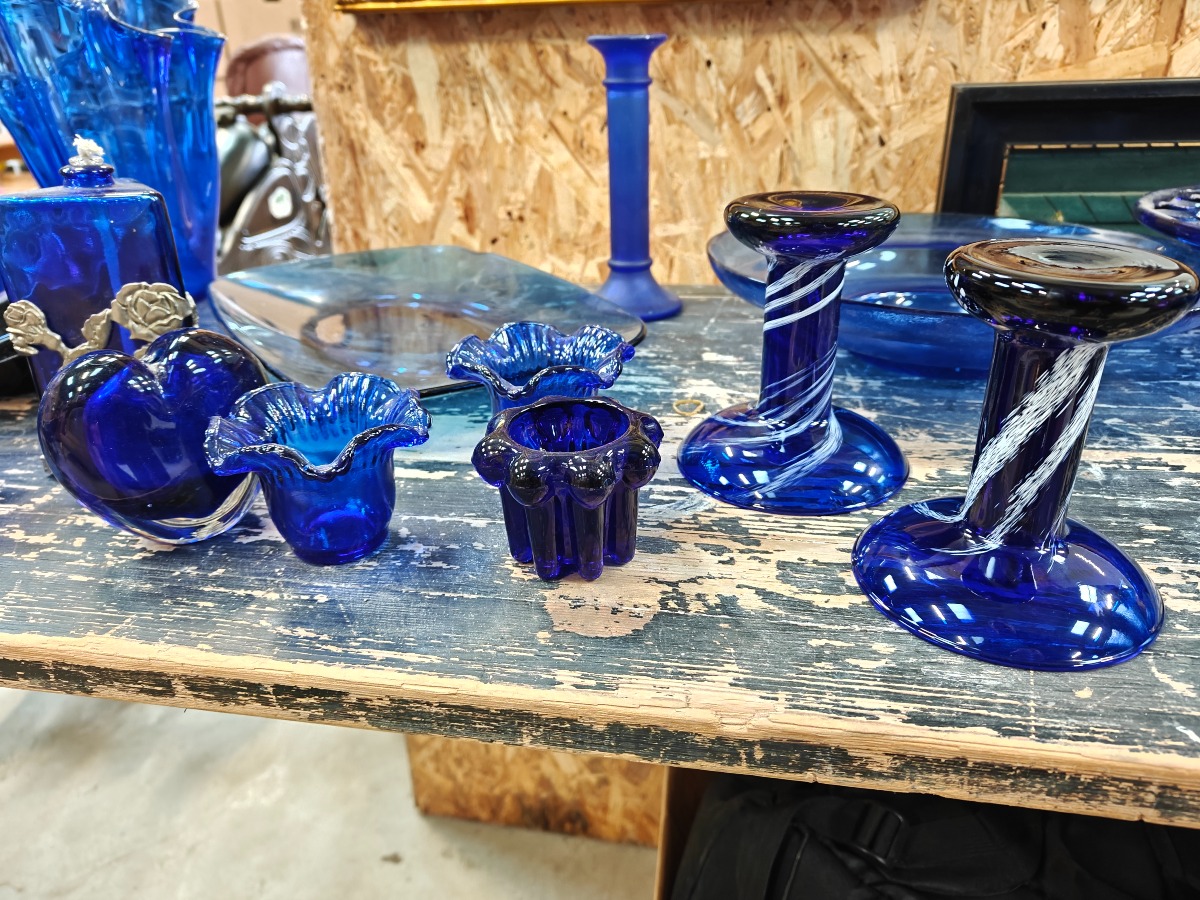 Samling af blåt glas. Mange skåle, fade og stager m.m.