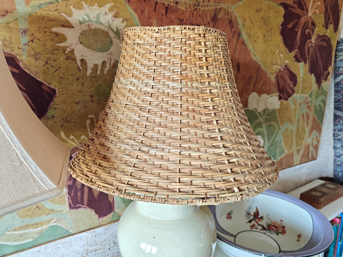 2 bordlamper med flet. Ene har flettet krop, den anden af lys porcelæn med flettet skærm.