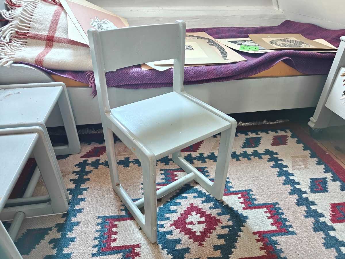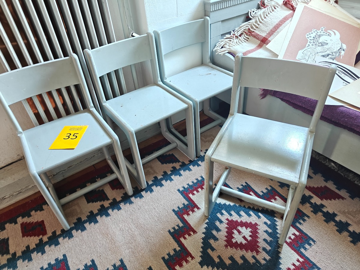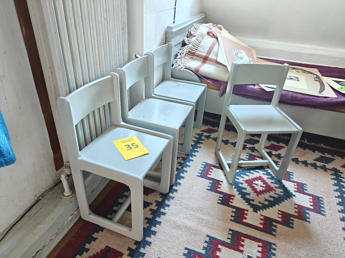 4 børnestole, gråmalede. Fremstår med brugsspor.