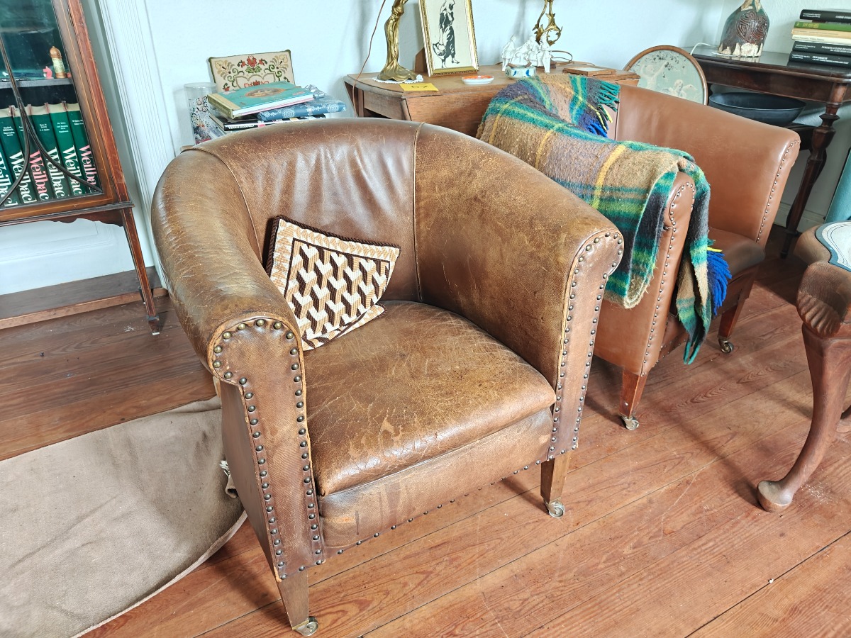 4 Club stole med sømbelået brunt læder. Ben med hjul. 2 med antageligt nyere lædermontering og 2 med patineret overflade.