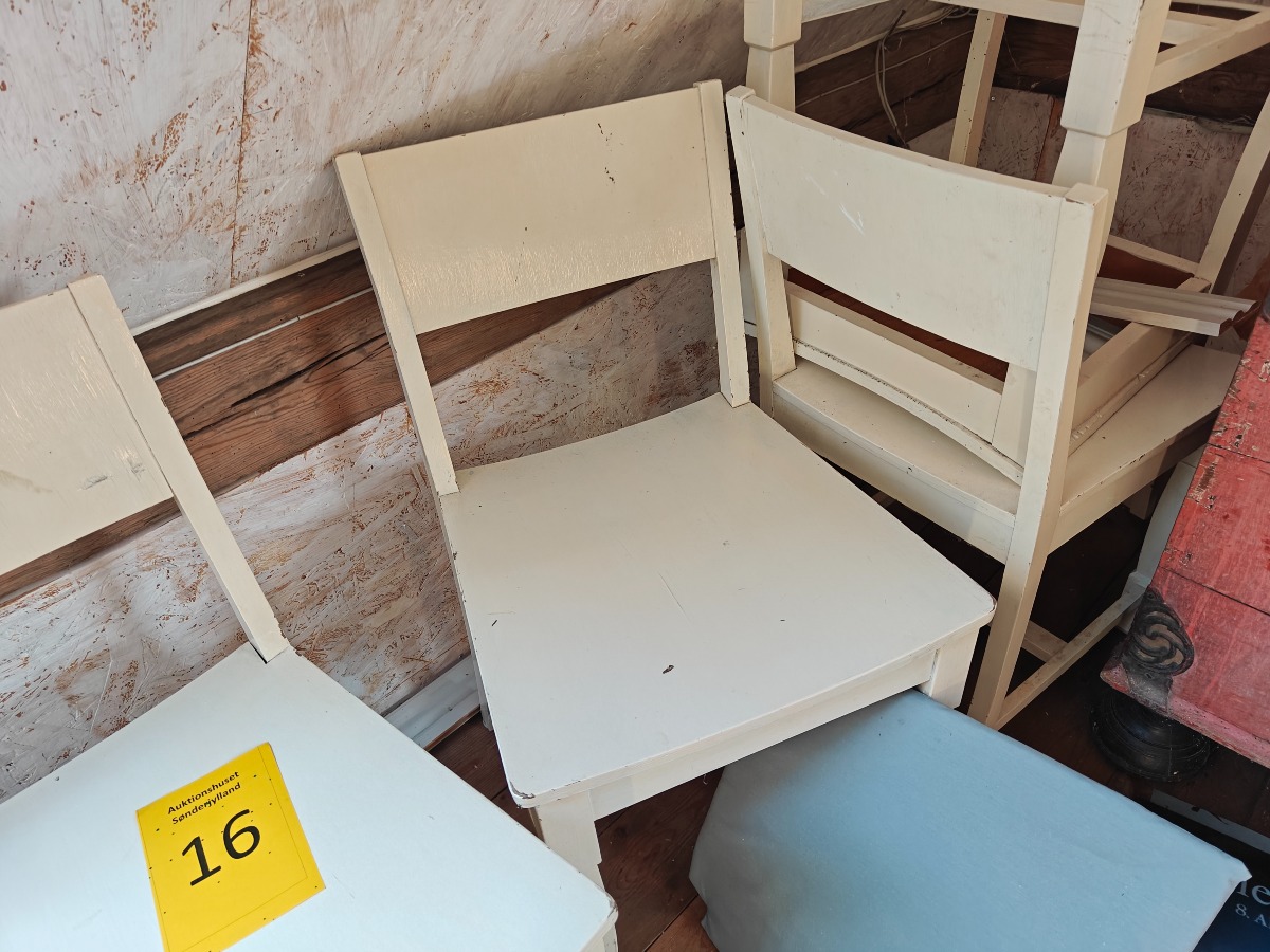 5 hvidmalede stole. Ene med armlæn. Afslag på maling kan forekomme.