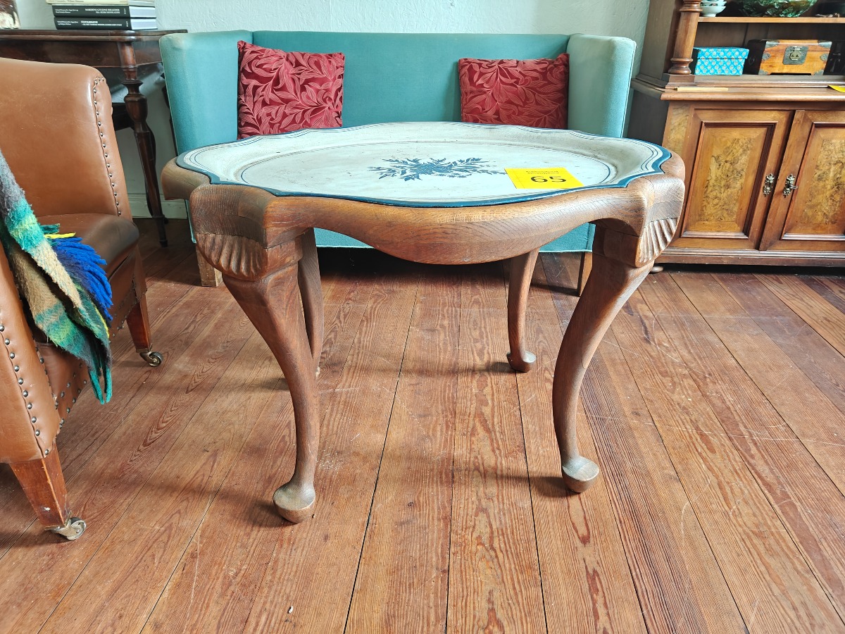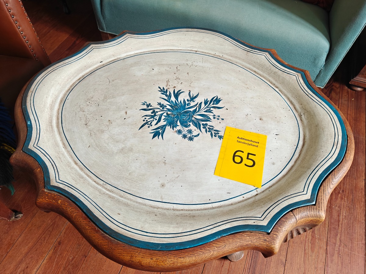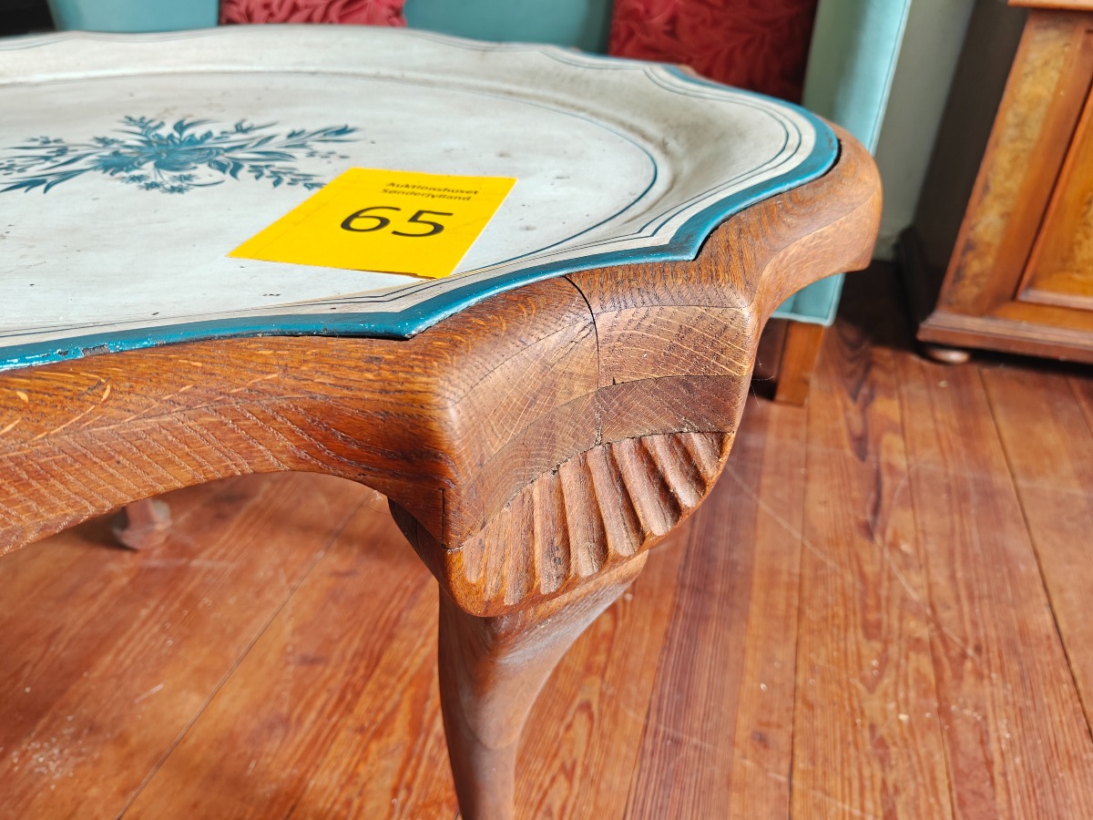 Bakkebord på cabriole ben. Stel af eg. Bemalet metalbakke med svejfet kant. 60 x 86 x 73 cm.