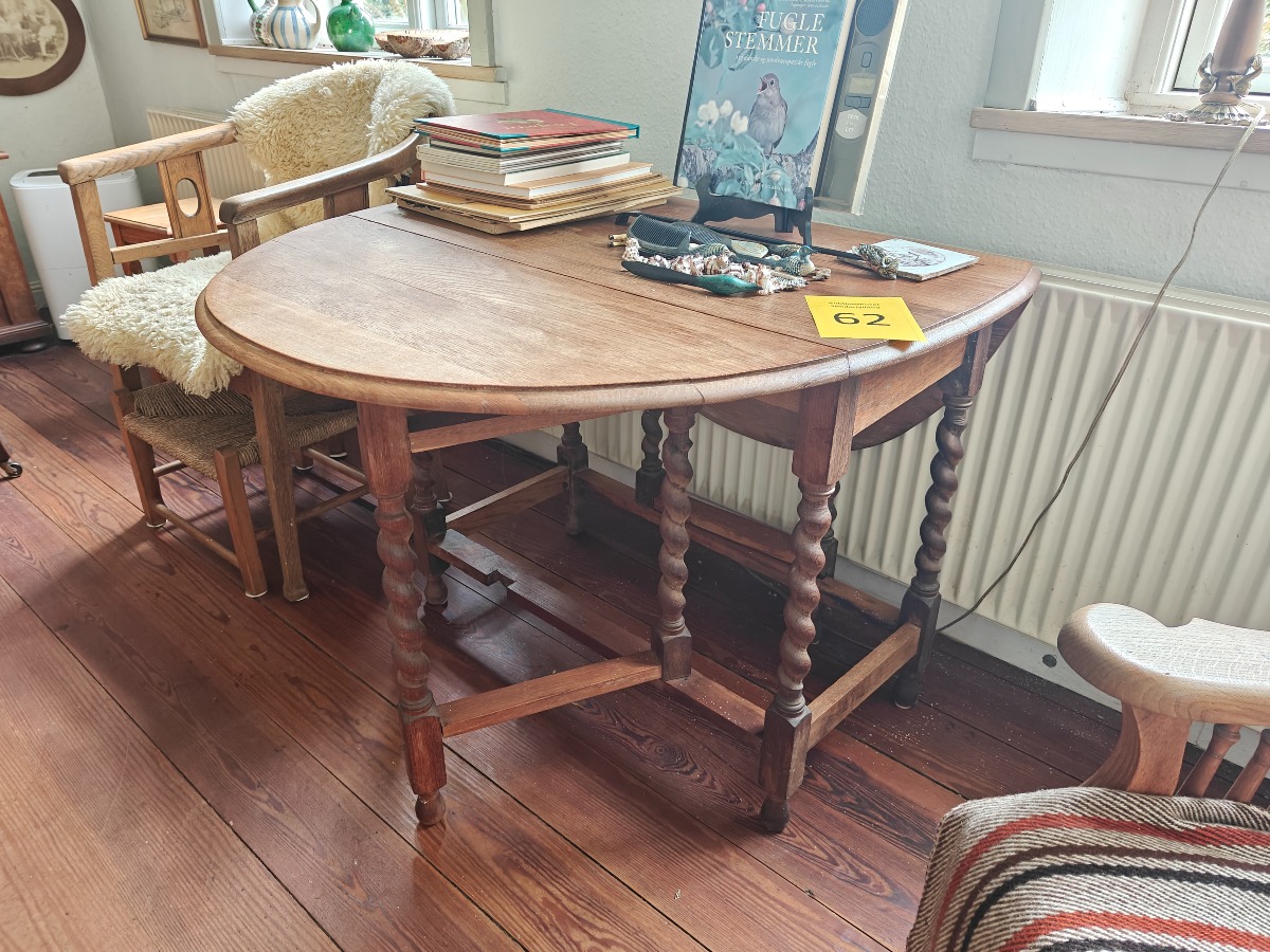 Gateleg bord med oval top. Egetræ. Udslået 100 x 160 cm.