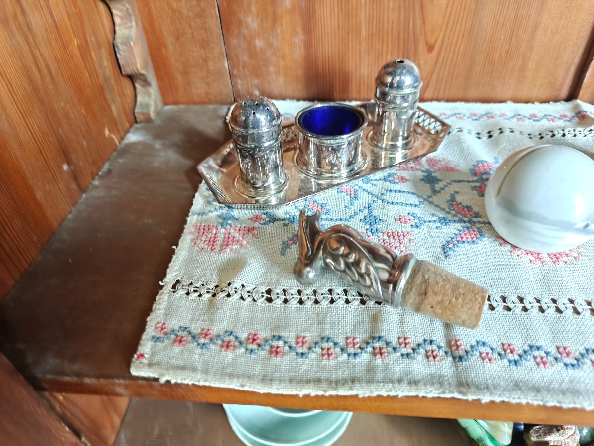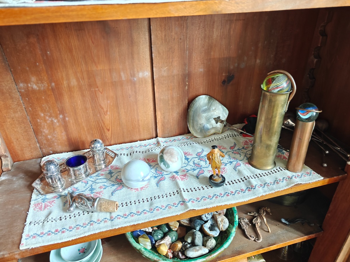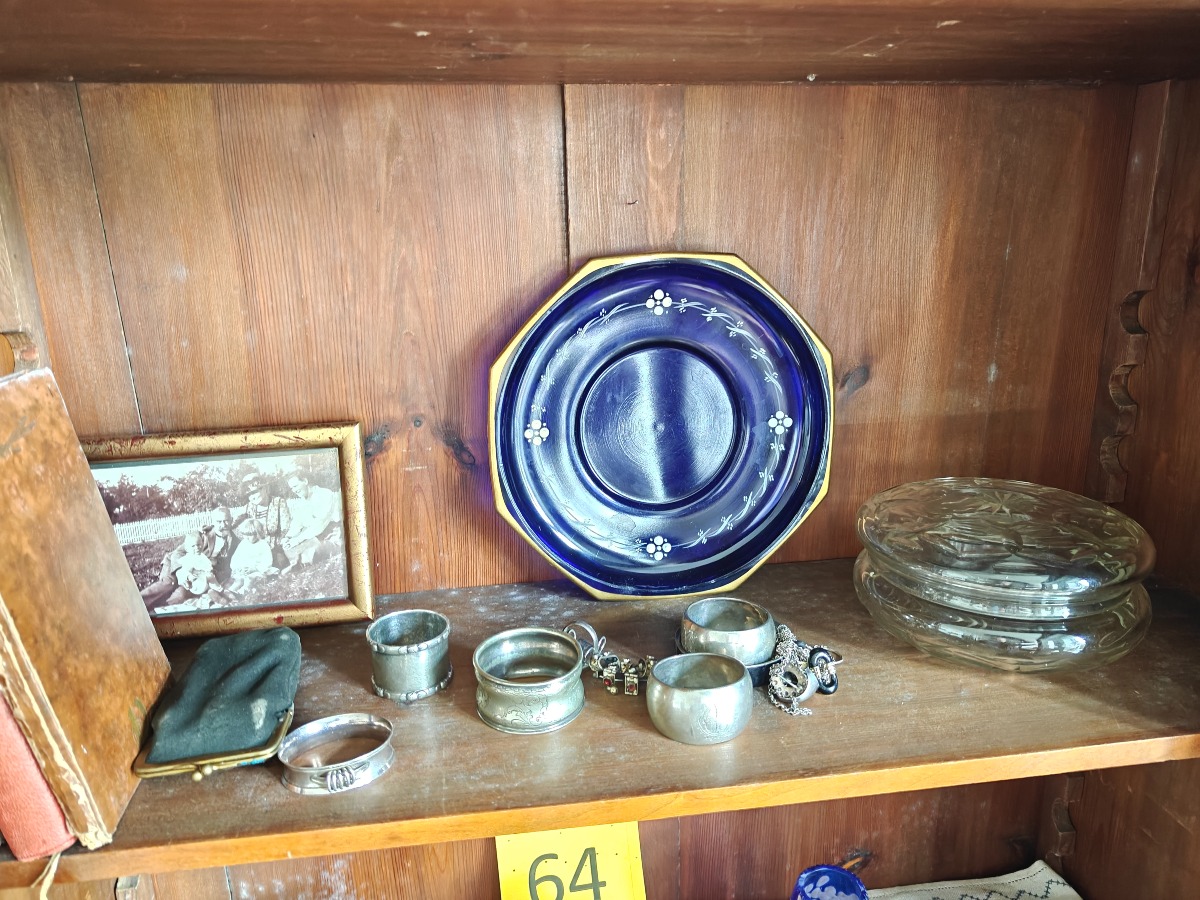 Indhold af vitrineoverdel af bogskab.