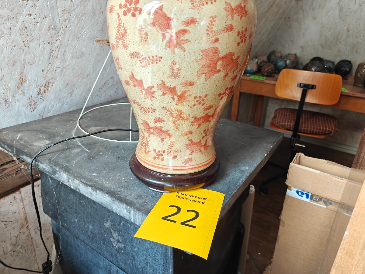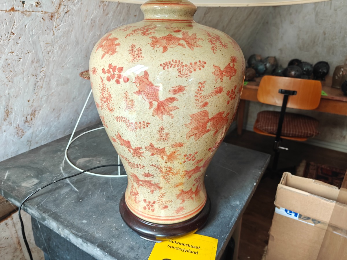 Lampe af orientalsk krukke, prydet med guldfisk. H. for selve lampe ca. 50 cm.