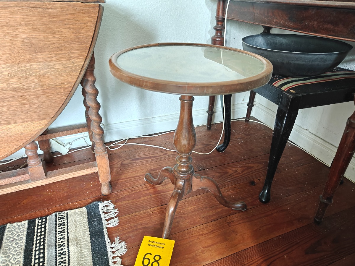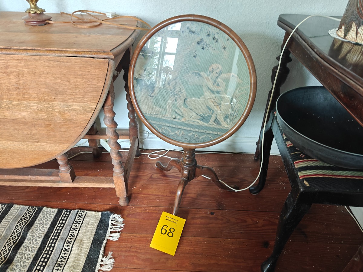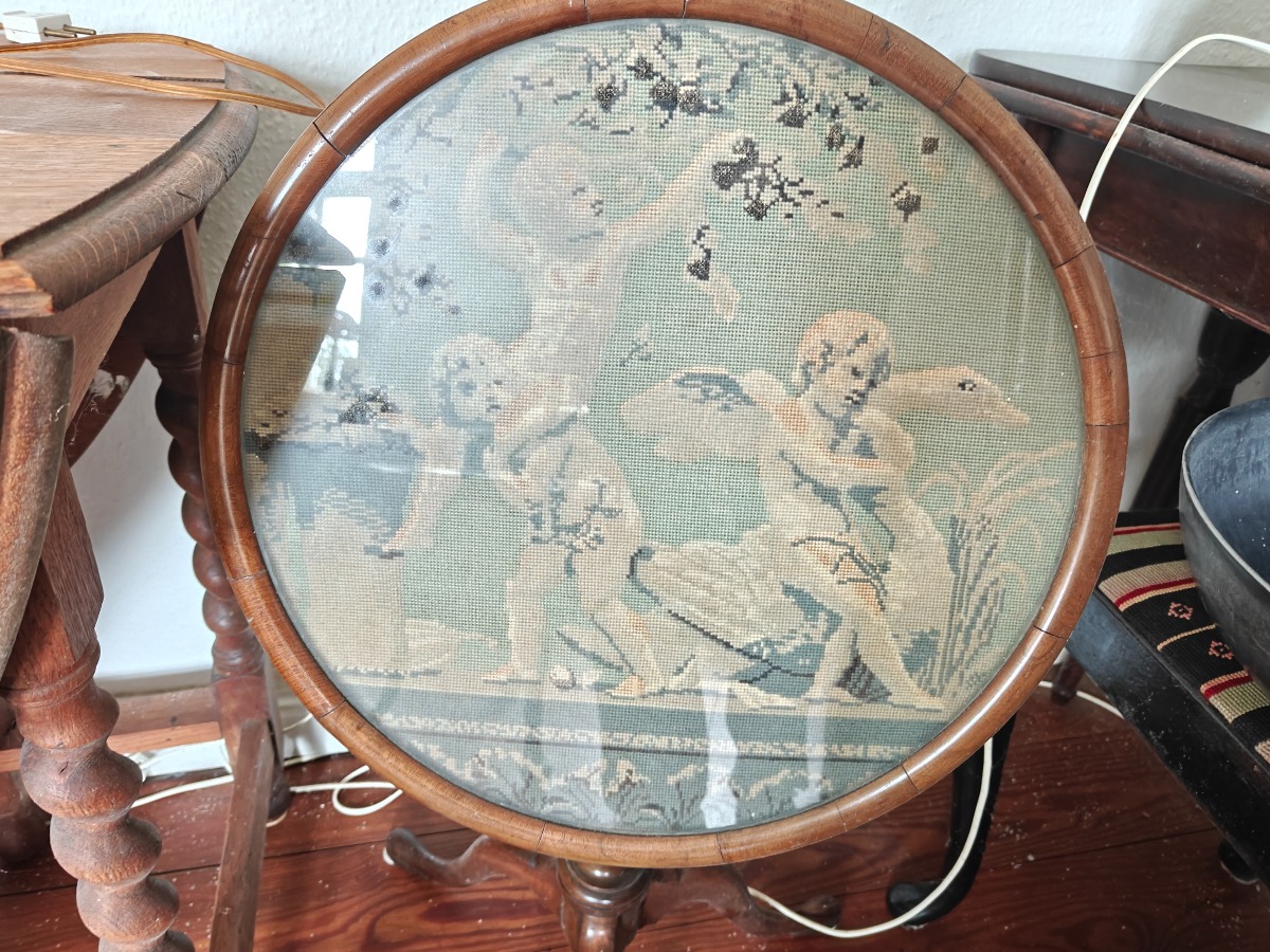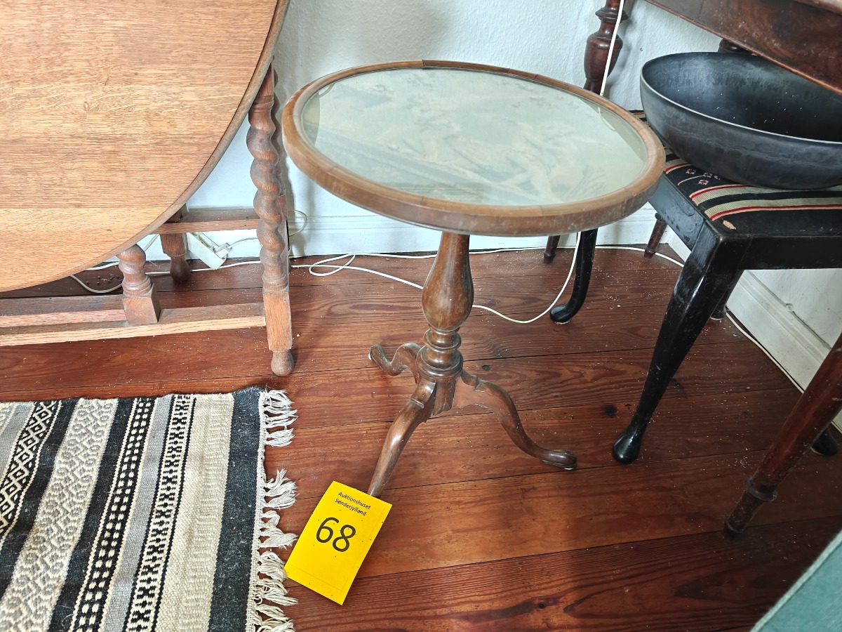 Lille tilt top bord af mahogni. Rund top med indlagt broderi. 60 x 40 cm.