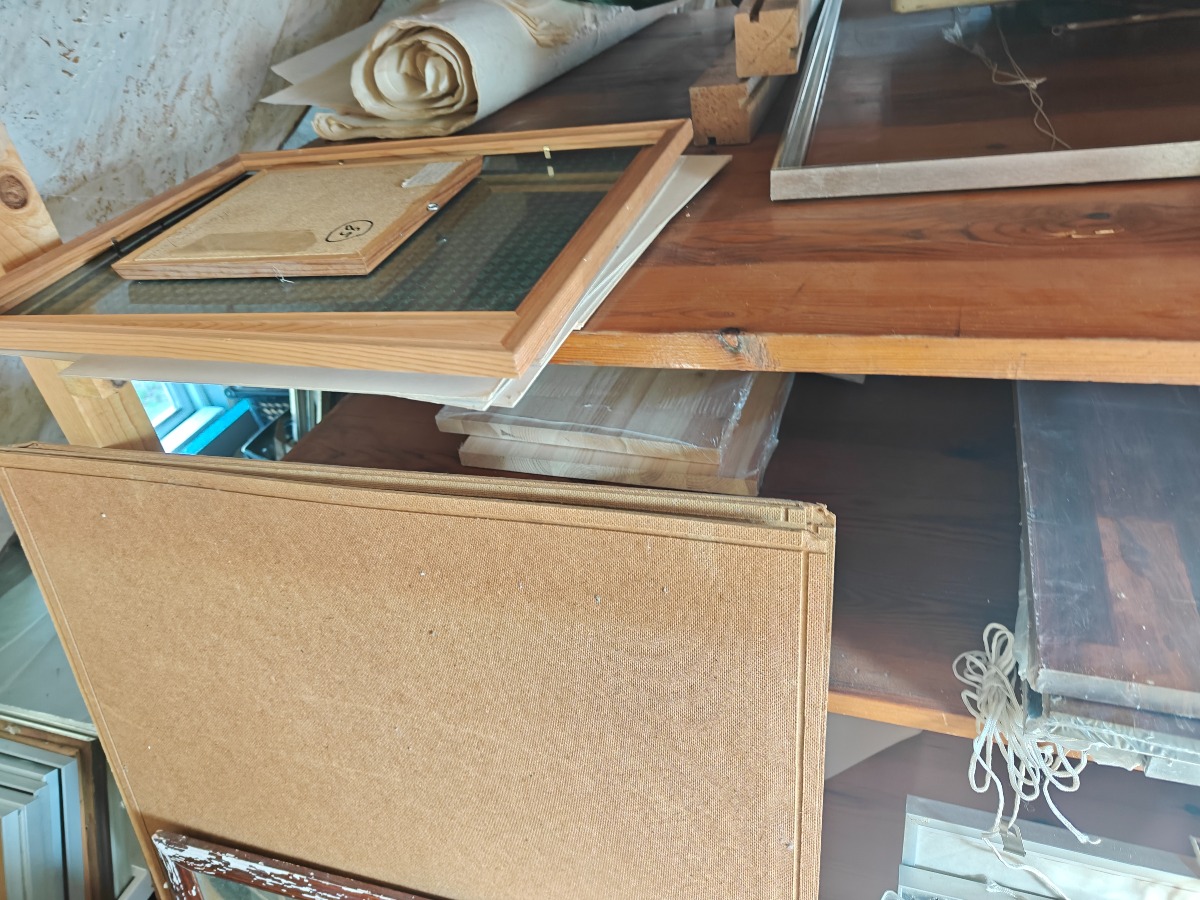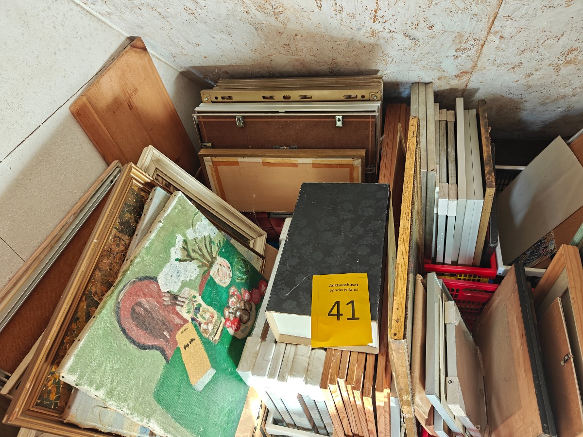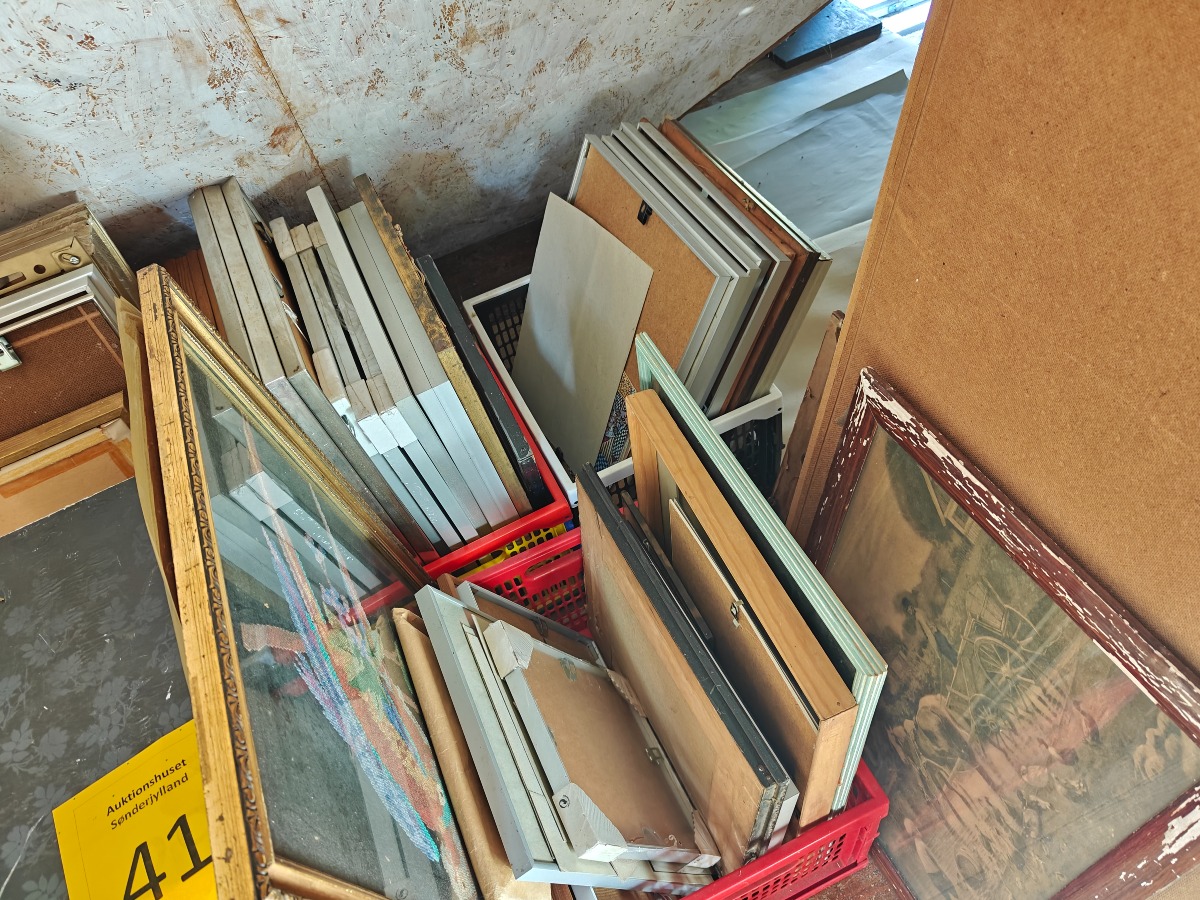 Stor mængde rammer og tilbehør. Alt på gulv og i skab.
