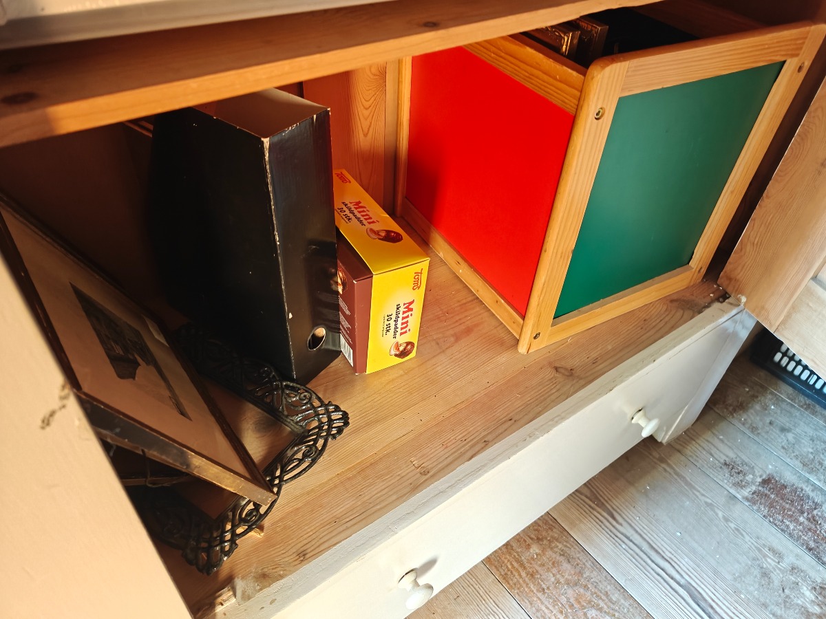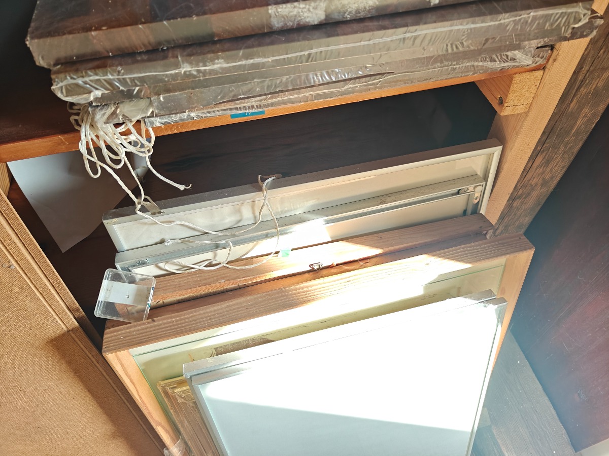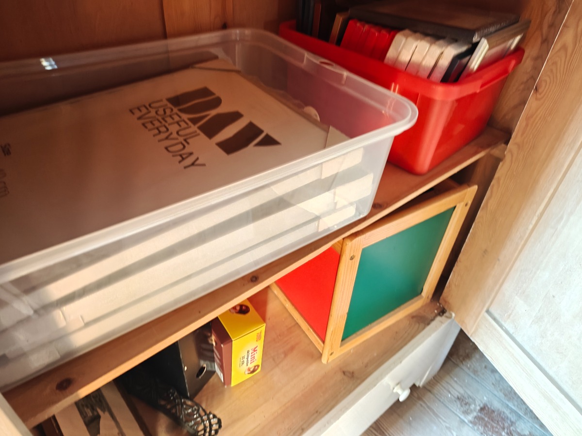 Stor mængde rammer og tilbehør. Alt på gulv og i skab.