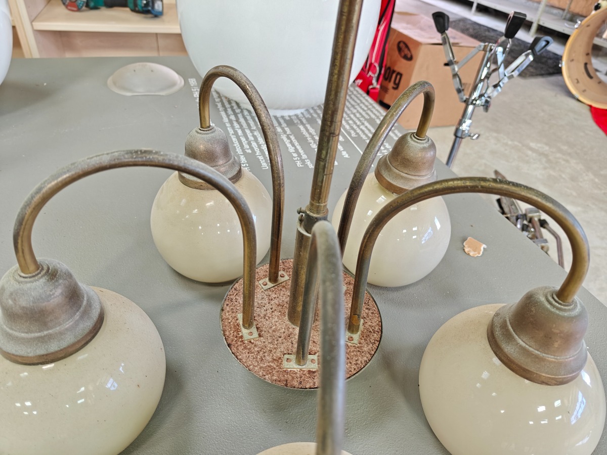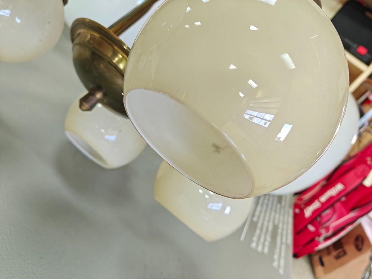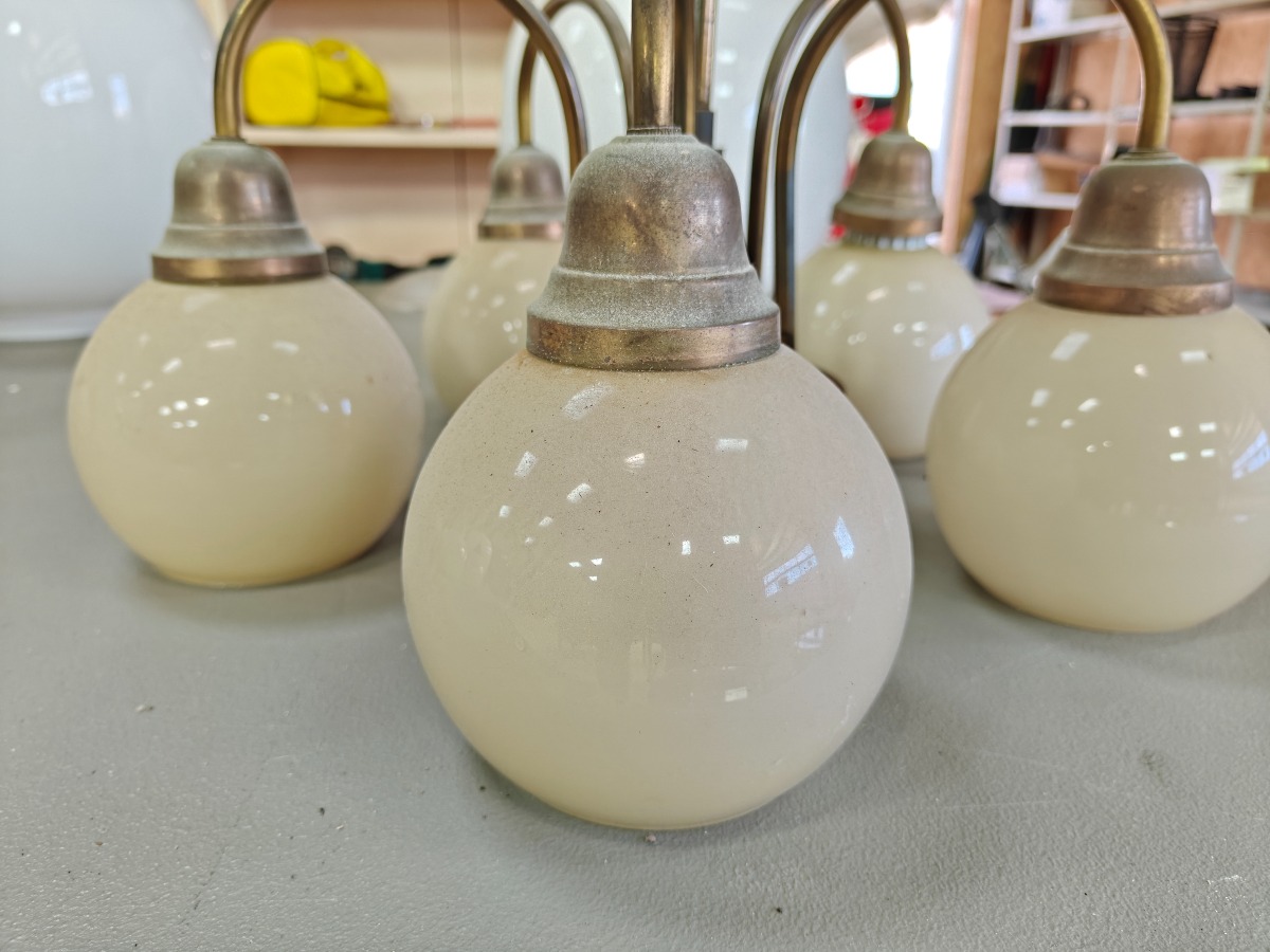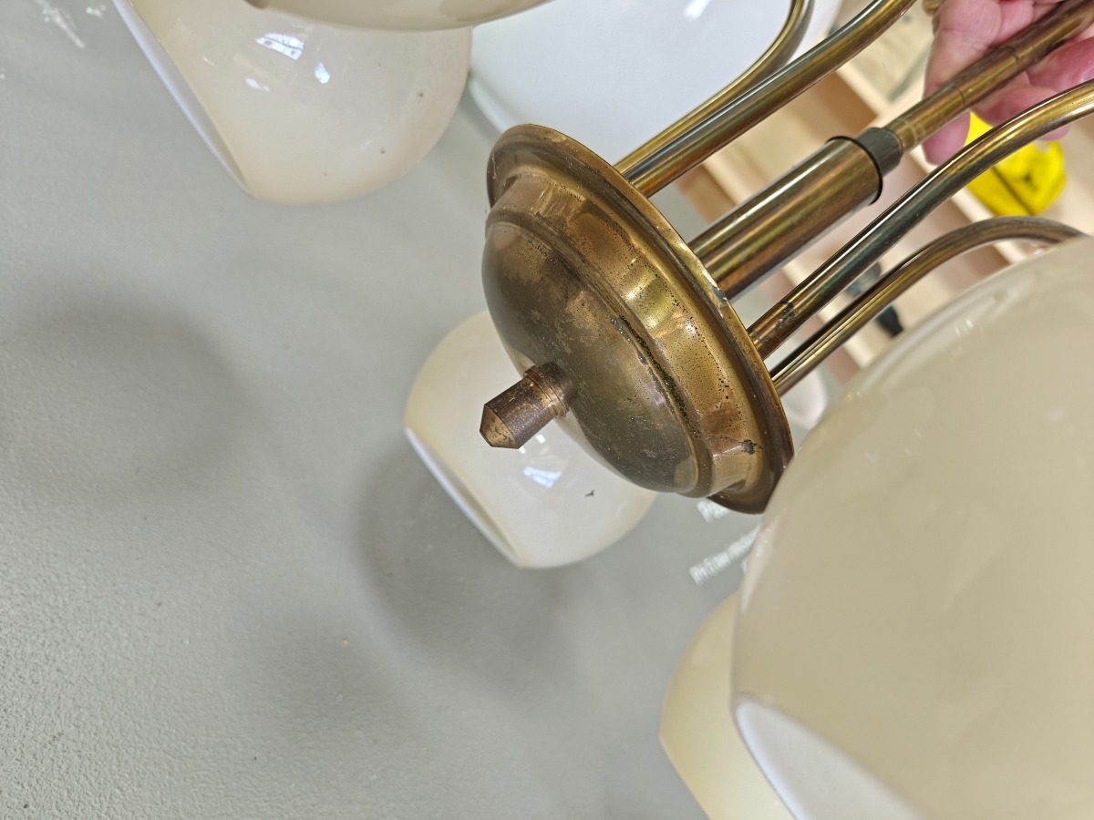 5-armet ringkrone af messing. 5  skærme af opalglas. Stel let anløben og med rust. Se foto. H. samlet: