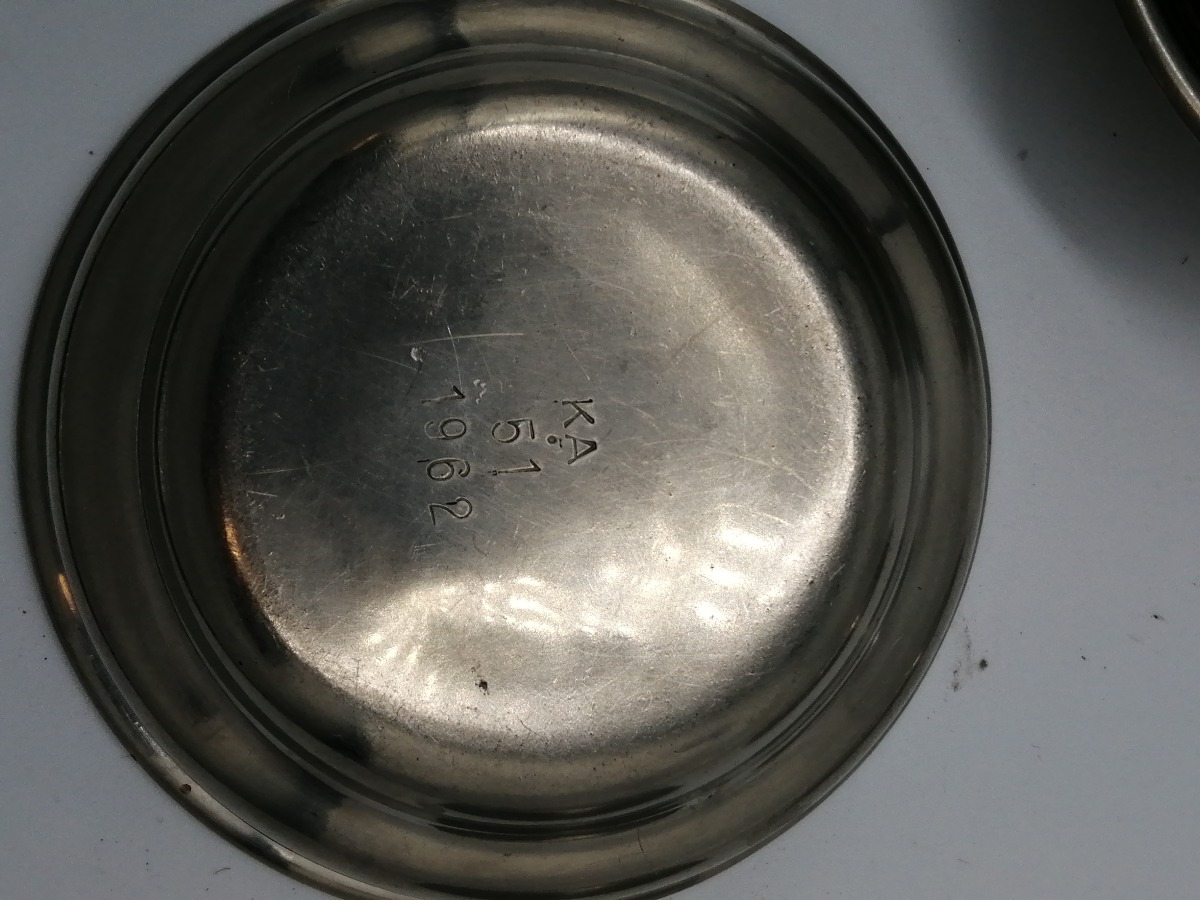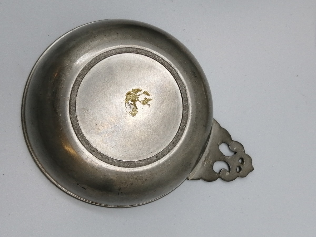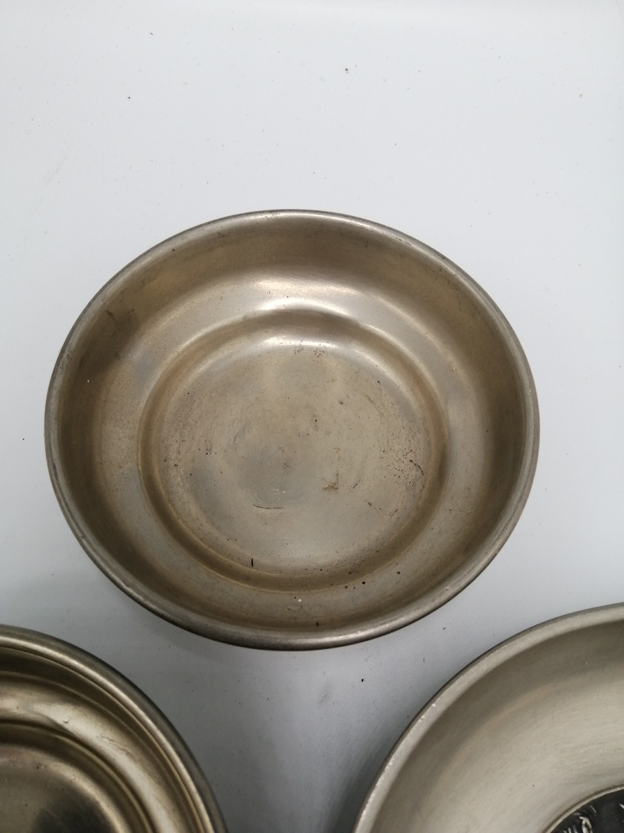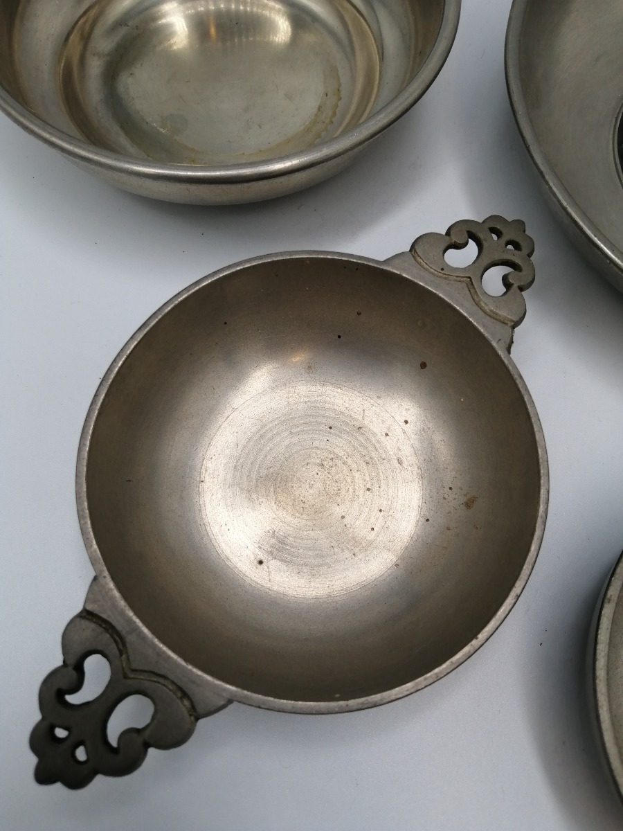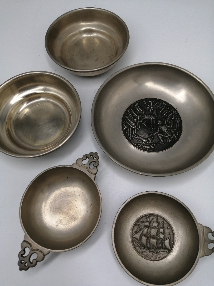 5 dele tin. 2 tastevin og 3 skåle. Ø. for største: 15 cm.