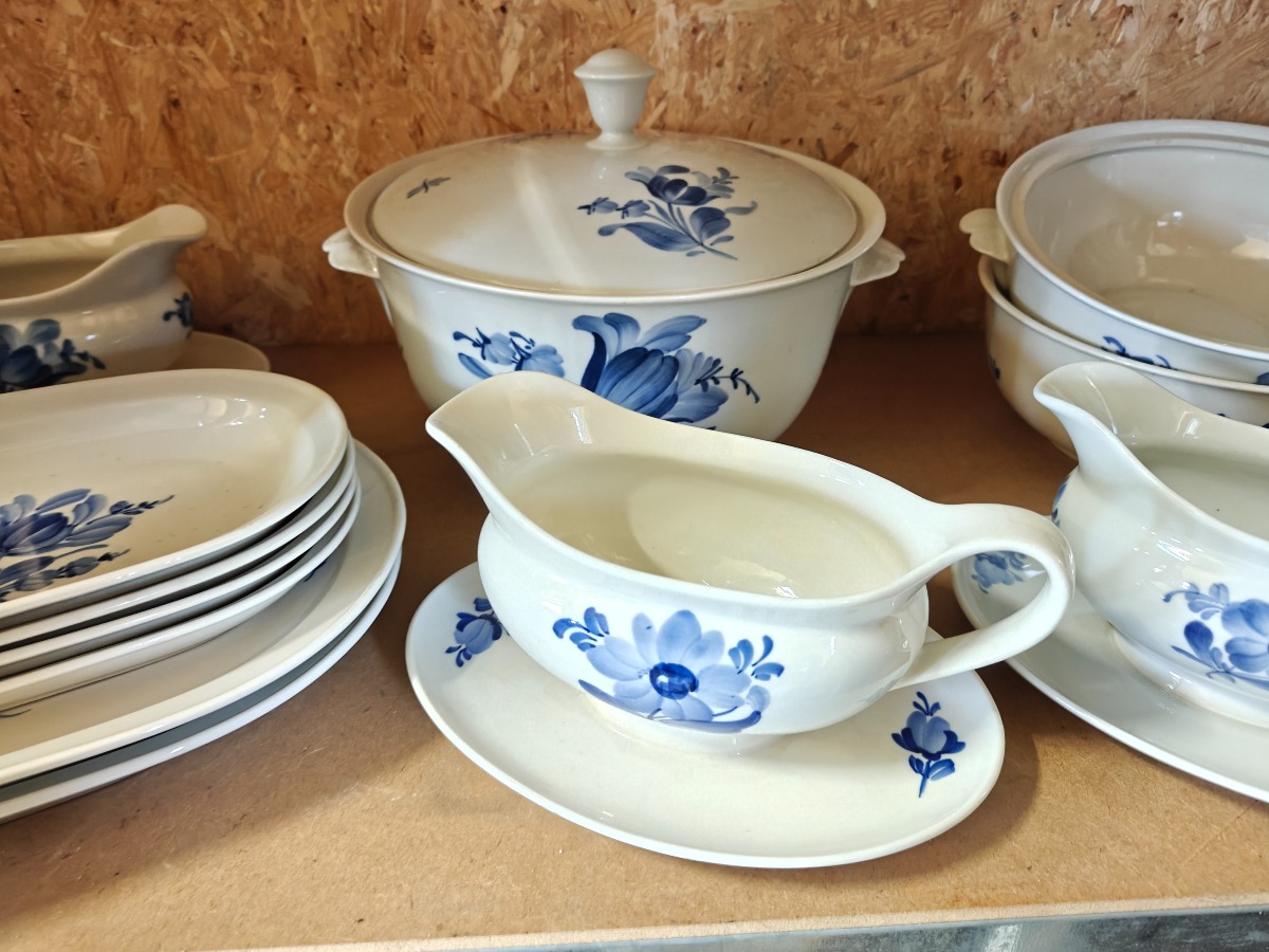Blåmalet stel med blomster. Lille terrin, 2 skåle, 3 sovsebåde og 6 fade.