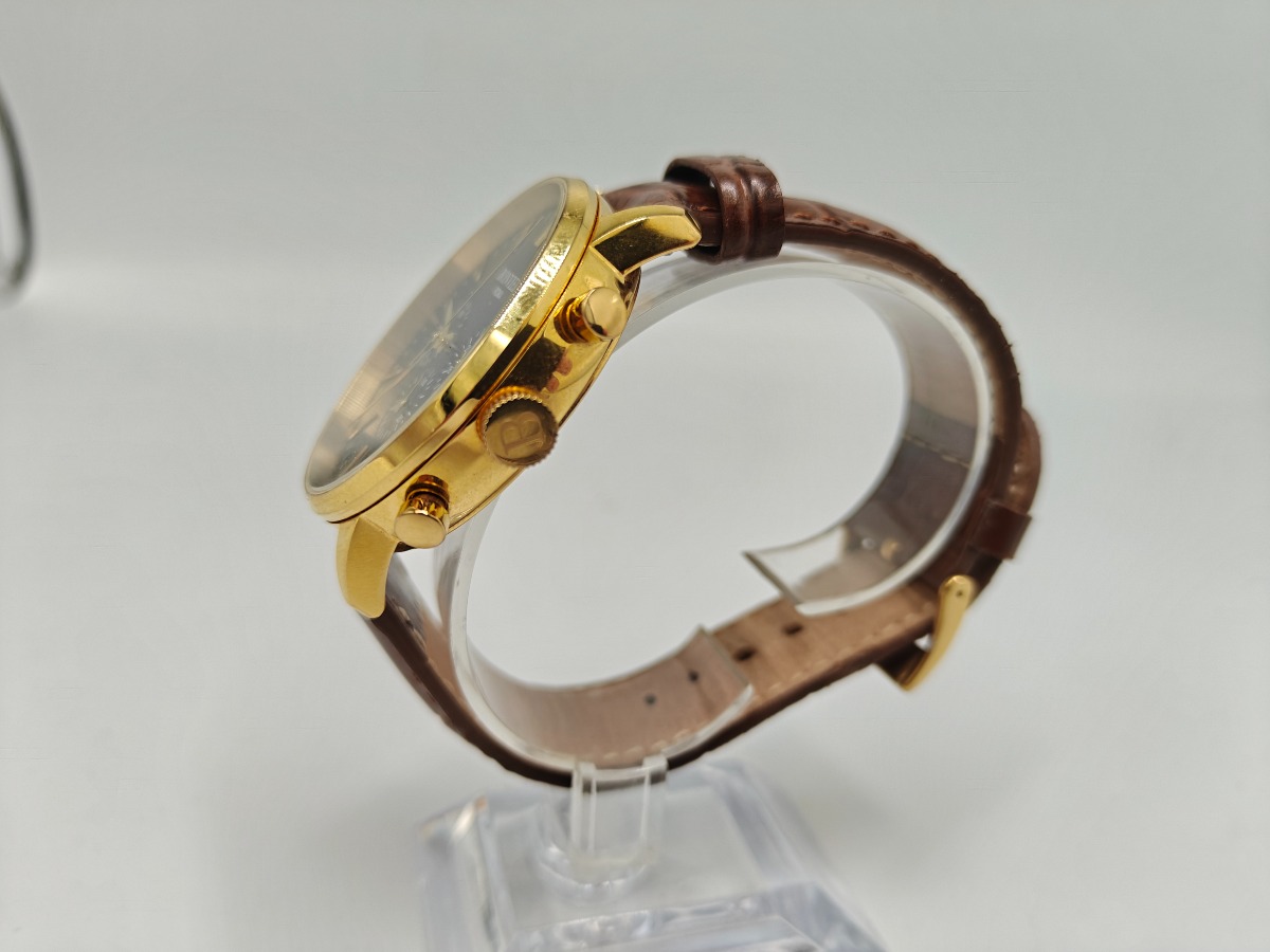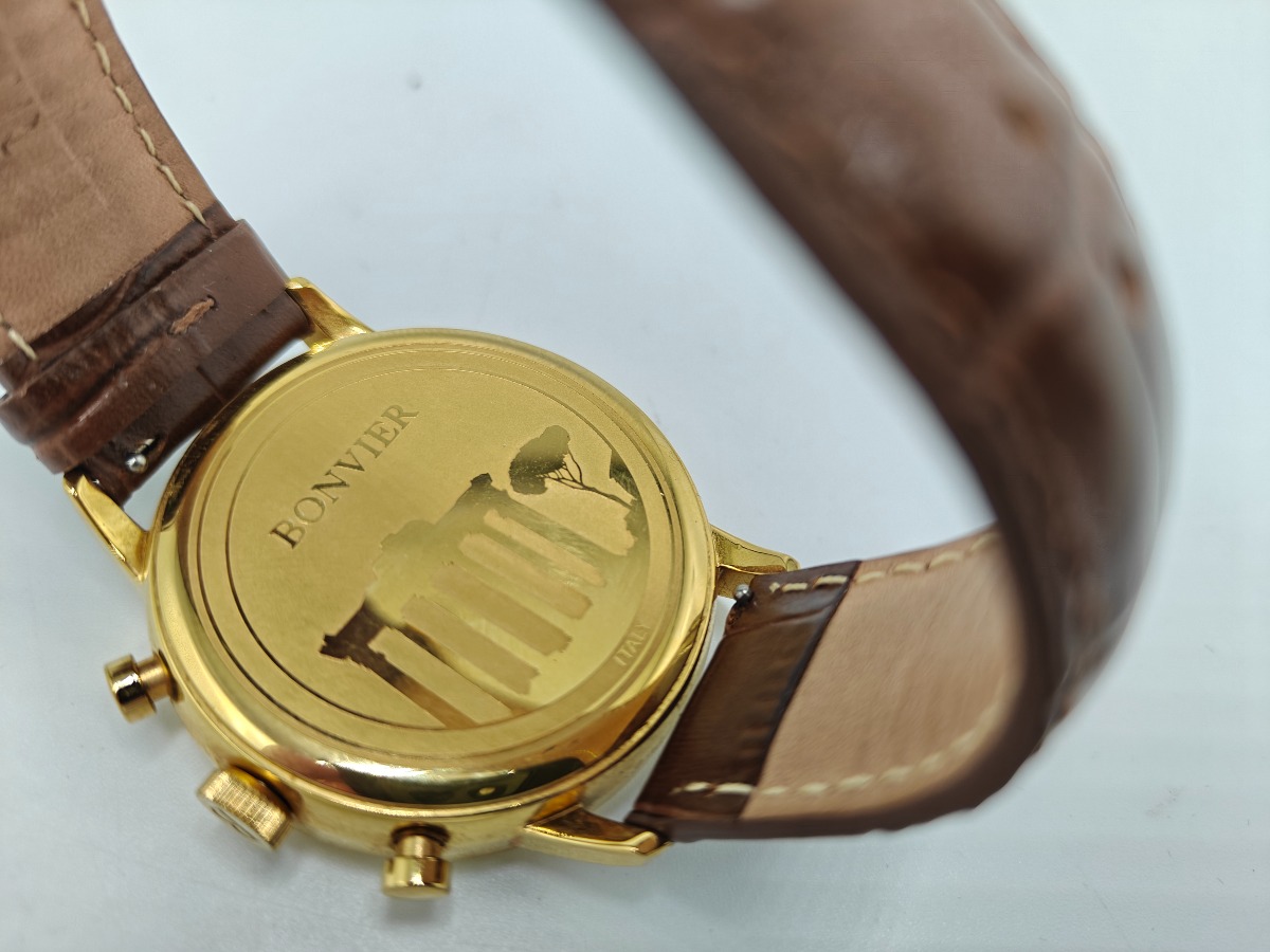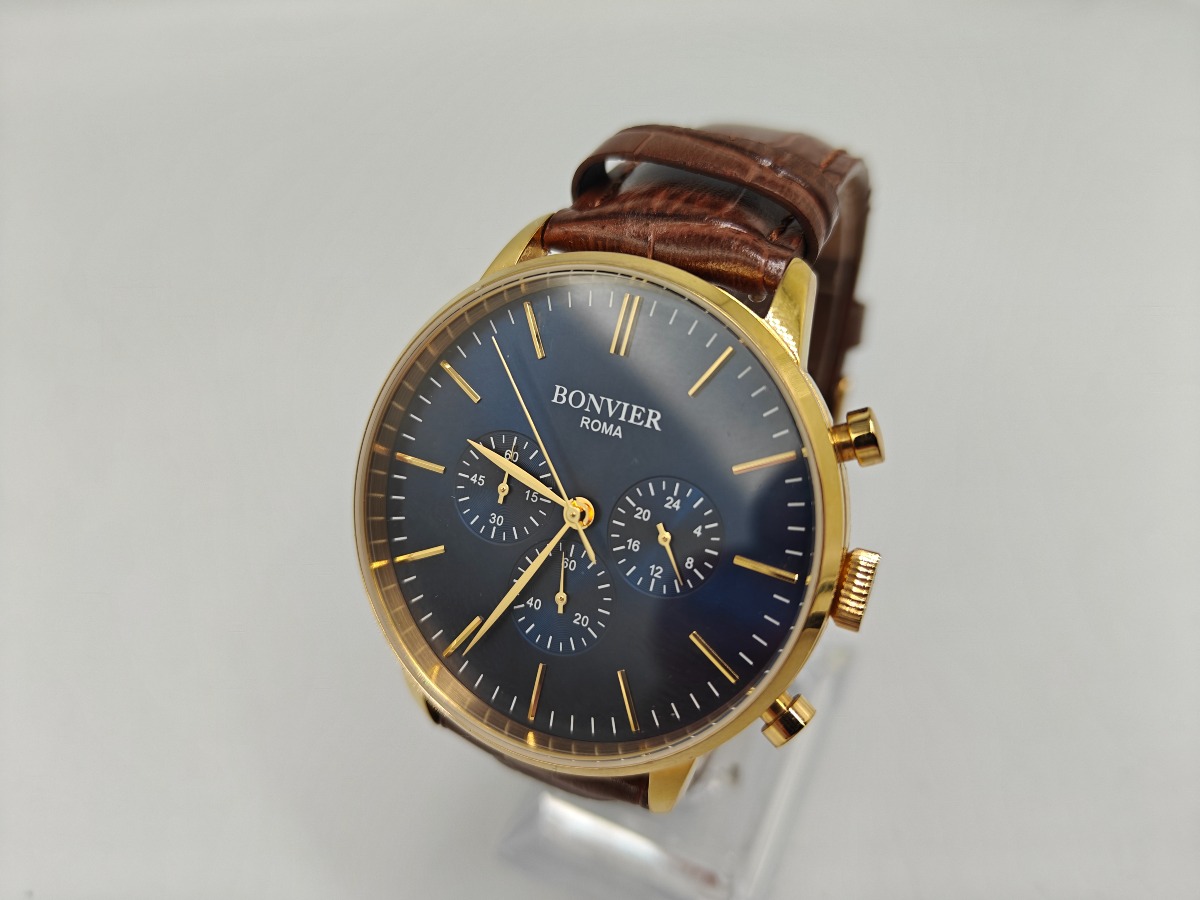 Bonvier herreur i gylden kasse og med blå skive. Monteret med krokopræget rem.