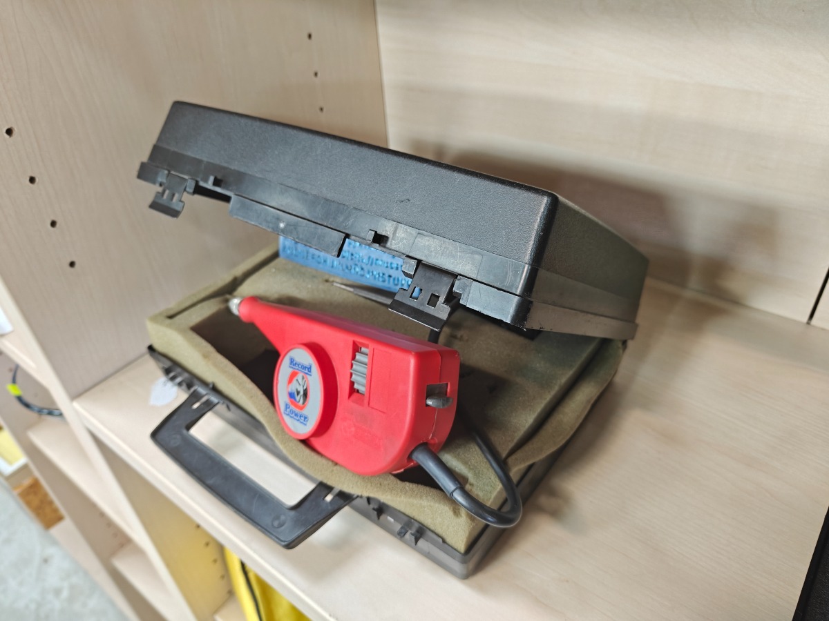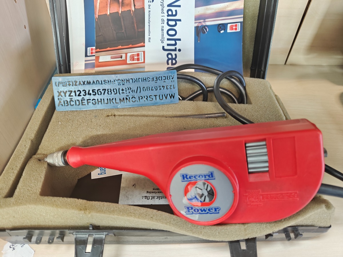 Elektrisk gravørpen med tilbehør samt kuffert til opbevaring.