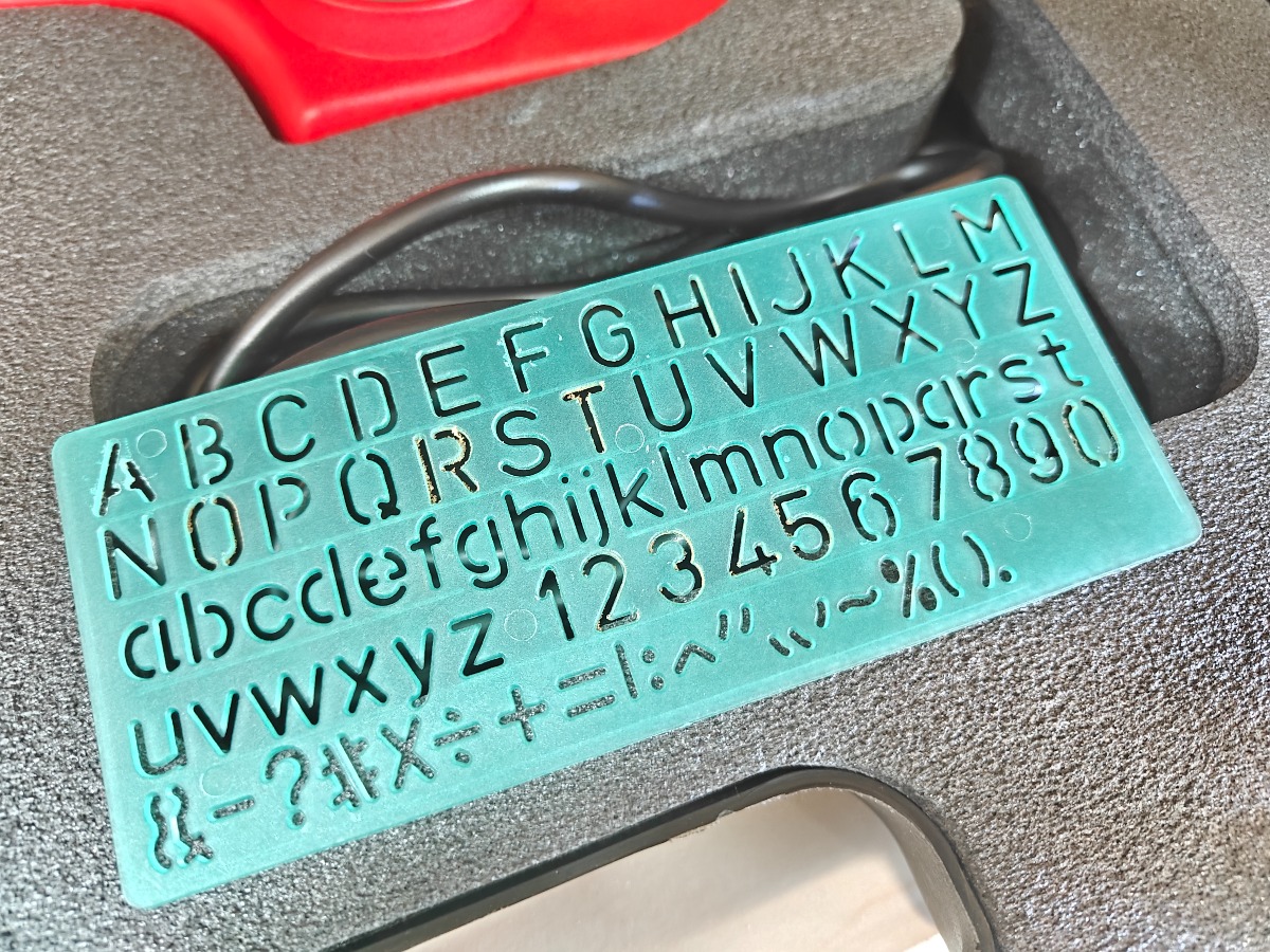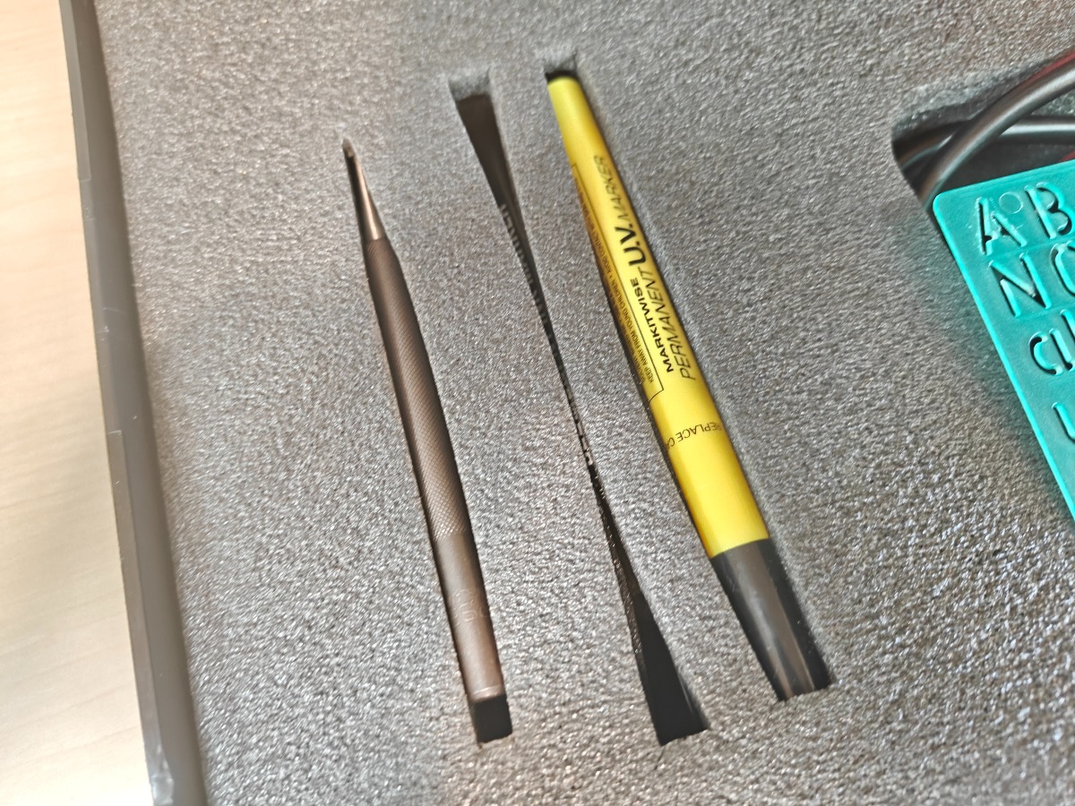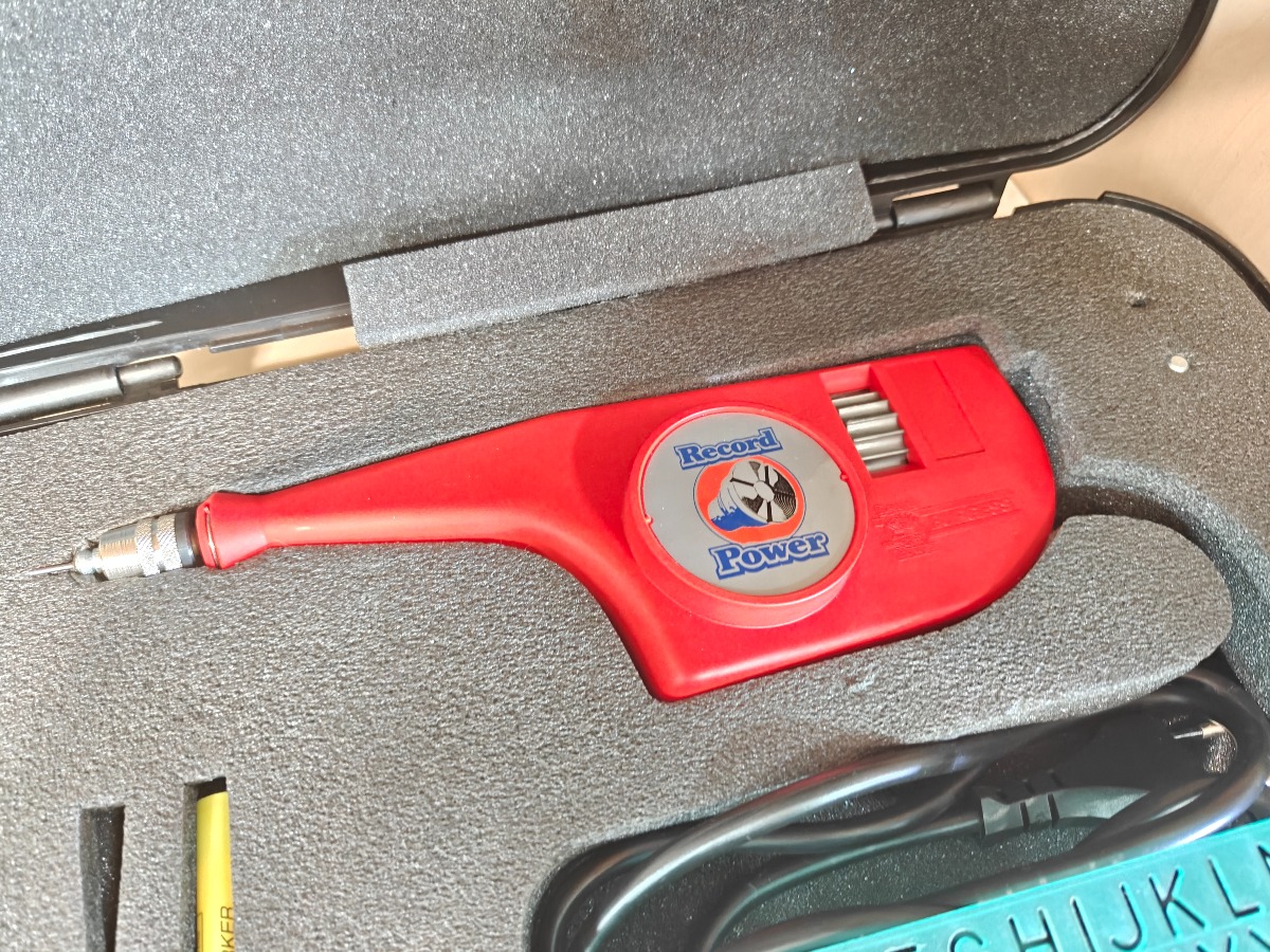 Elektrisk gravørpen med tilbehør samt kuffert til opbevaring.