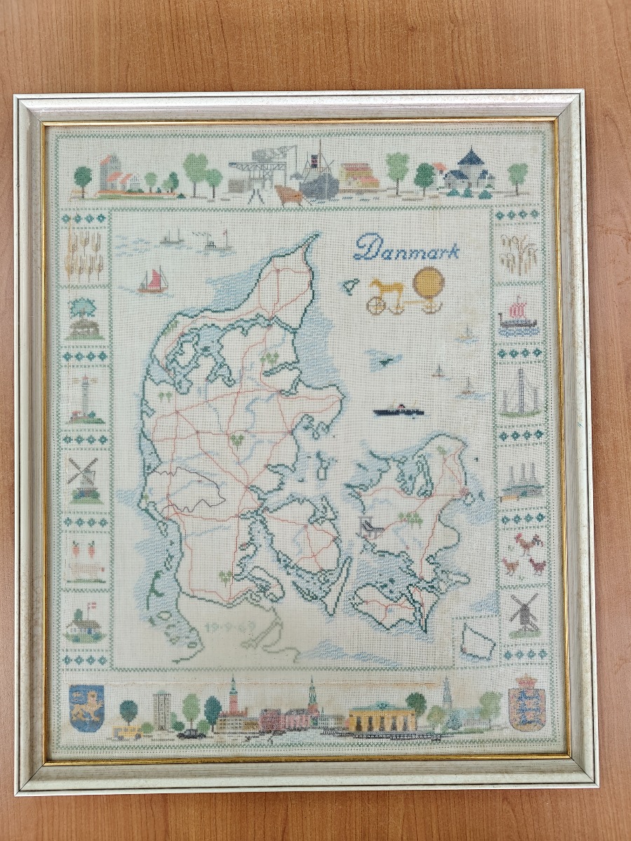 Korsstingsbroderi af Danmark. Indrammet bag refleksfrit glas.