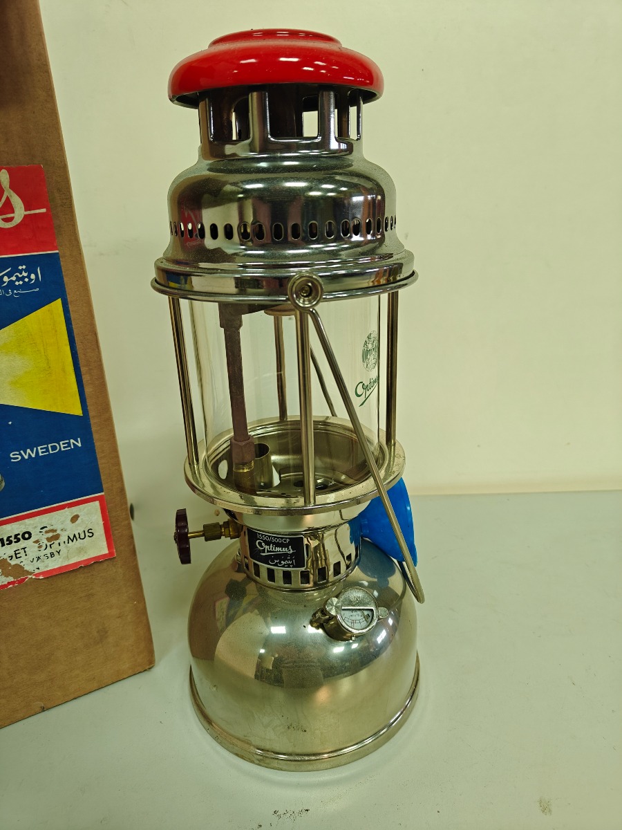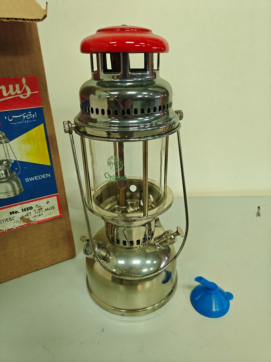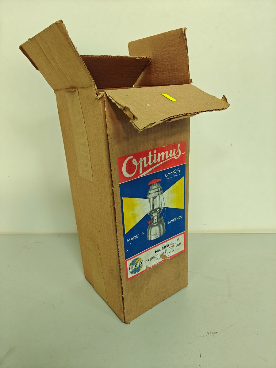 Optimus 1550 petroleumslampe med original kasse og tilbehør.
