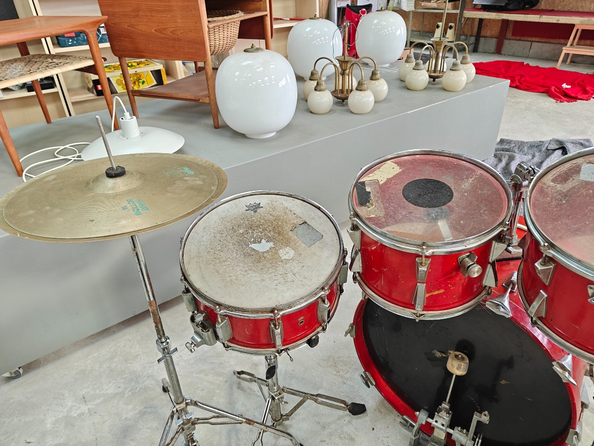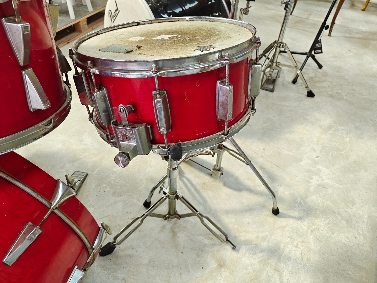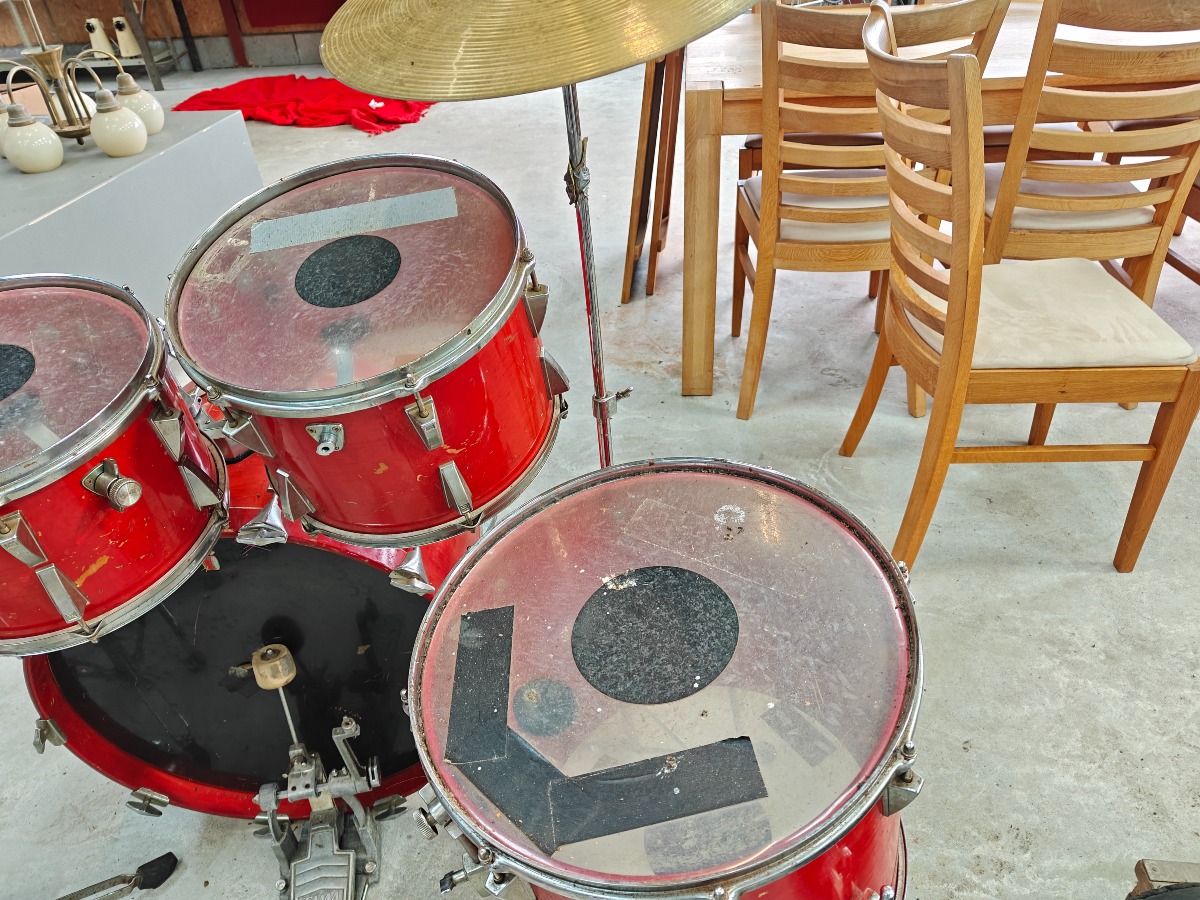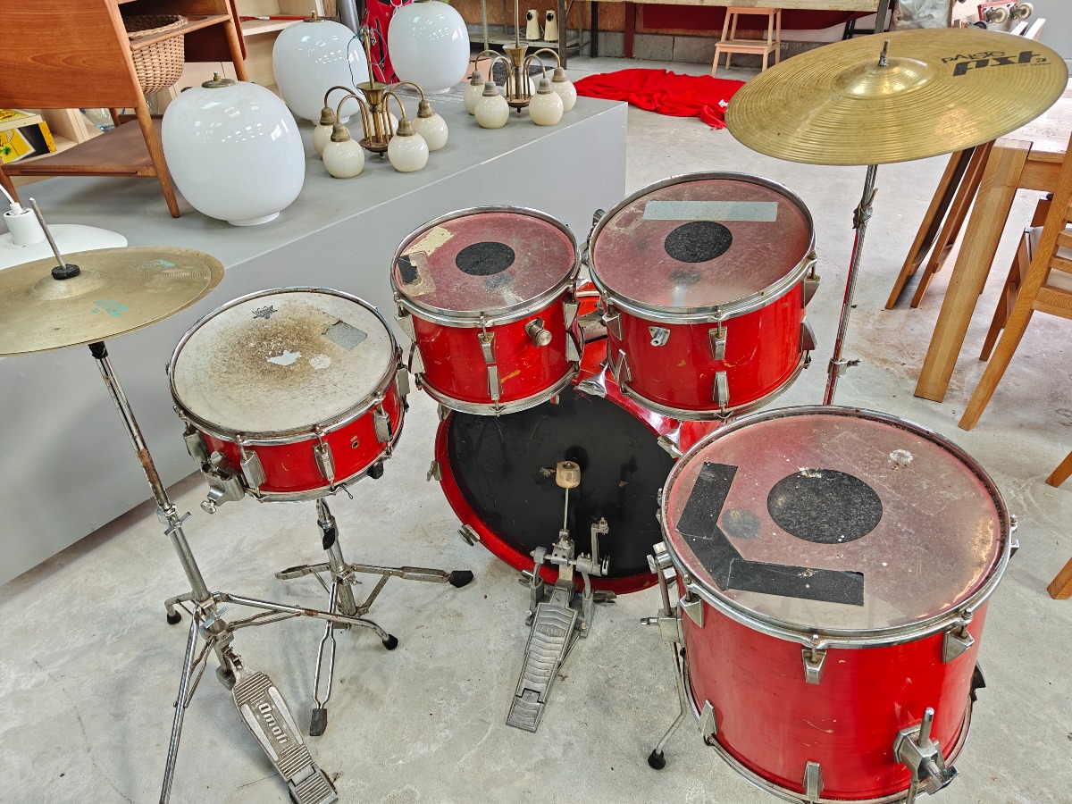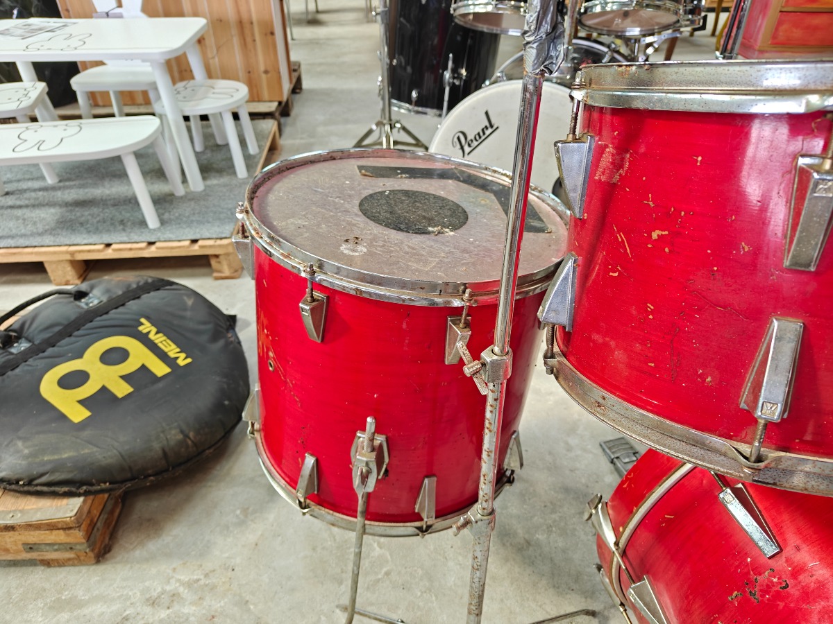 Rødt trommesæt. Ukendt fabrikat. Kraftige brugsspor. Rust på forkromede dele. Mangler og defekter forekommer.