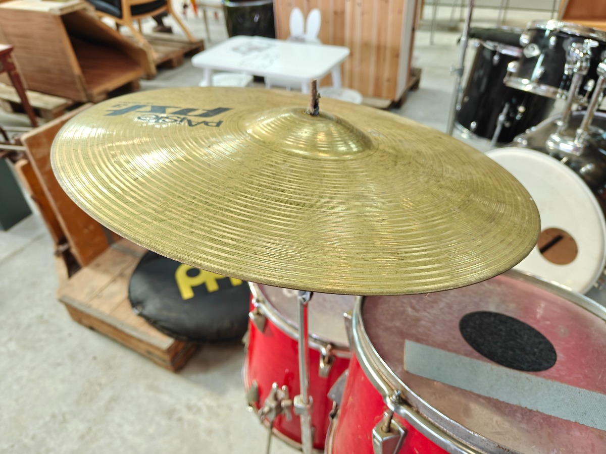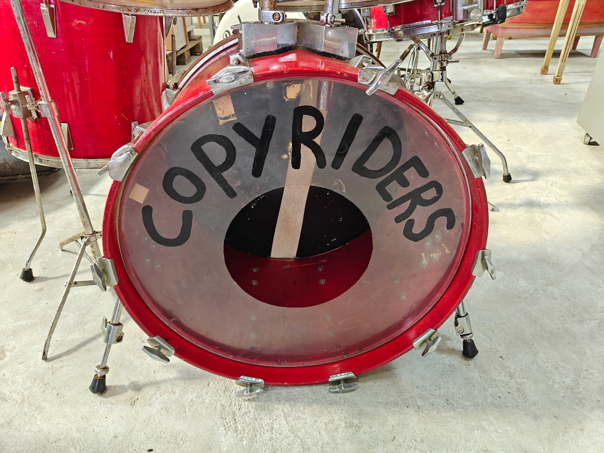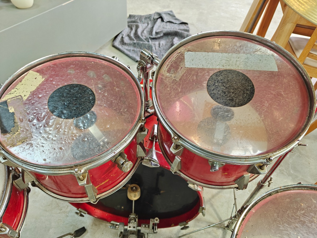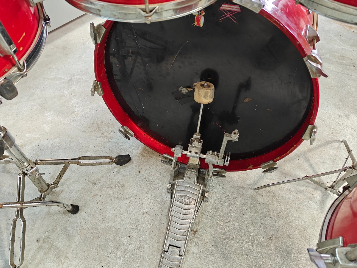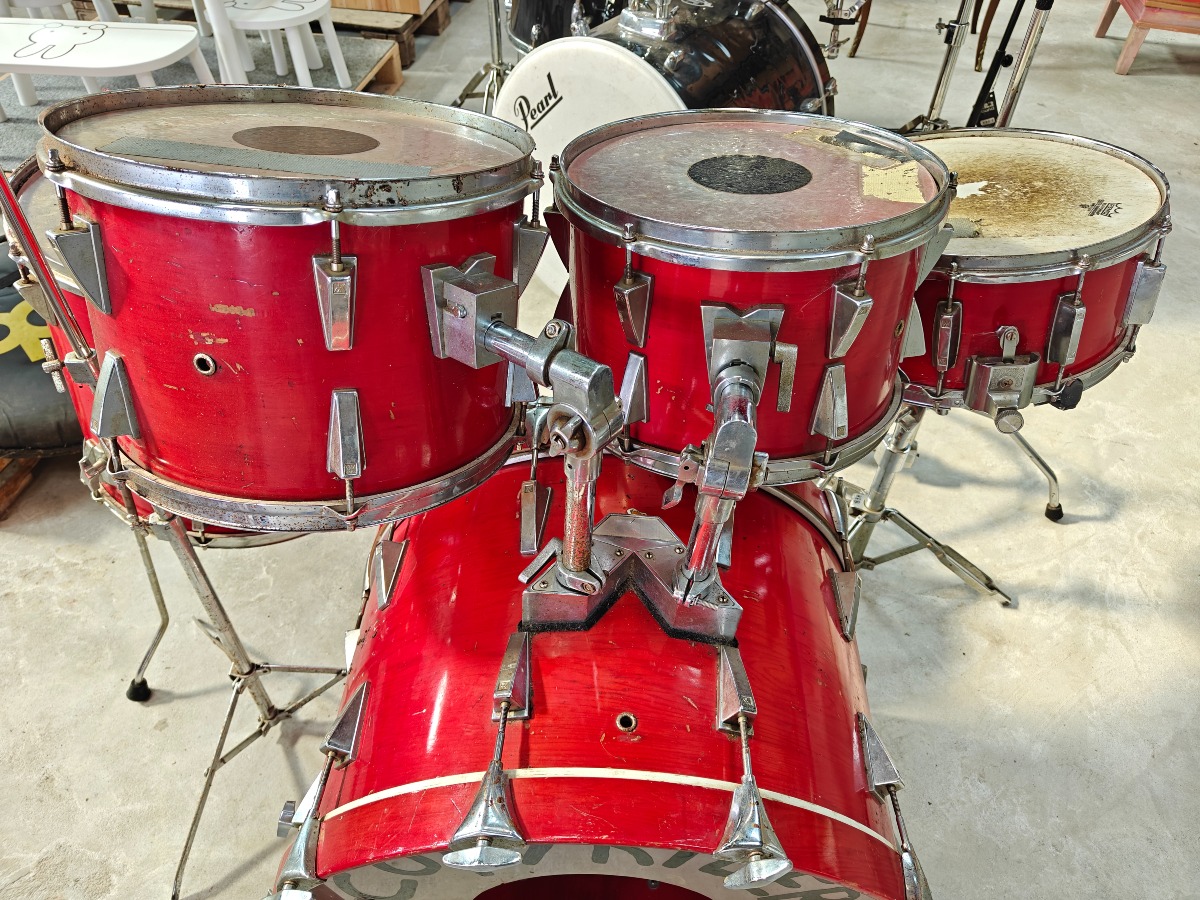 Rødt trommesæt. Ukendt fabrikat. Kraftige brugsspor. Rust på forkromede dele. Mangler og defekter forekommer.