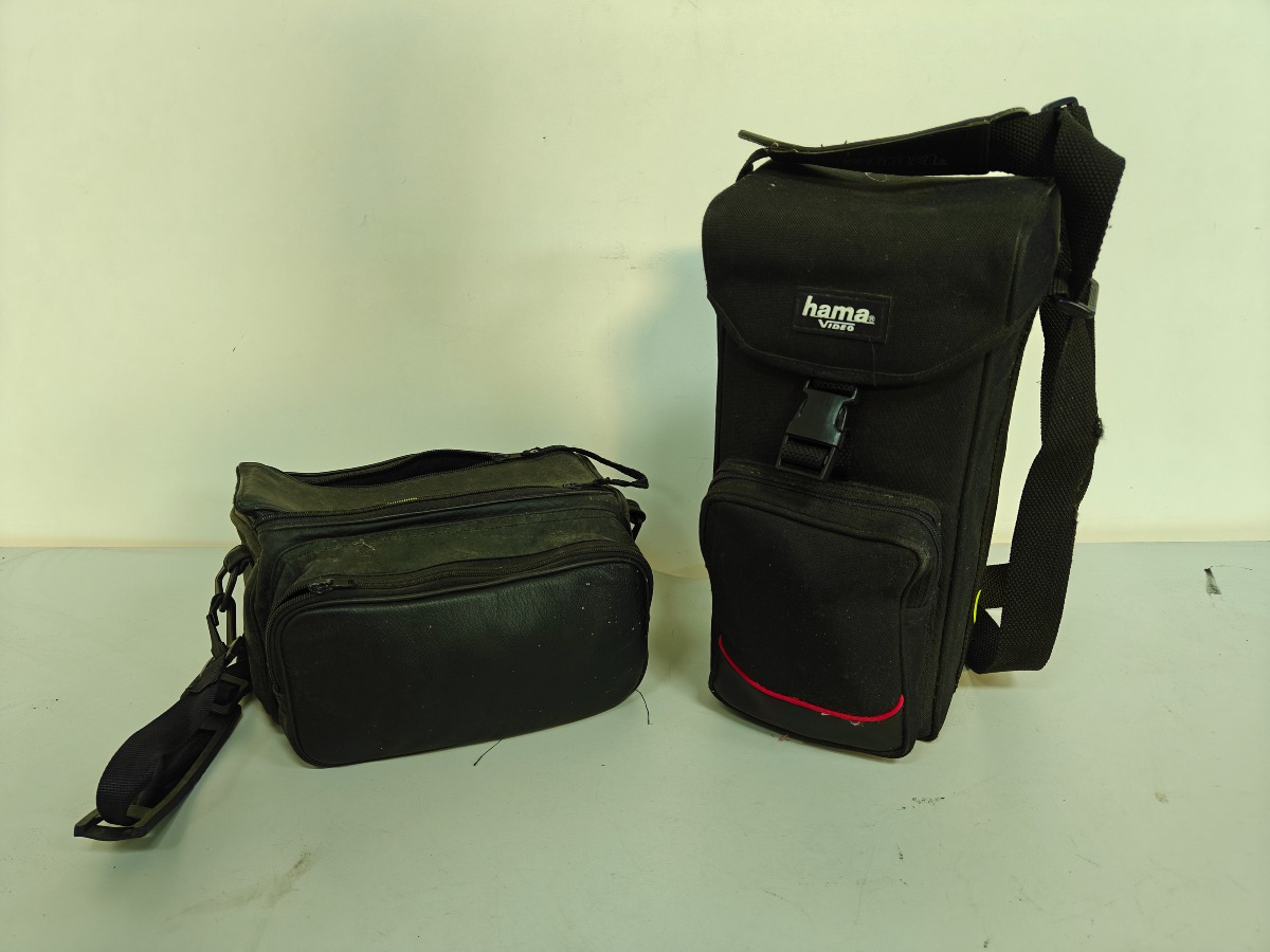 Sony og Bauer Video8 kameraer med opladerere, batterier m.m. samt transporttasker.