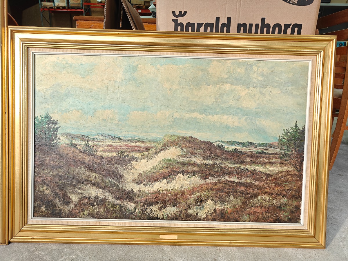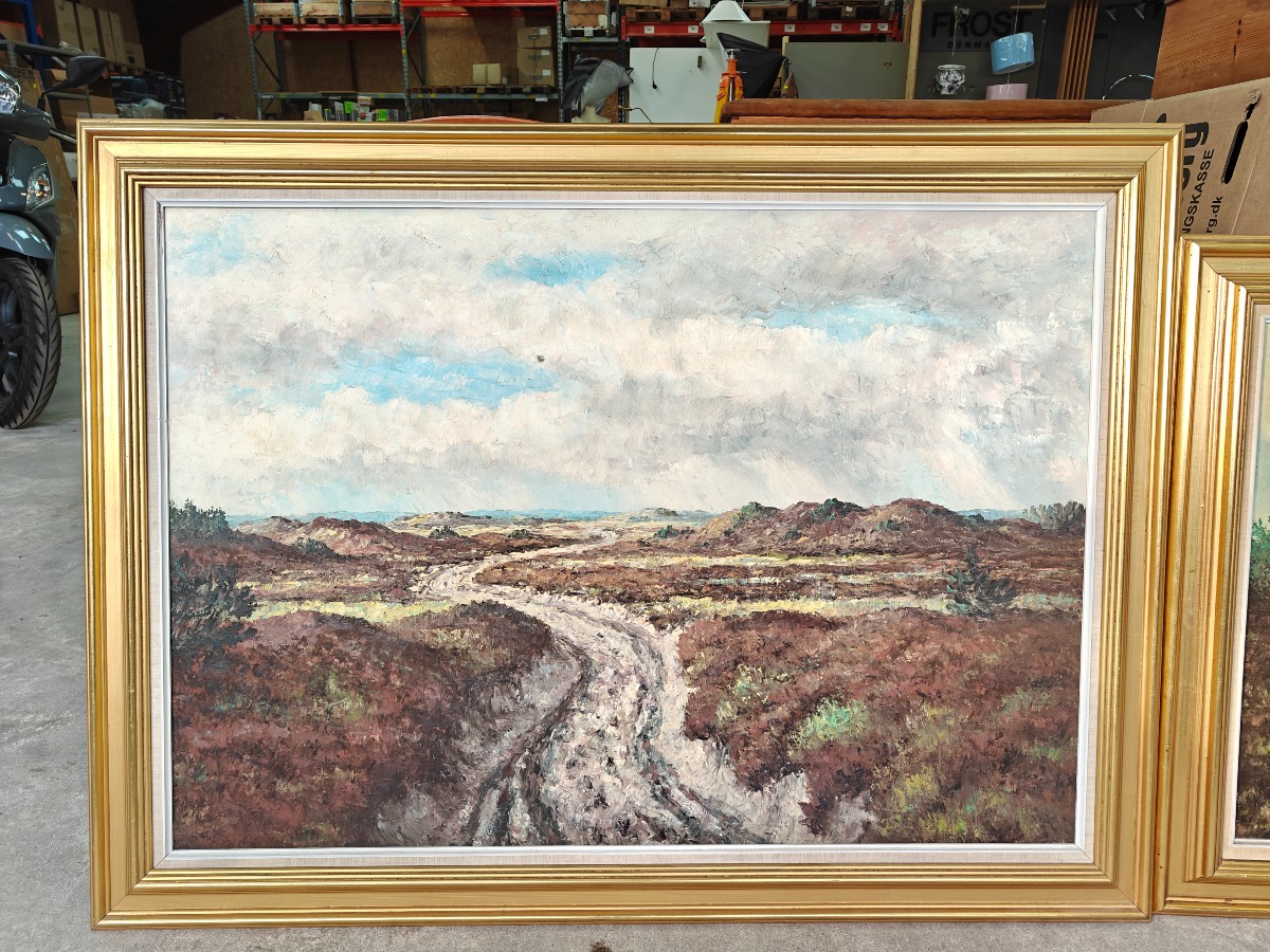 Ubk. kunstner 2 malerier med hedelandskab. Olie på lærred. Ene med skade.