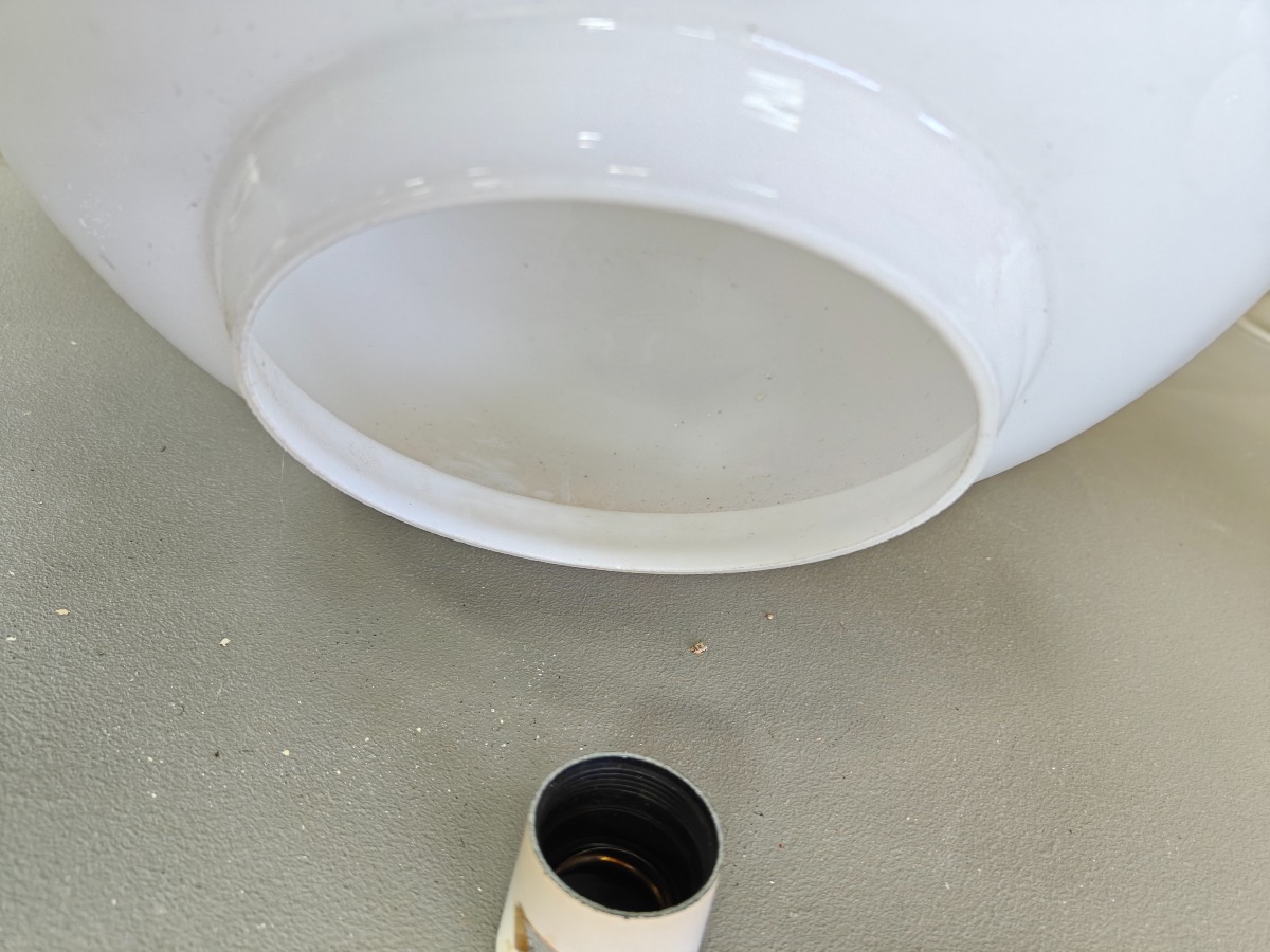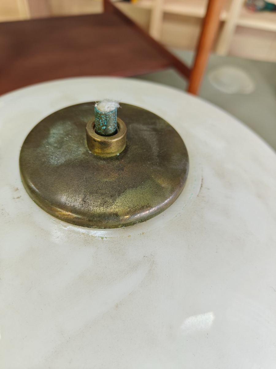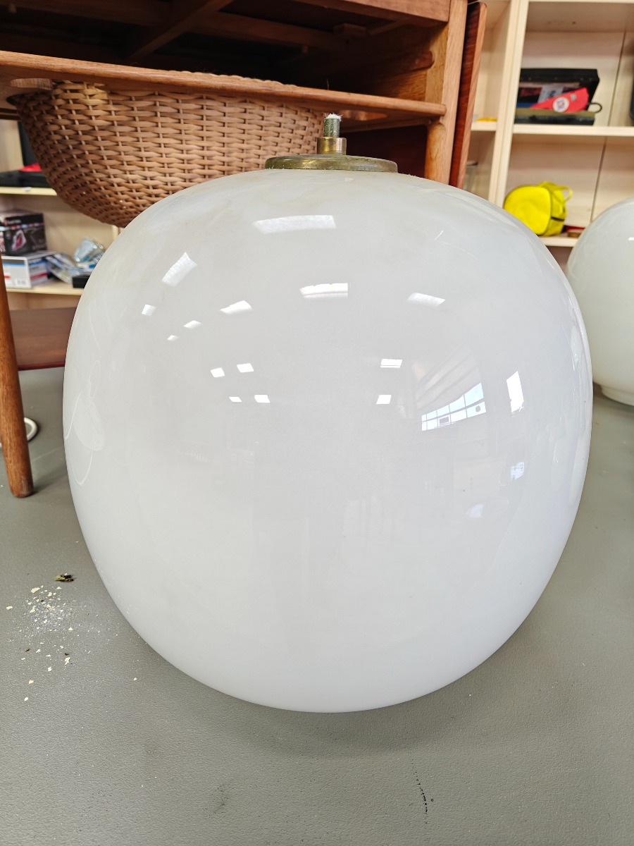 Vilhelm Lauritzen. Radiohus pendel af hvidt opalglas. Montering af messing fremstår anløben. Fremstillet hos Louis Poulsen. Højde eksklusiv montering 37 cm. Små kanthak ved åbning kan forekomme. Fatning muligvis defekt.