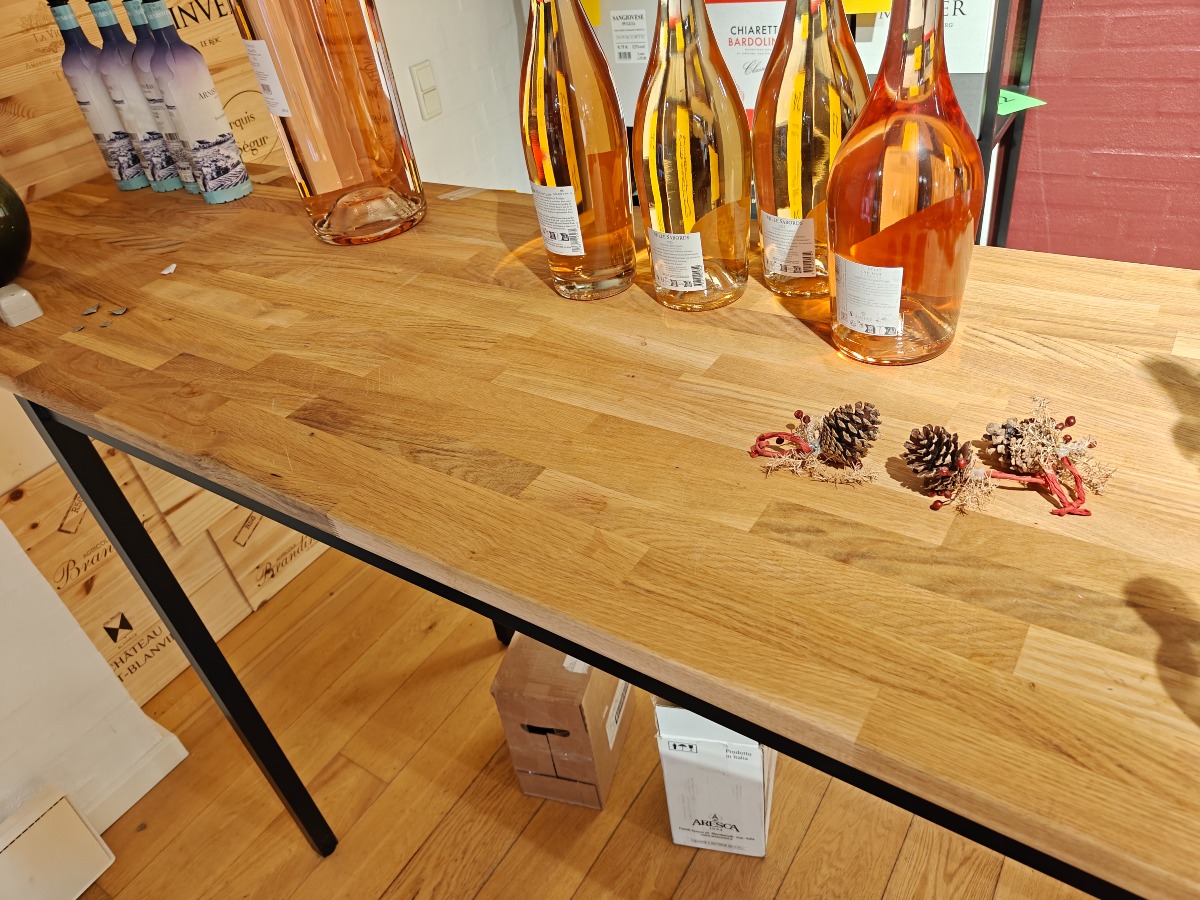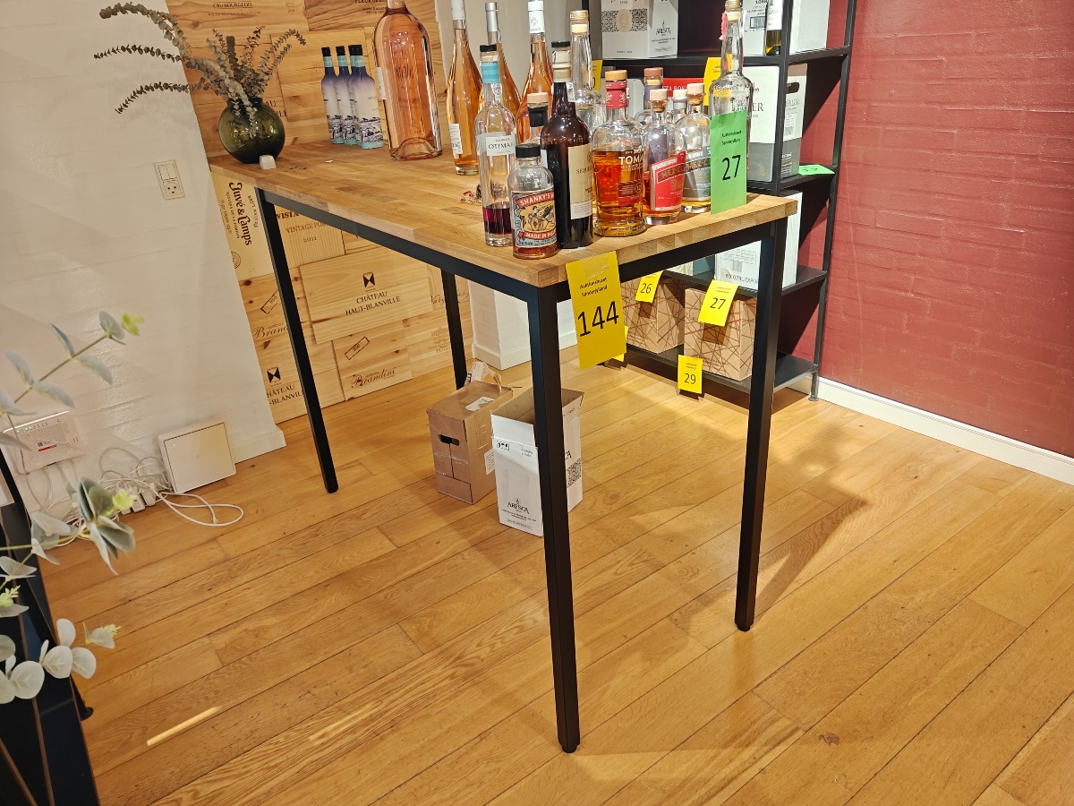 Højbord med sortlakeret jernstel. Monteret med massiv topplade af eg. 106 x 205 x 60 cm. Inventaret er brugt og med forventelige brugsspor.