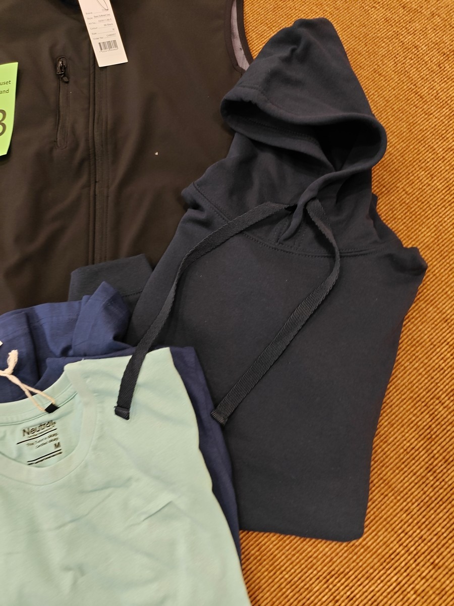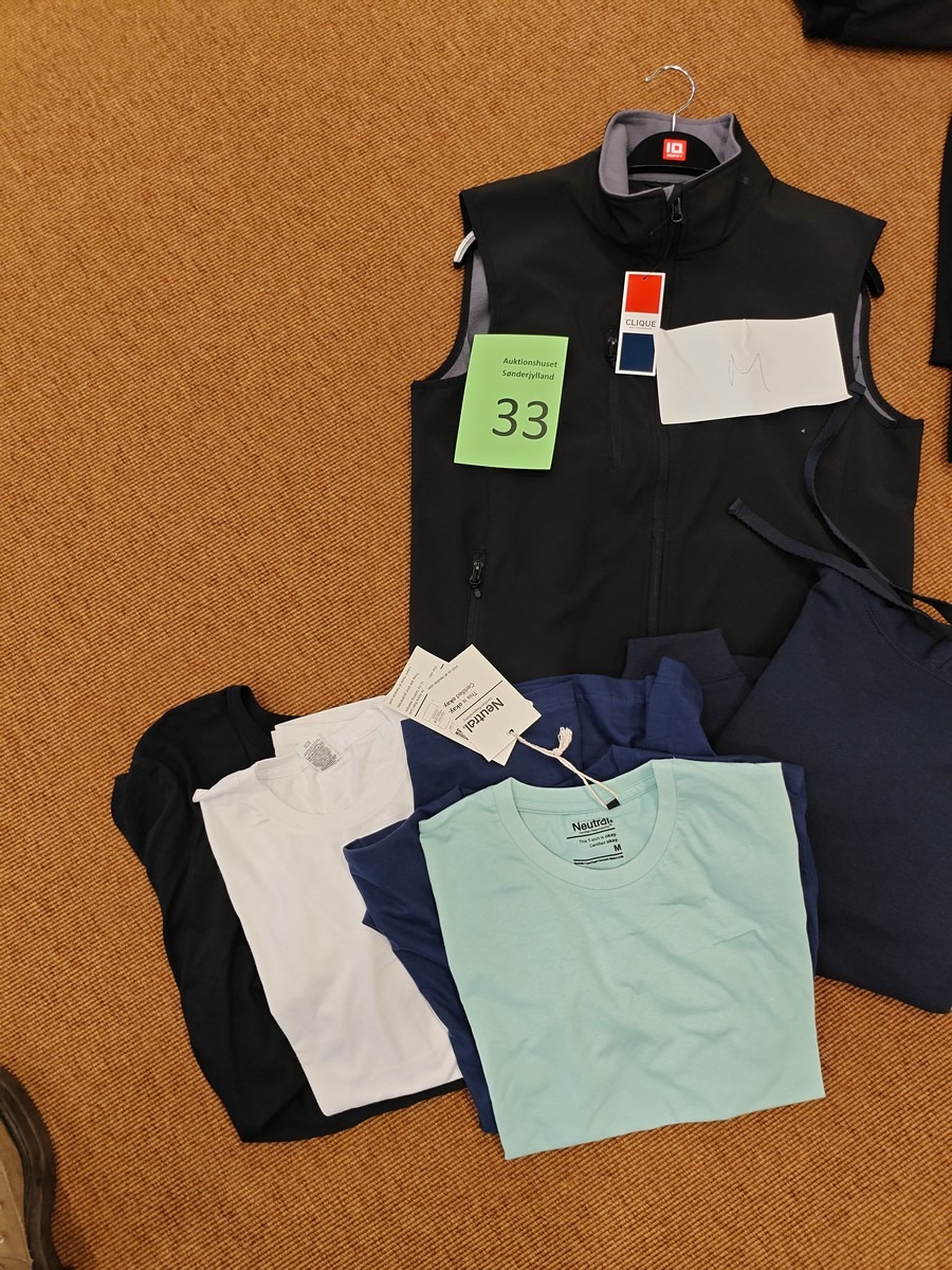 Herre basic tøj str. M. Vest, hoodie og 4 stk. t-shirt. Dansk kvalitet. Oprydning for virksomhed. Ubrugt.