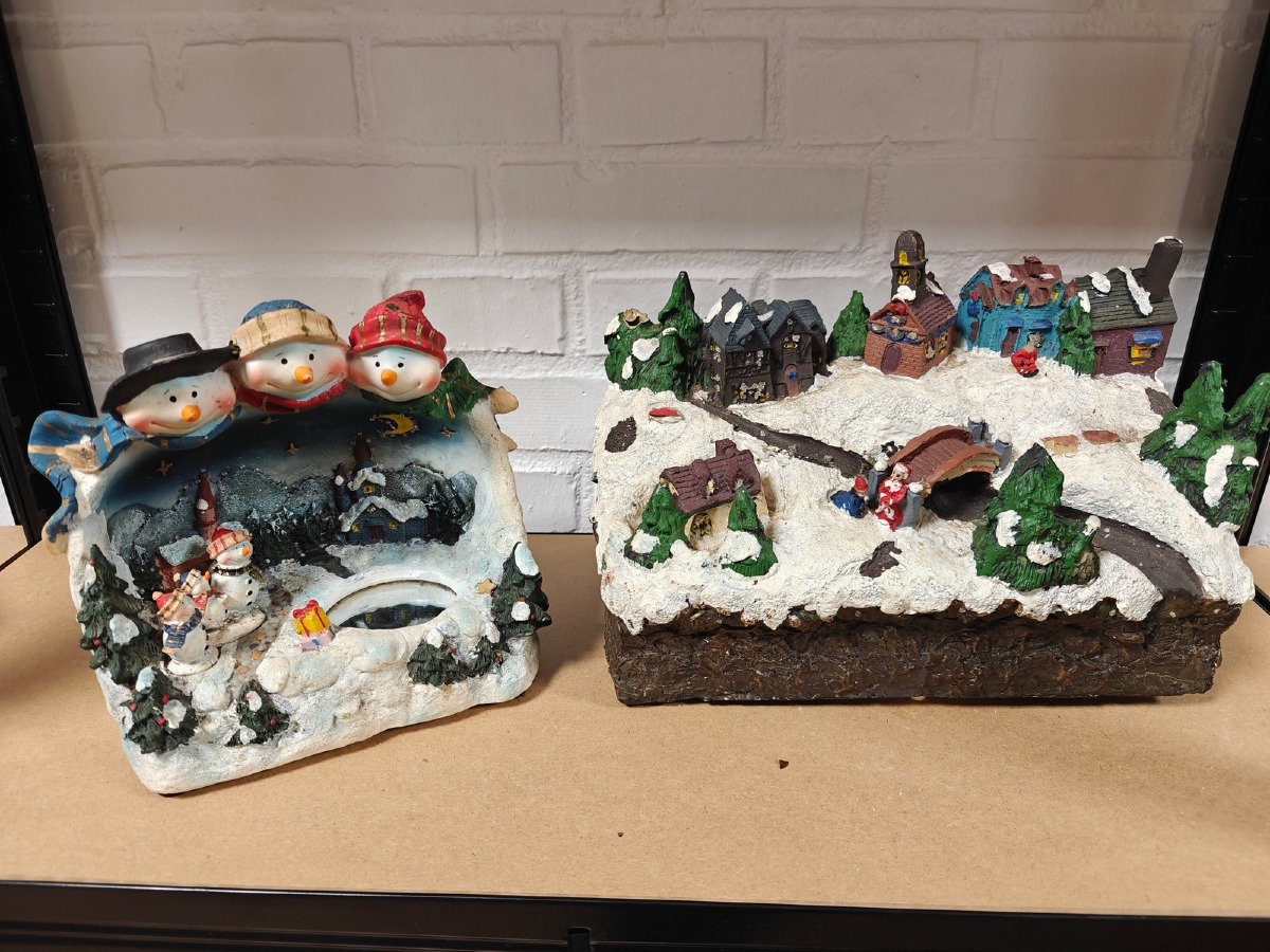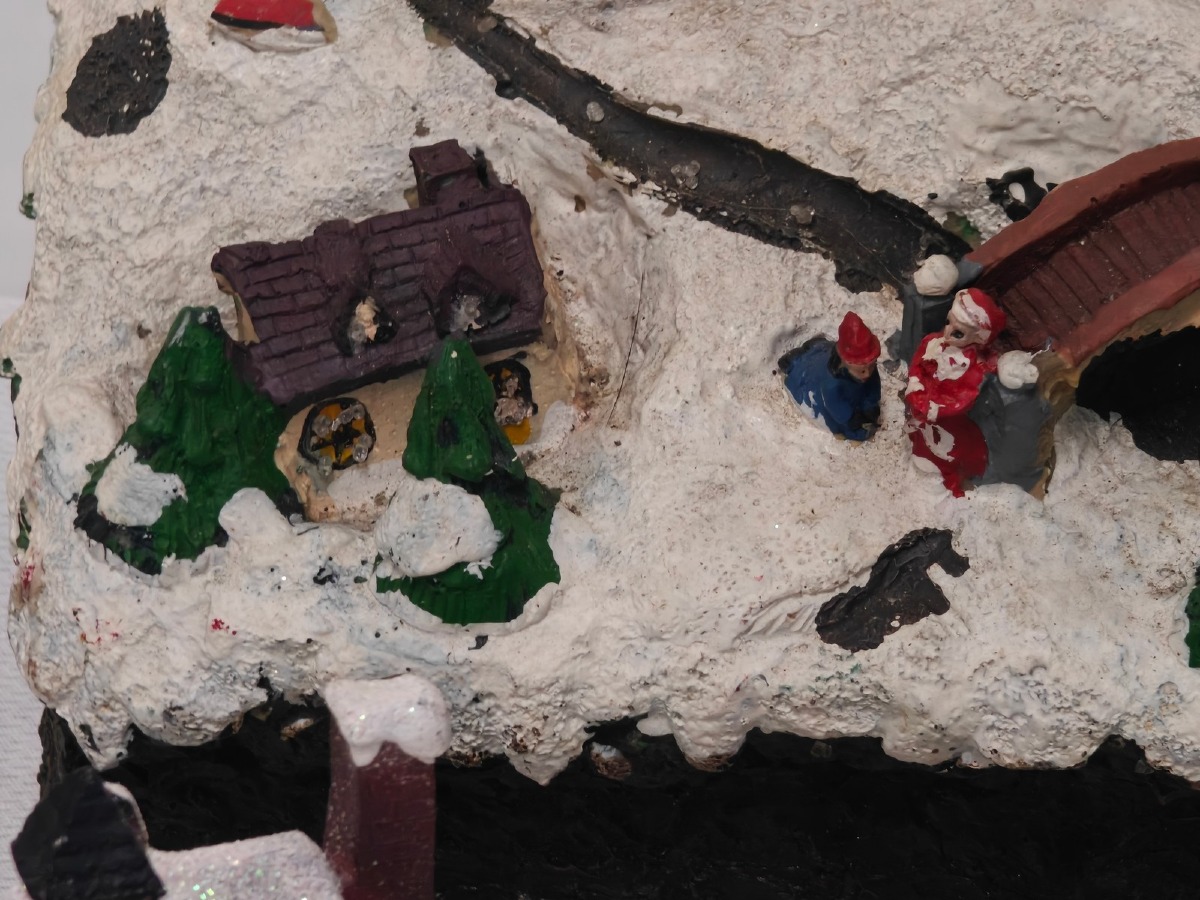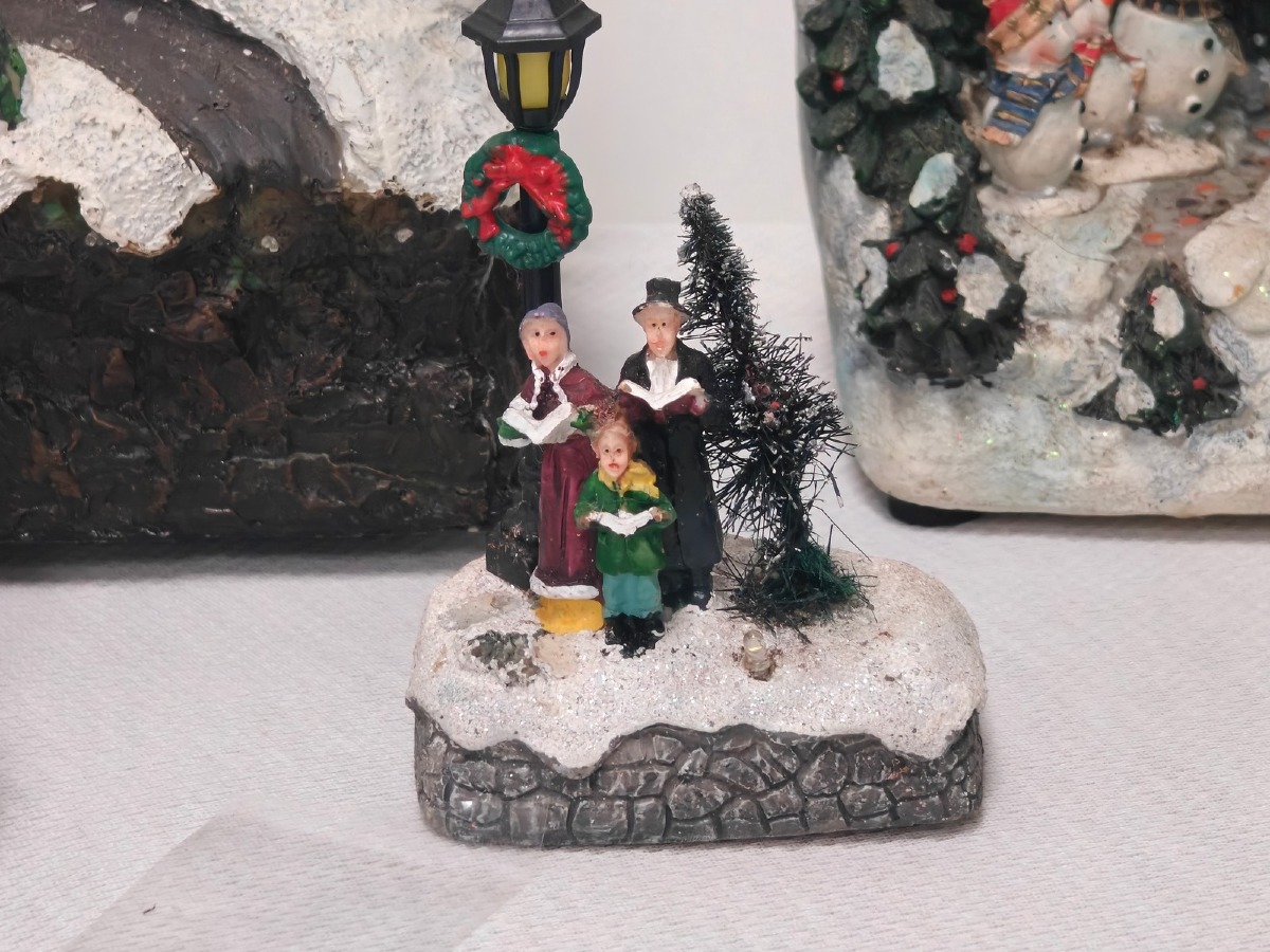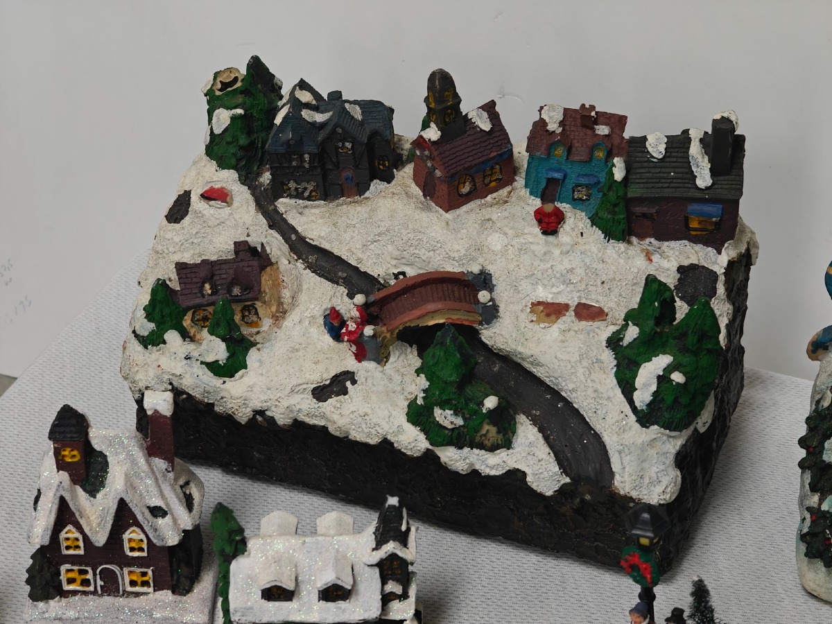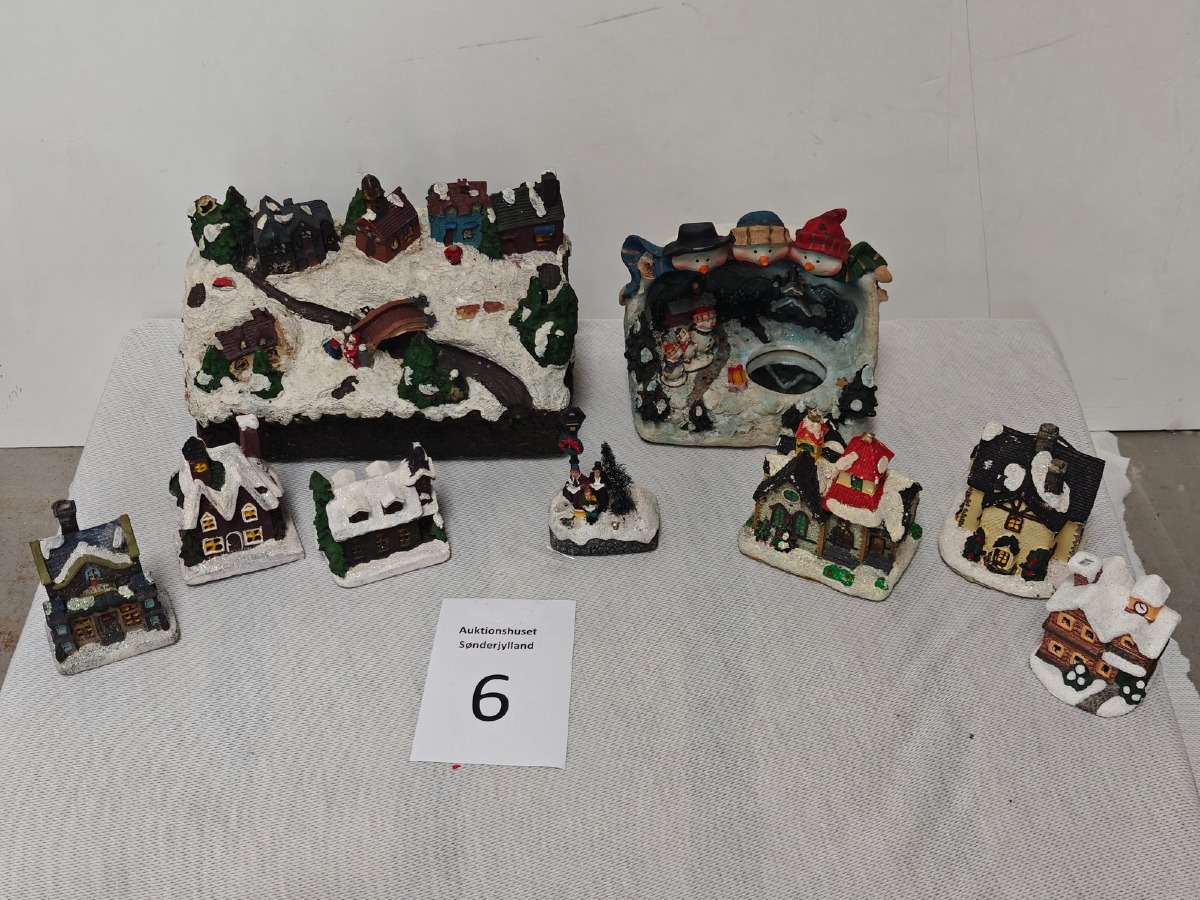 Juleby. Udført med mange fine detaljer. De 2 store figurer er til batteri for lys og/eller lydeffekt, men funktionaliteten af disse er ikke testet ved indskrivning. Brugt.