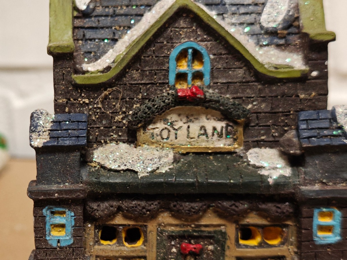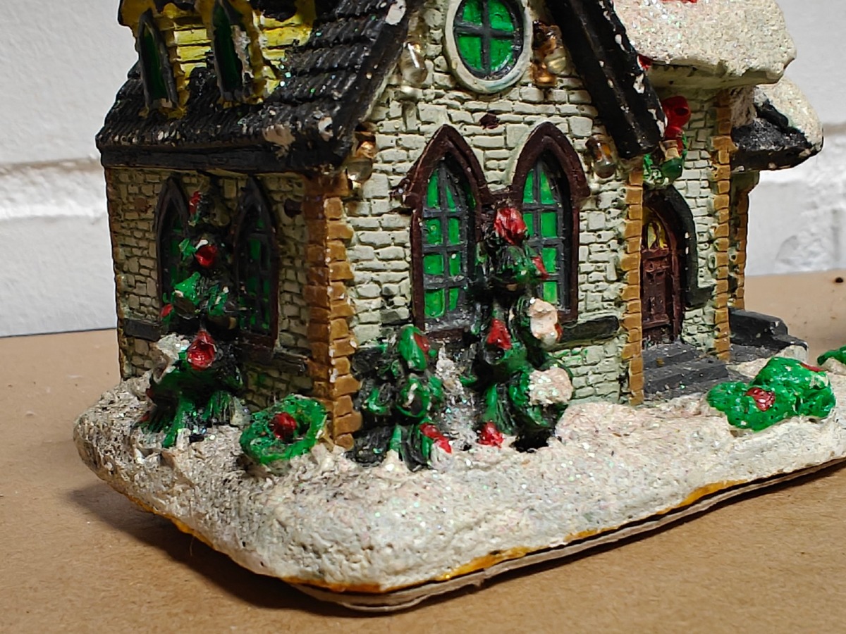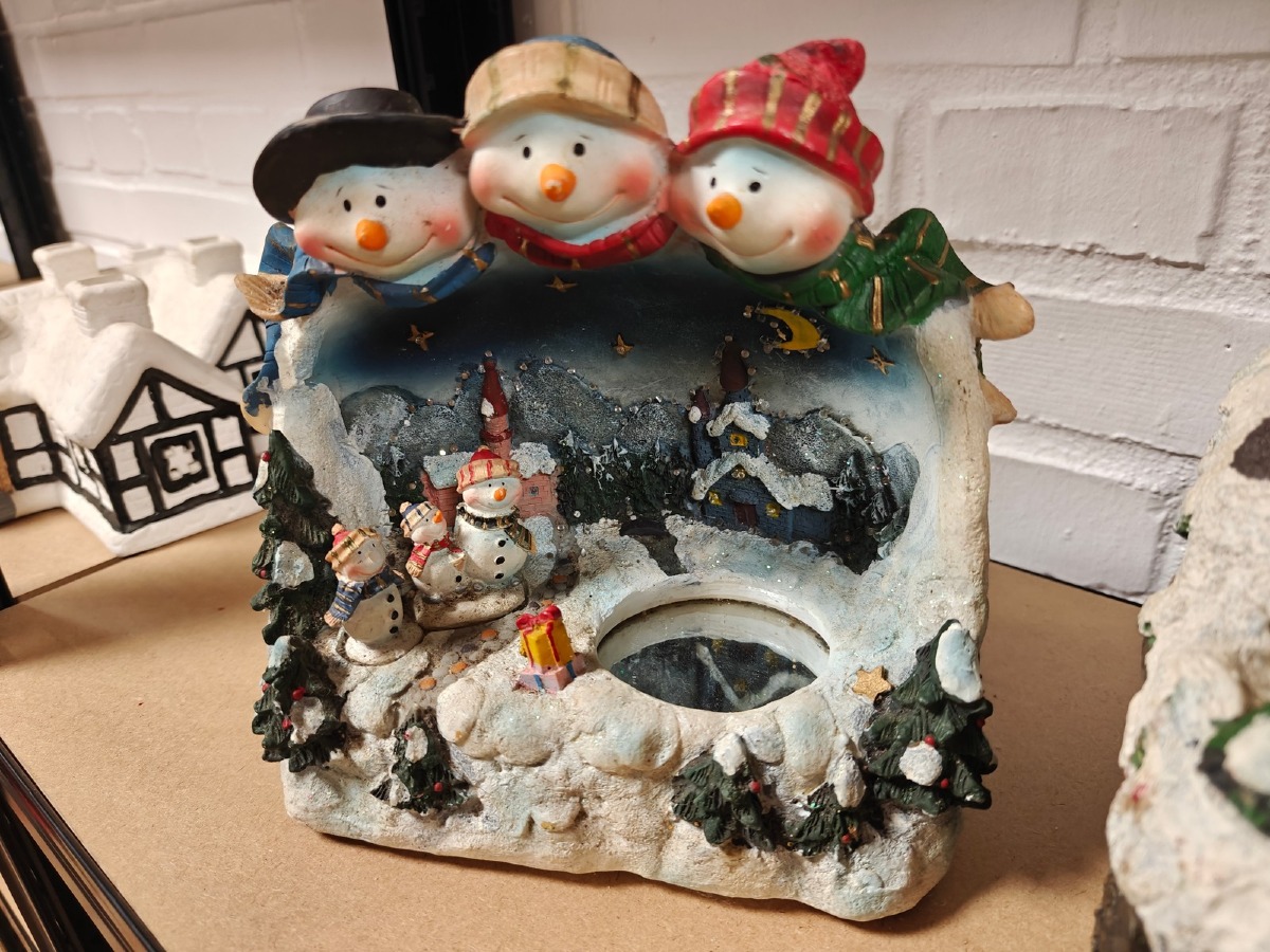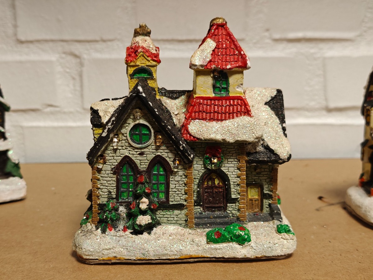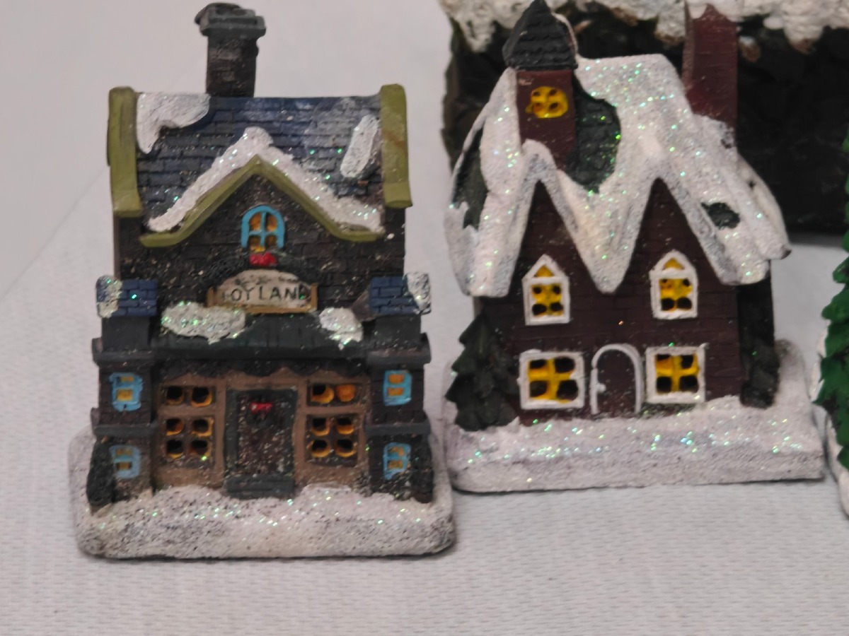 Juleby. Udført med mange fine detaljer. De 2 store figurer er til batteri for lys og/eller lydeffekt, men funktionaliteten af disse er ikke testet ved indskrivning. Brugt.