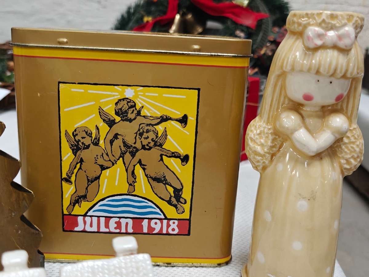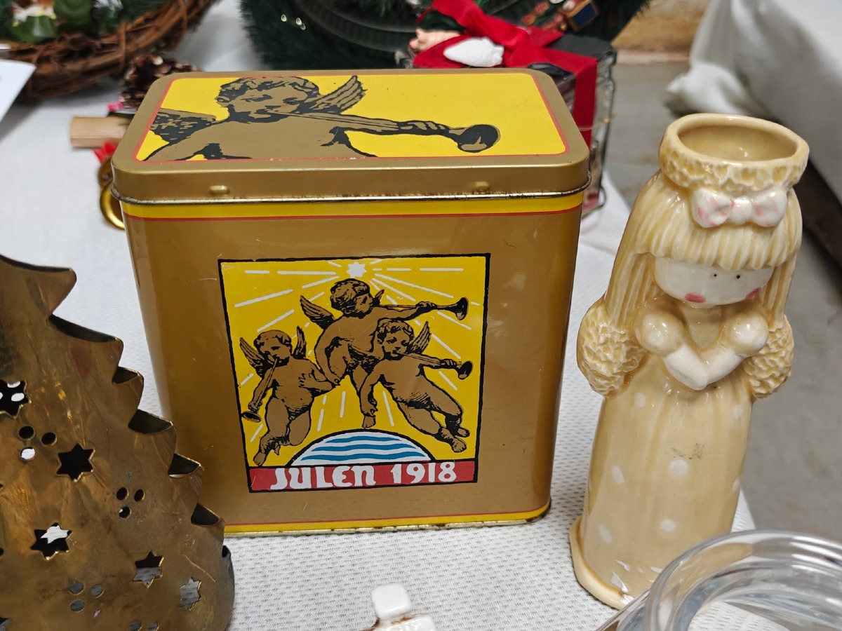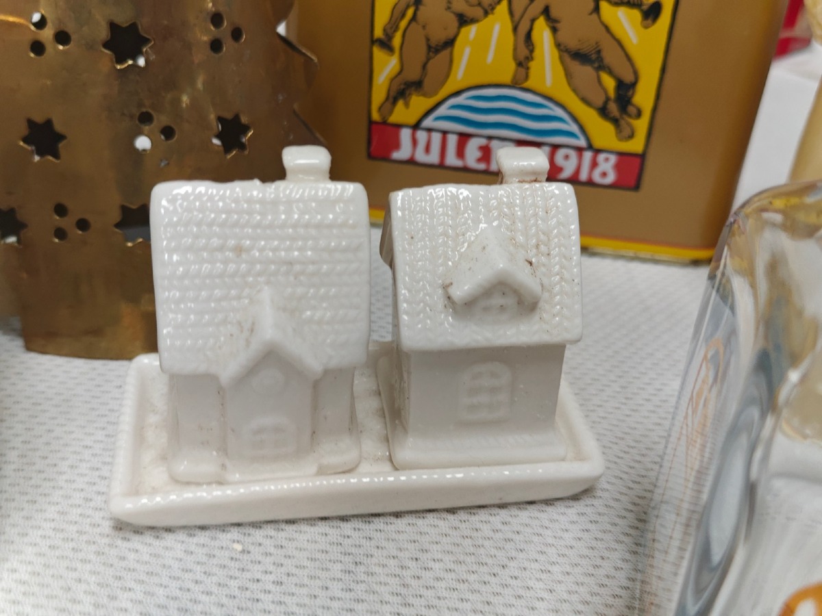 Julepynt: Retro kagedåse, krukke, salt & peber sæt, stager mm. Brugt.