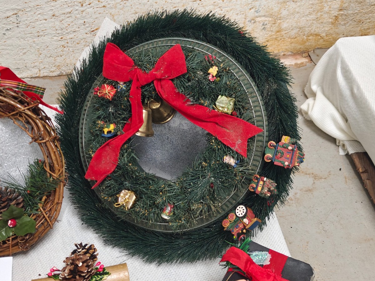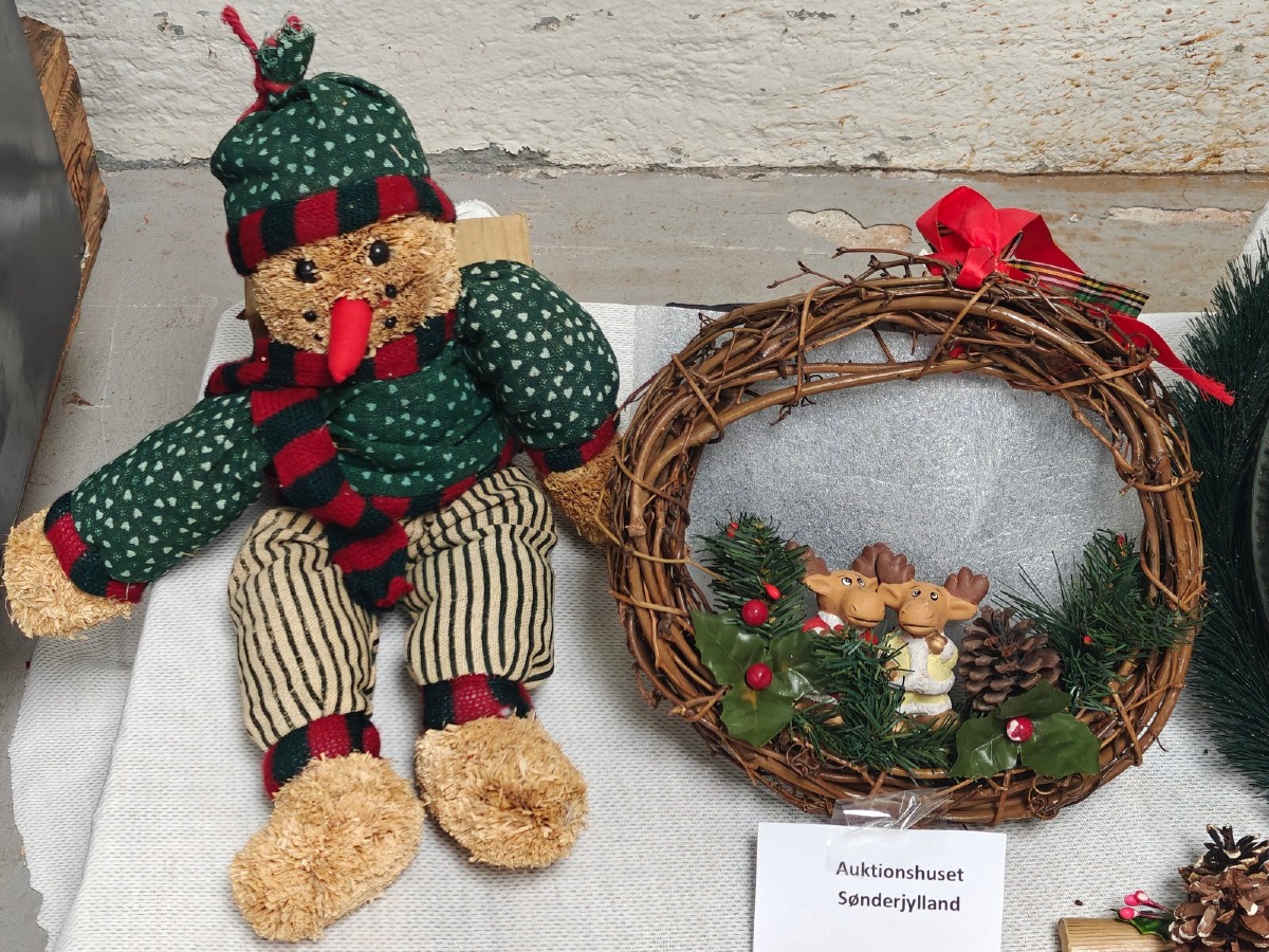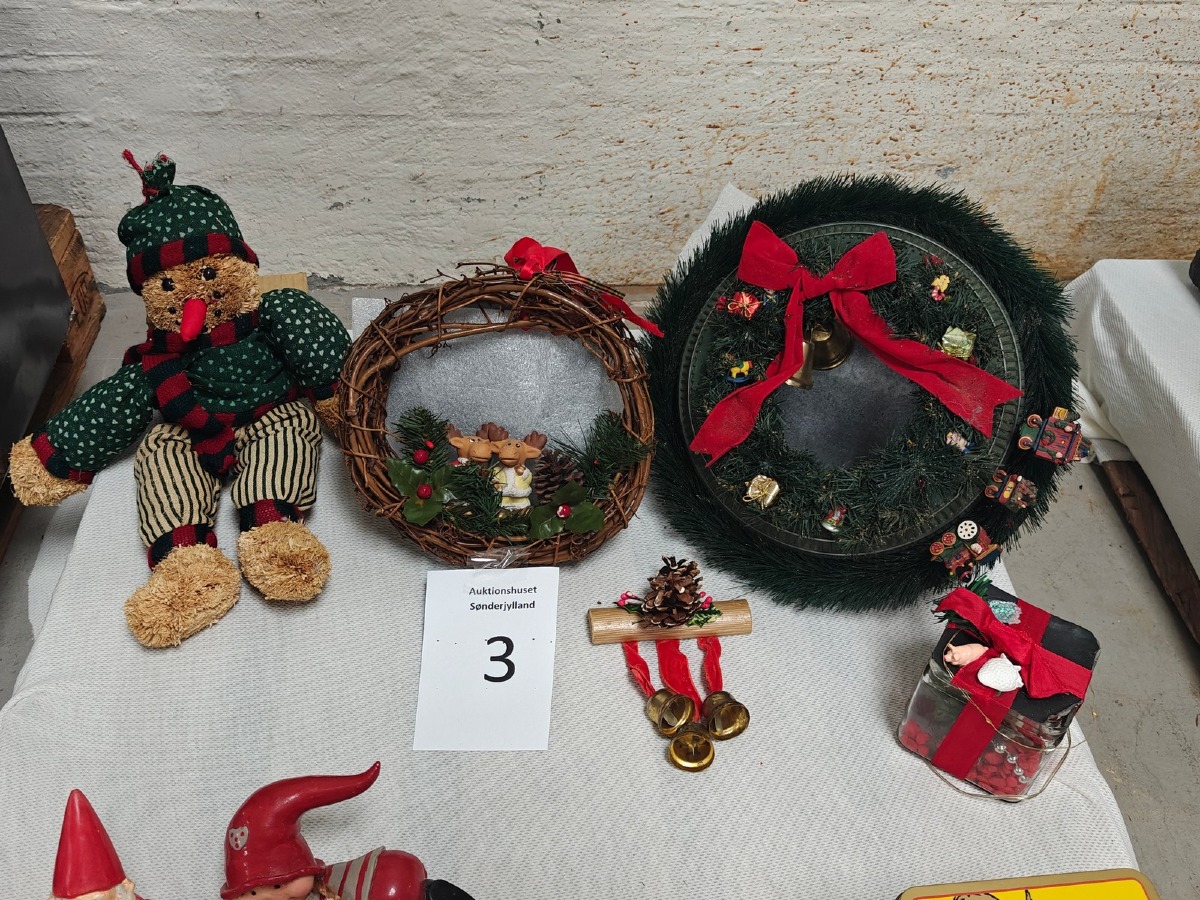 Retro: 2 dørkranse (stor krans: ø35 cm), 1 jule'bamse', 1 vægpynt & 1 krukke. Nogle af effekterne kan være til batteri for lys og/eller lydeffekter. Funktionaliteten af disse er ikke testet ved indskrivning. Brugt med brugsspor.