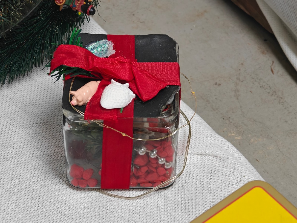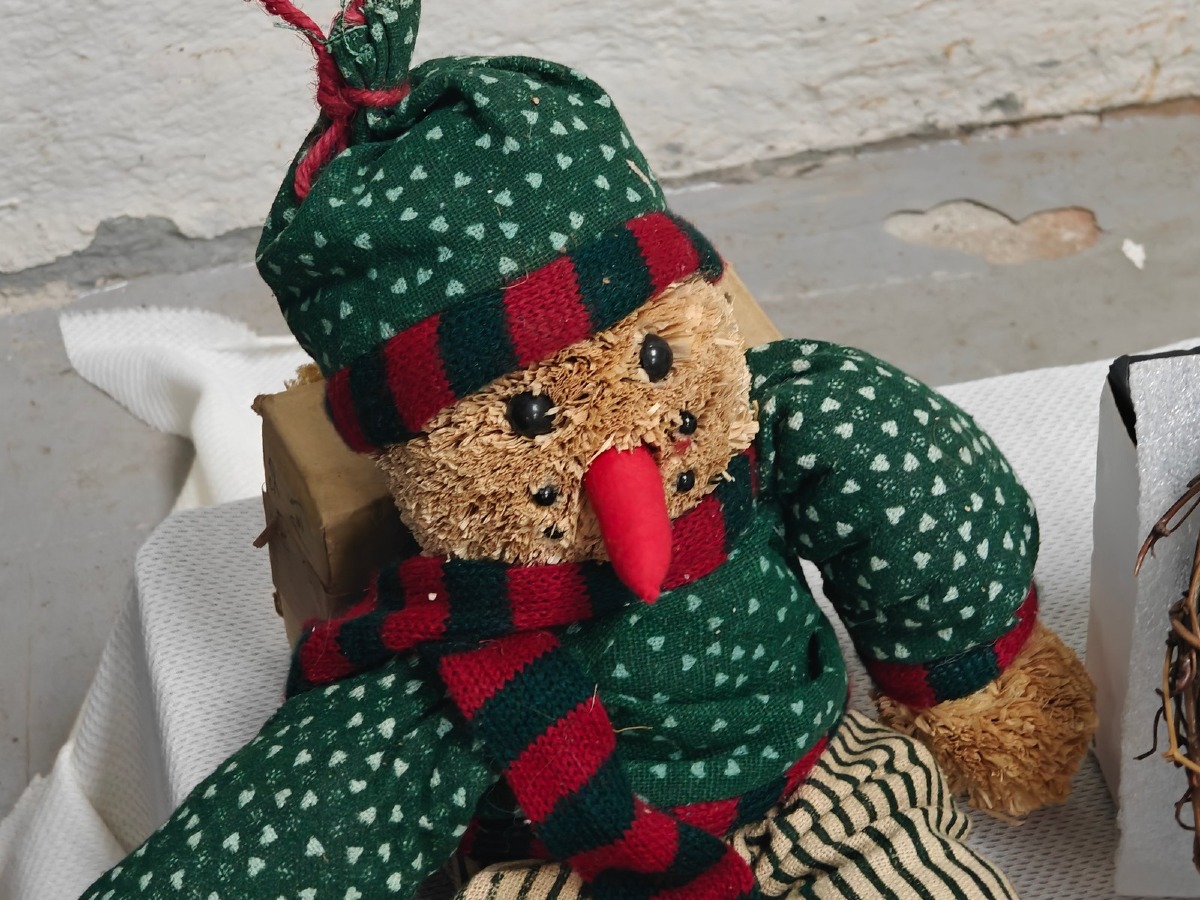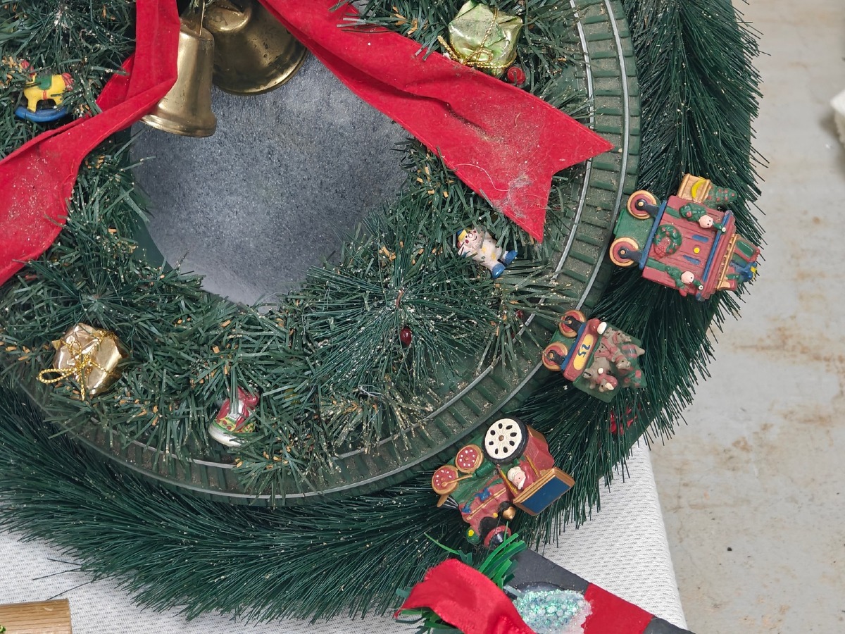Retro: 2 dørkranse (stor krans: ø35 cm), 1 jule'bamse', 1 vægpynt & 1 krukke. Nogle af effekterne kan være til batteri for lys og/eller lydeffekter. Funktionaliteten af disse er ikke testet ved indskrivning. Brugt med brugsspor.