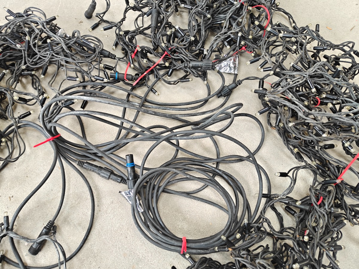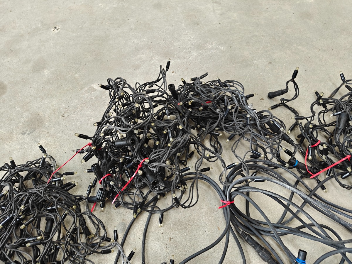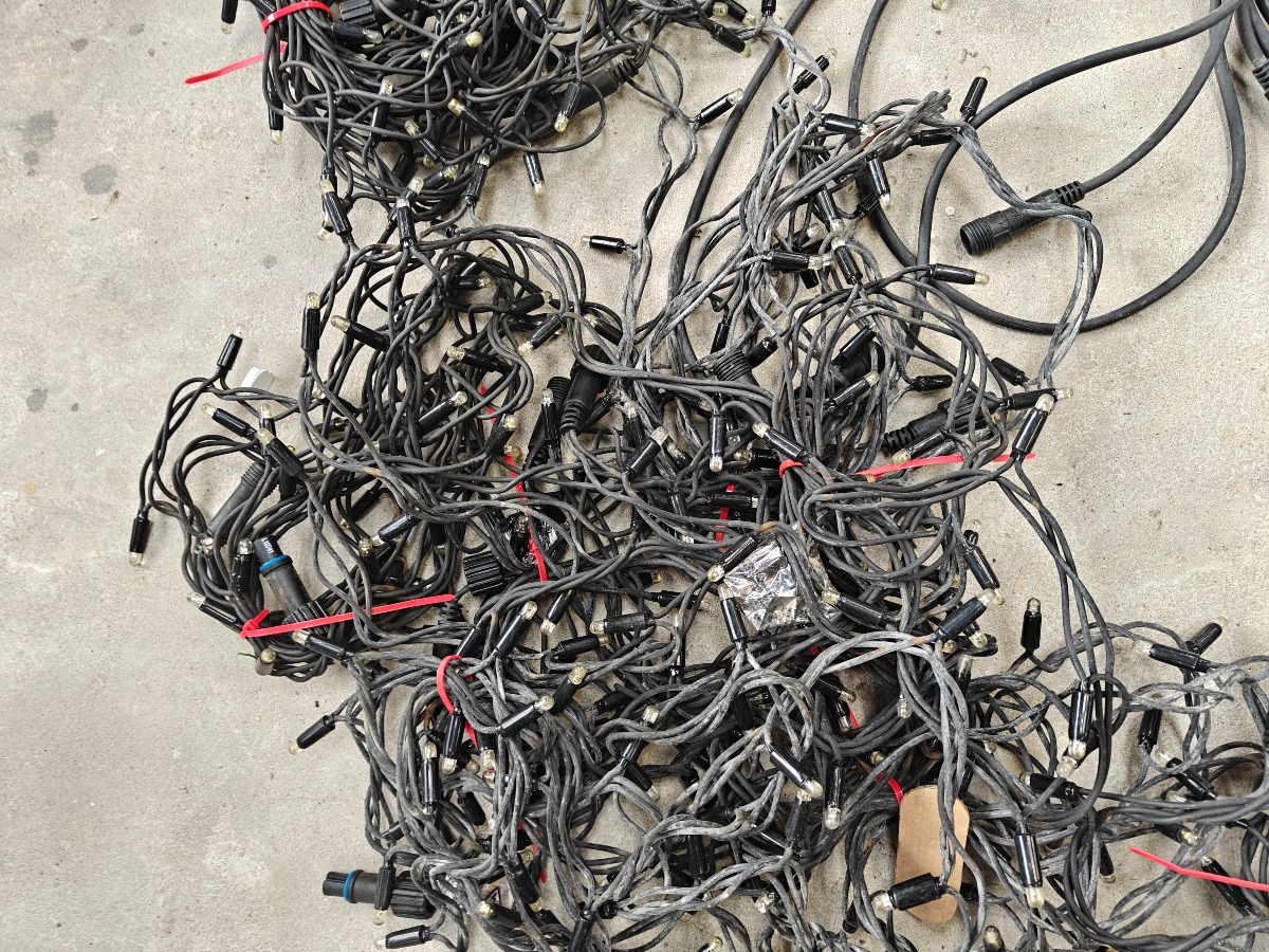 LED-lyskæder Der er mellem 40-60 meter i alt fordelt på mindre kæder. Samlet ca. 120 LED. Der skal bruges en main connector 230V. til kæderne. Denne medfølger IKKE.