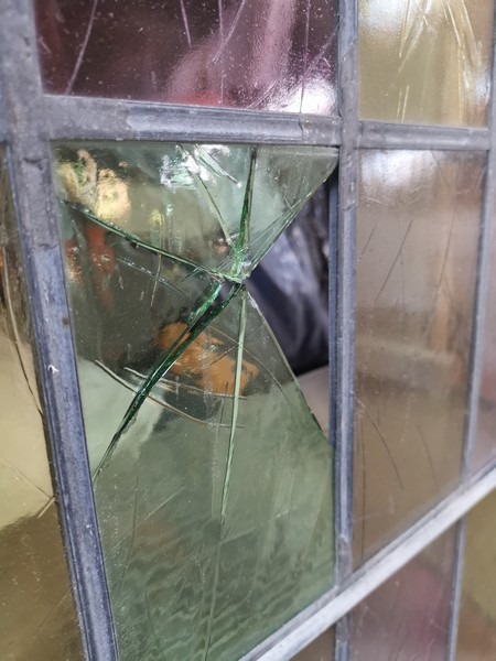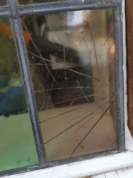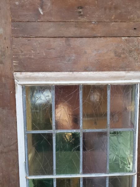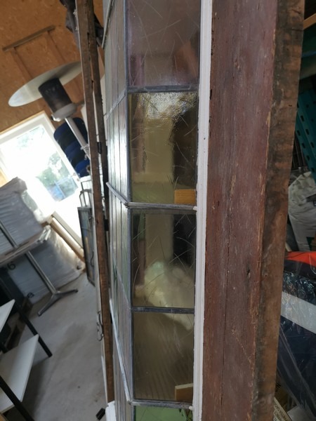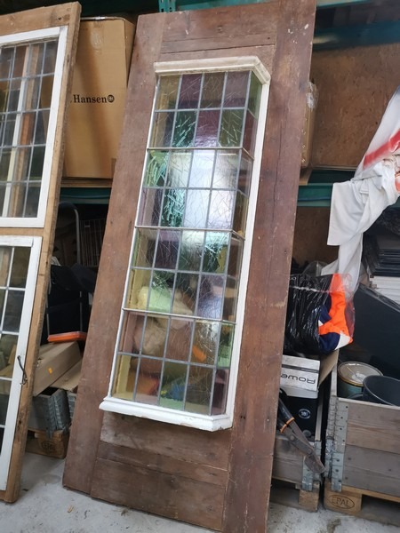 Karnap vindue, monteret på en træplade. Med flerfarvet glas, hvor noget glas er itu. Ca målene er H: 240cm, B: 93cm og tykkelse: 3cm. Af ældre dato, trænger til en kærlig hånd. Brugt.
