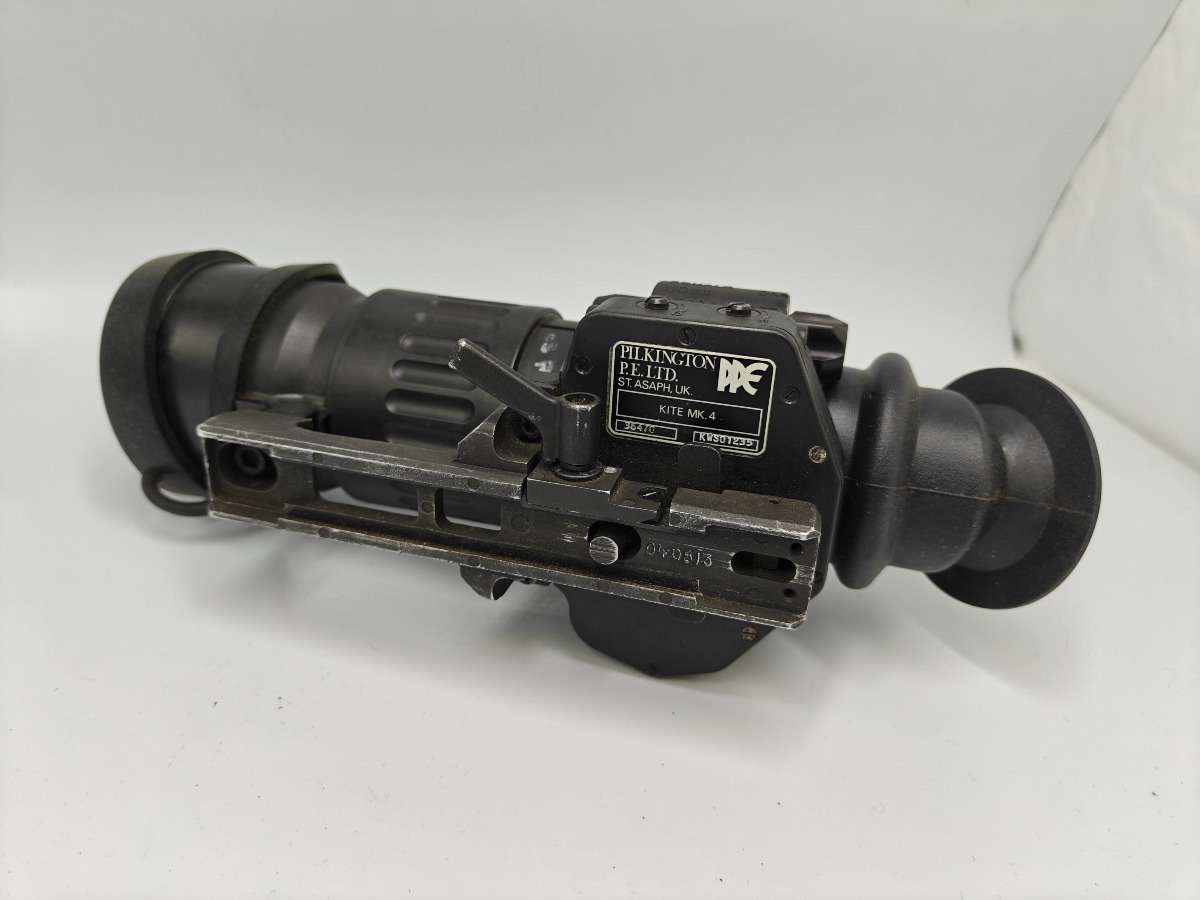 Pilkington Kite MK4 night vision sight natkikkert med slæde til montage på stativ eller våben. Opbevaringstaske medfølger. Varen er brugt, men fuld funktionsduelig.