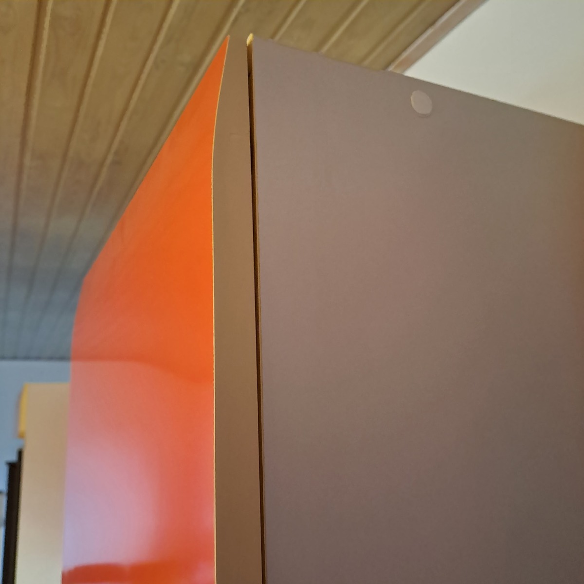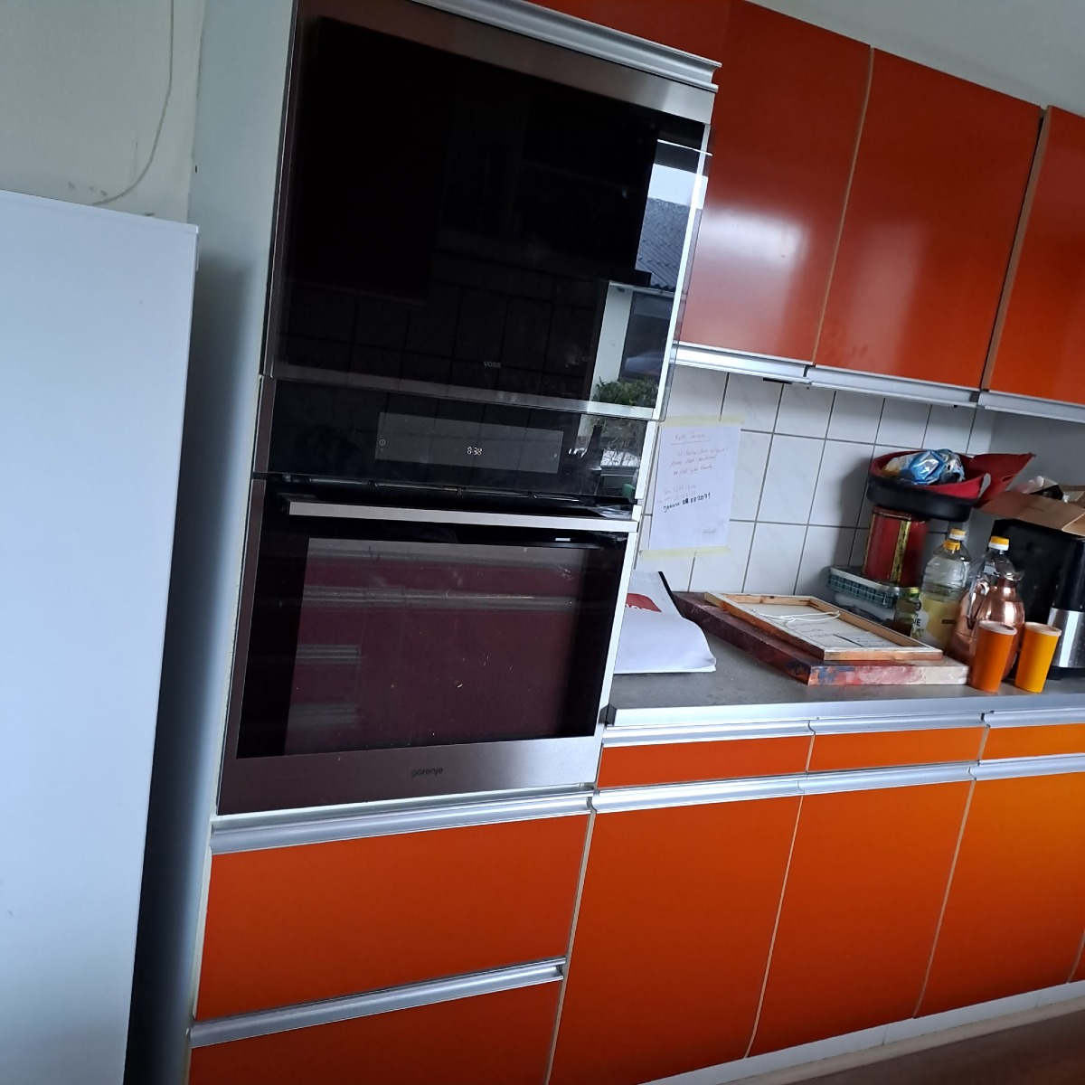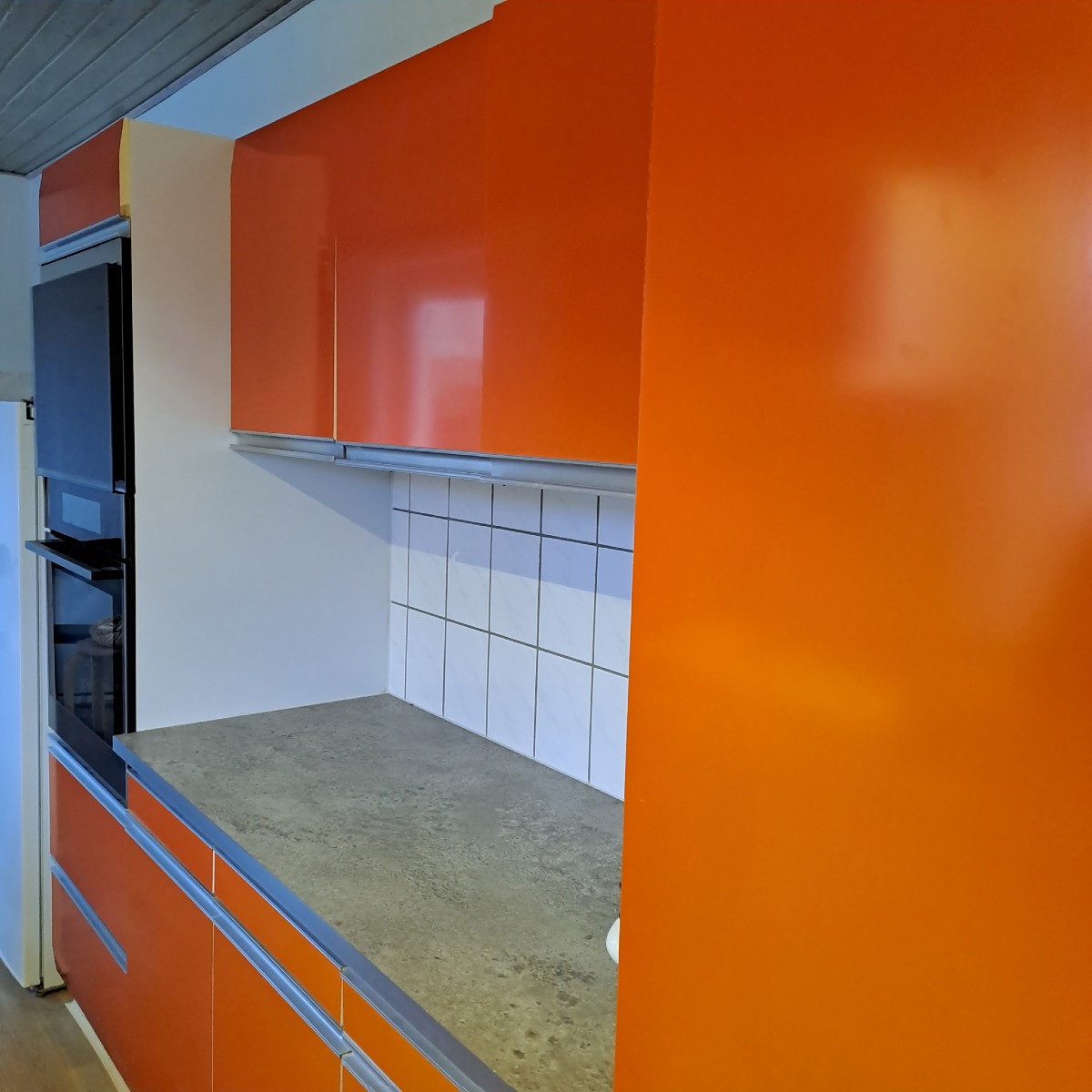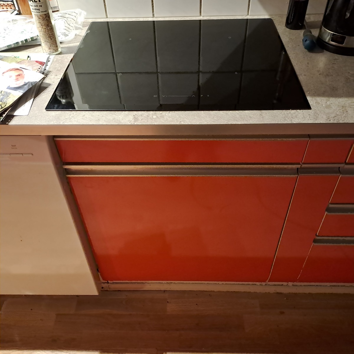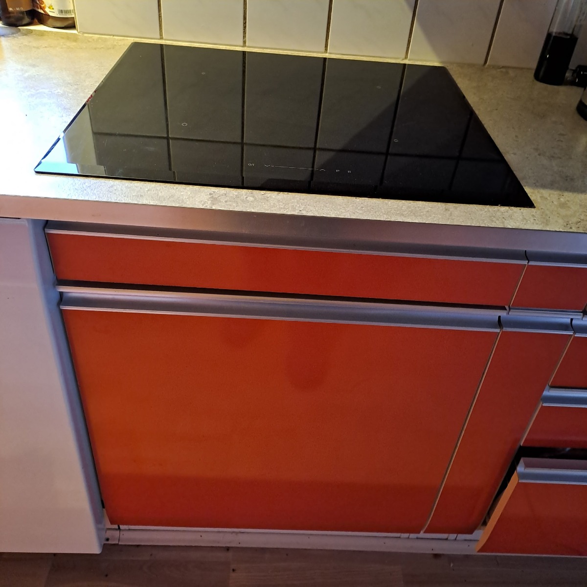 Orange køkken fra ca. 1960. Alt fungerer. Alle overflader og skabe fremstår meget velholdte, kun med minimalt slid og brugsspor. Alt taget i betragtning er standen bemærkelsesværdig. Ovn, opvaskemaskine, induktionskogeplade virker.
